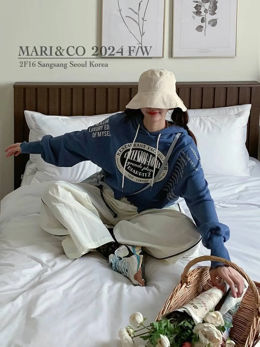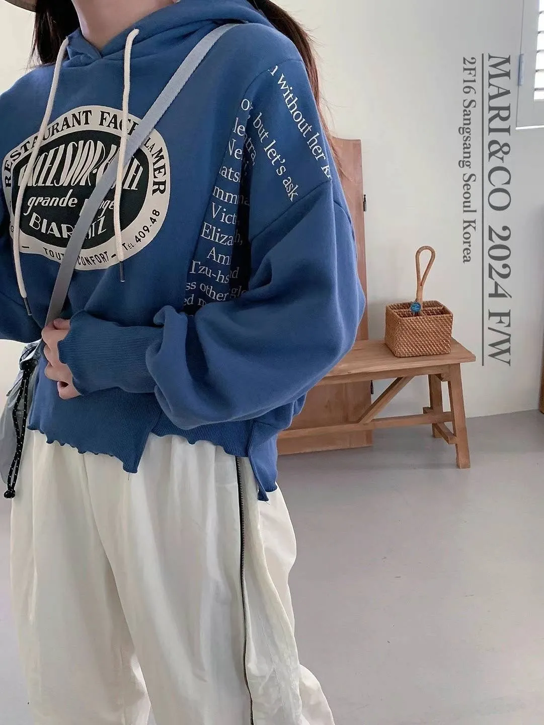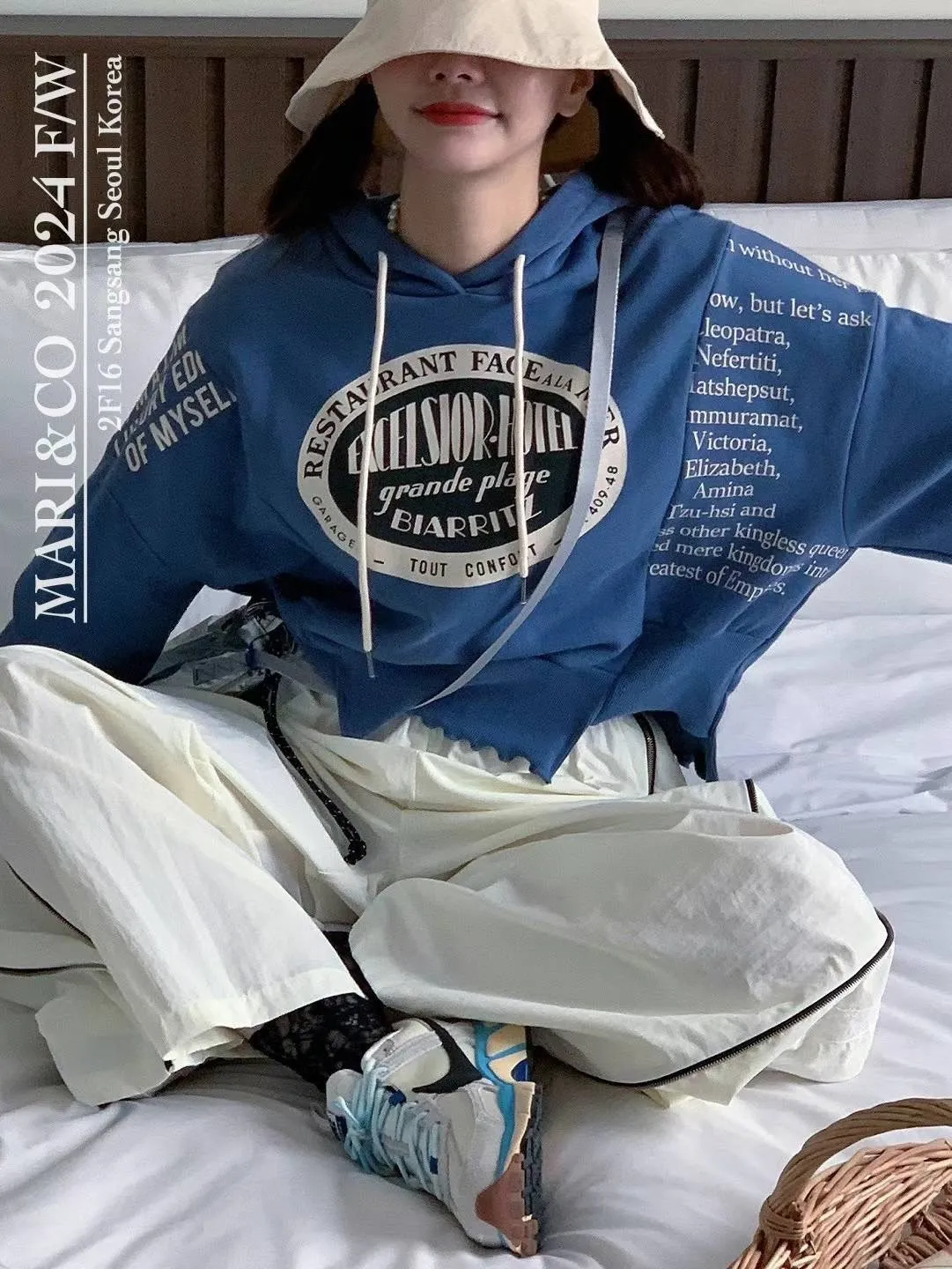 LV615特價復古英文圈圈連帽上衣 米 藍 特價$590