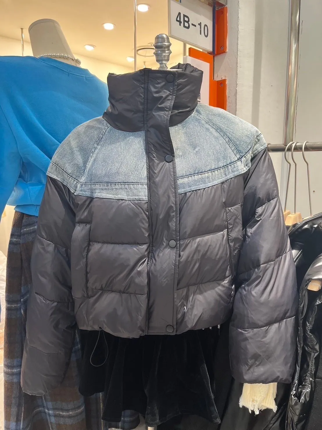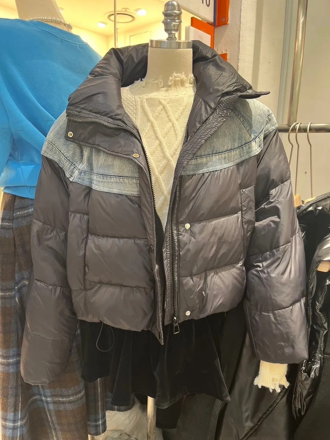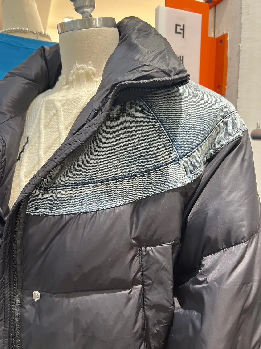 鴨絨90% 拉鍊穿脫 側腰抽繩 有口袋 上肩牛仔拼接
