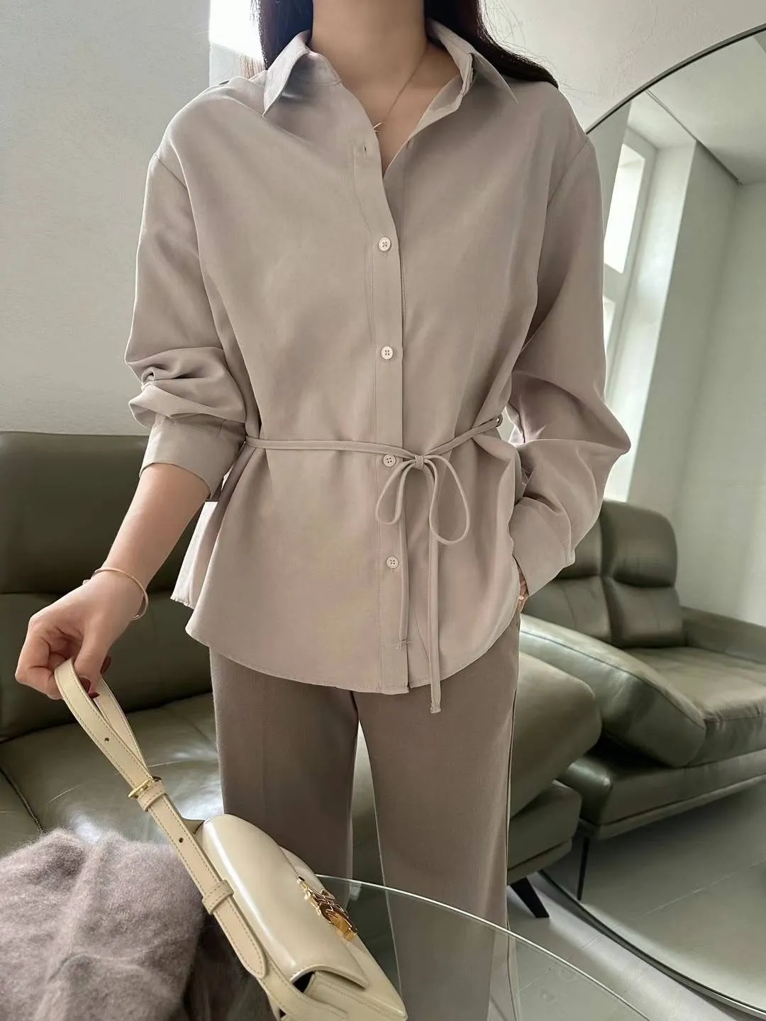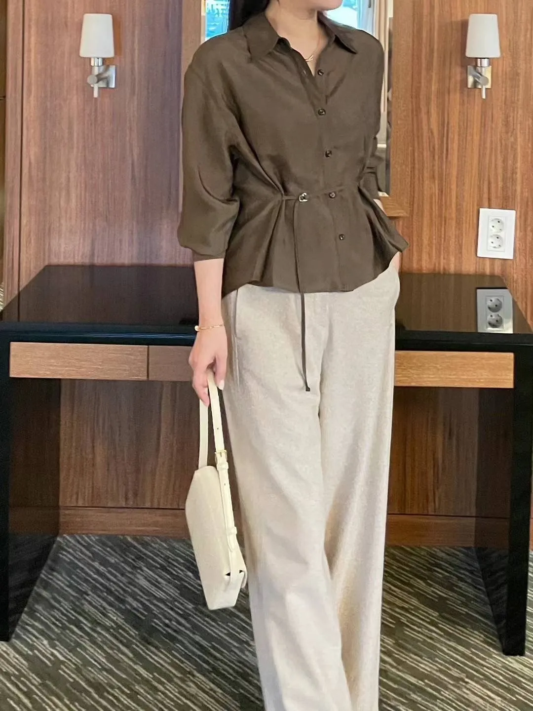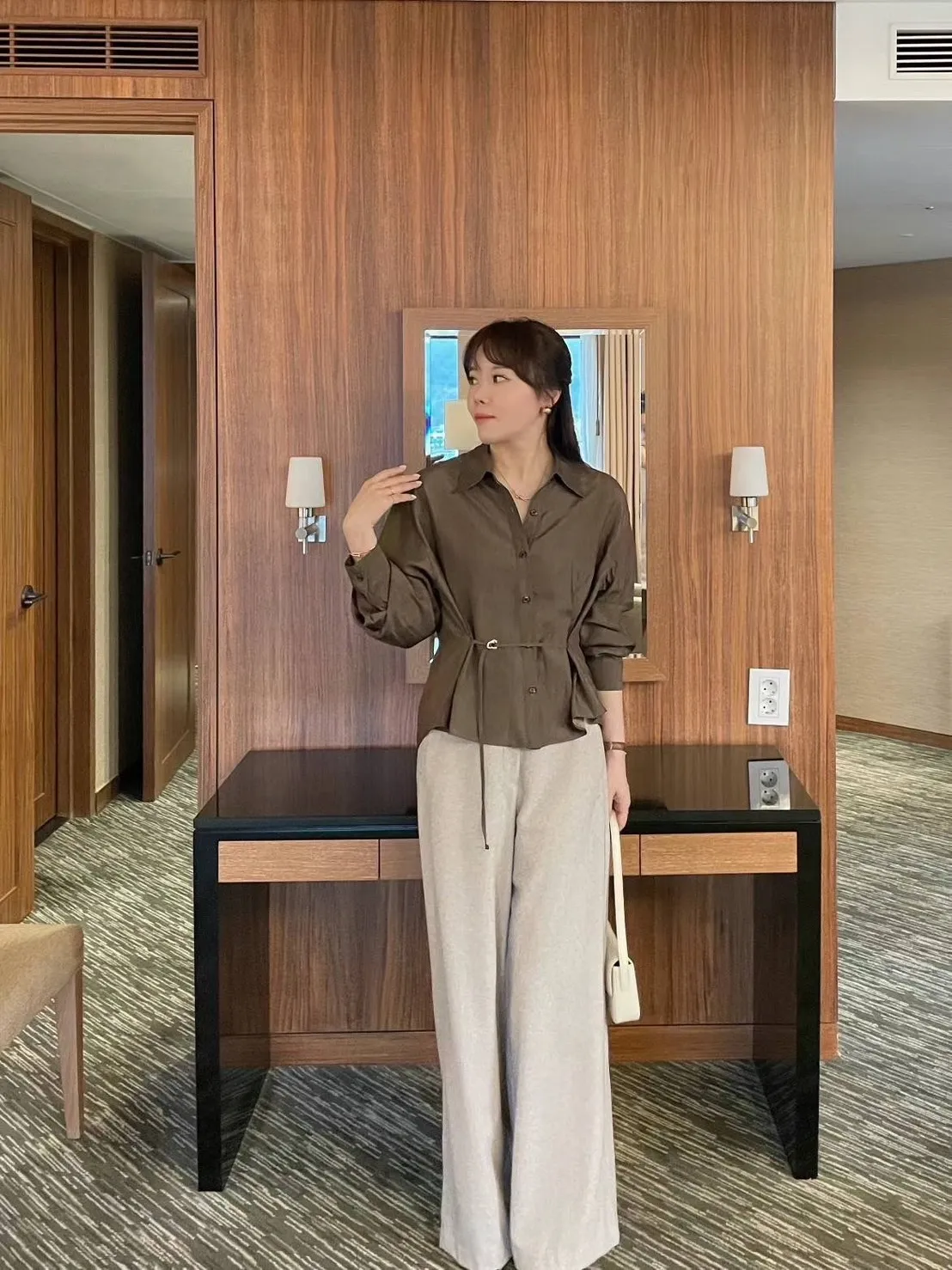 光澤貝殼扣 前短後長 腰綁帶 後開岔 前後排扣