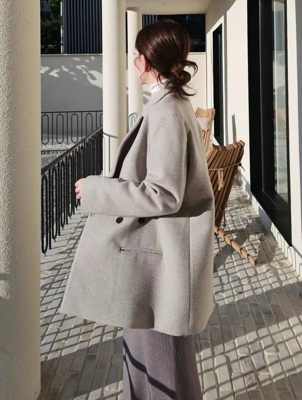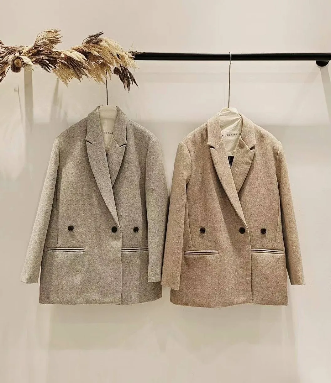 30%羊毛+聚酯+壓克力 微墊肩 有內裡 微長版版型 大衣式西裝外套