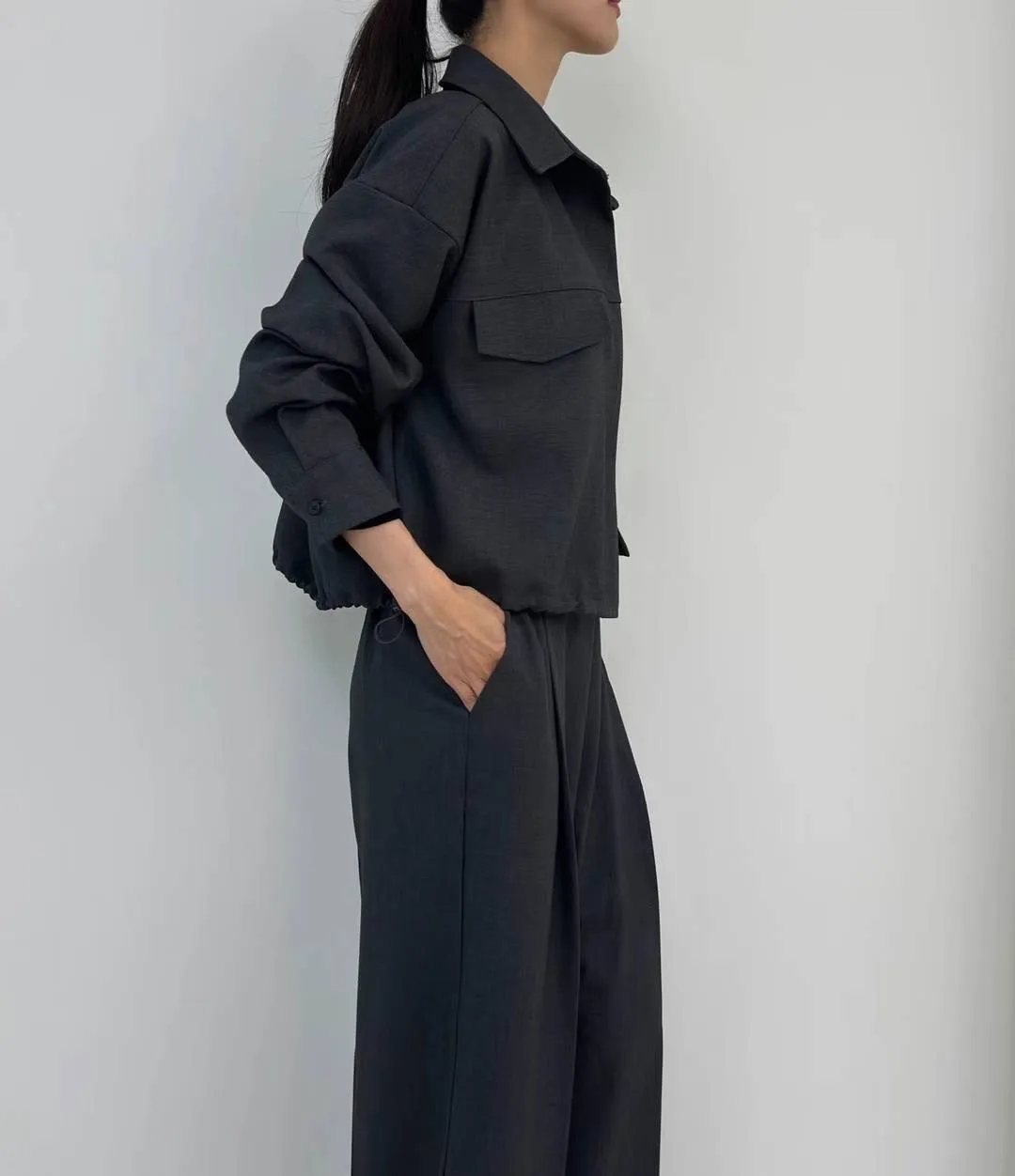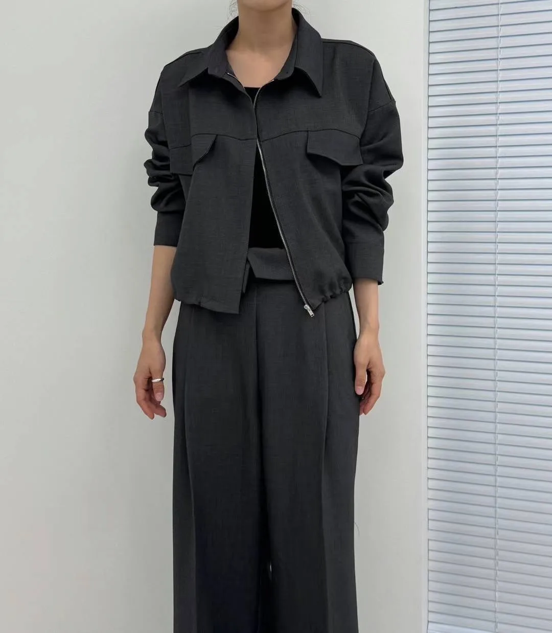西裝面料 高級視覺 非常薄款 有內裡 拉鍊穿脫 無口袋 下擺抽繩