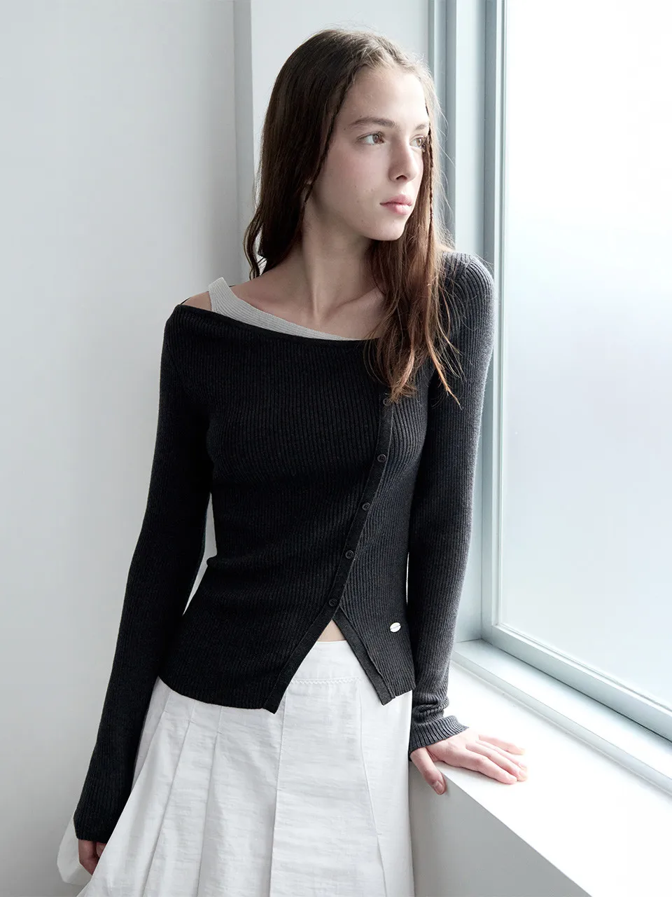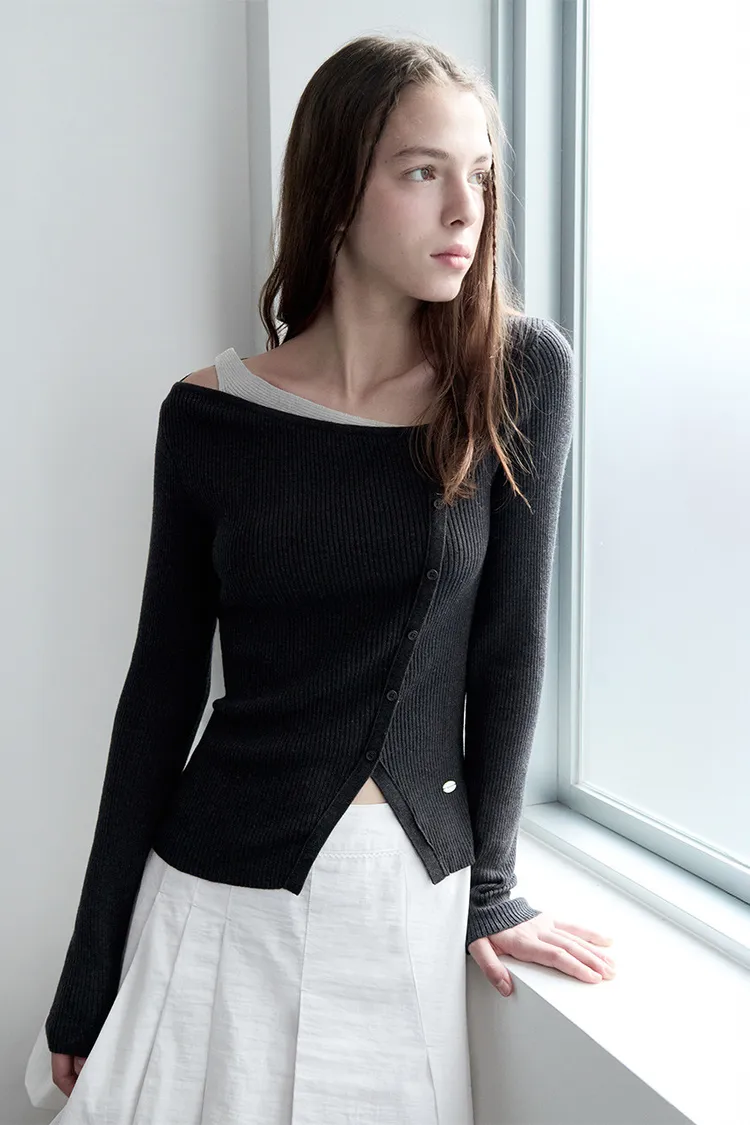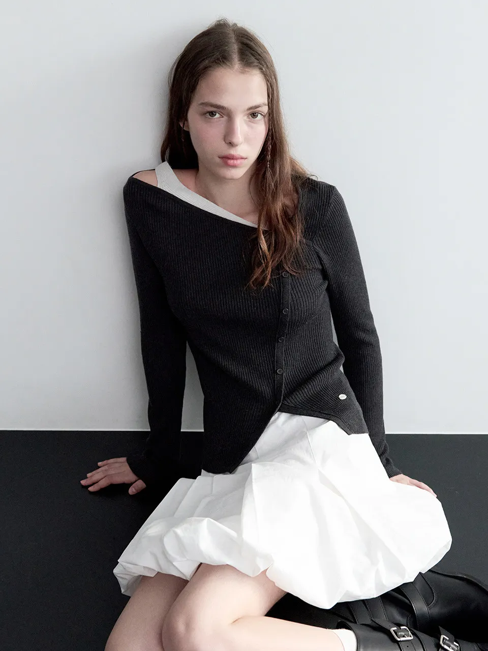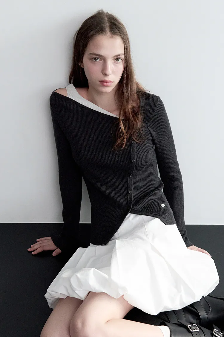 羊毛4%+聚酯+尼龍+壓克力 造型斜領口 腰身剪裁 有彈性 假兩件層次