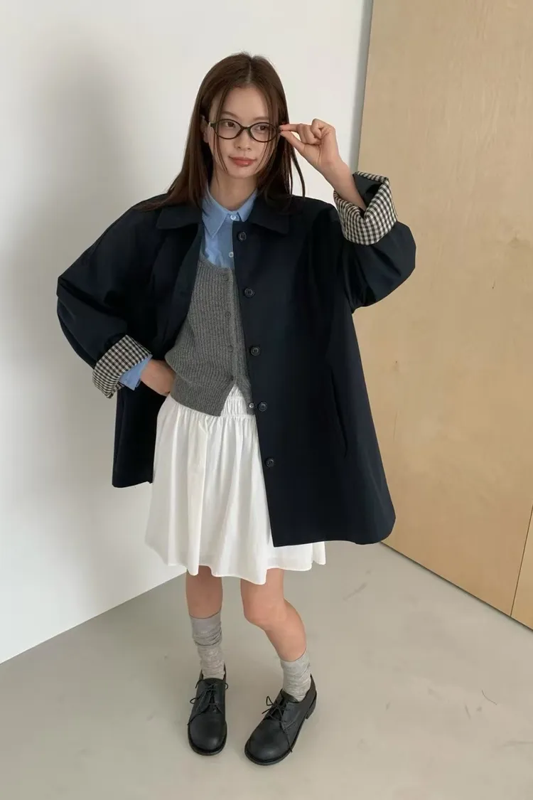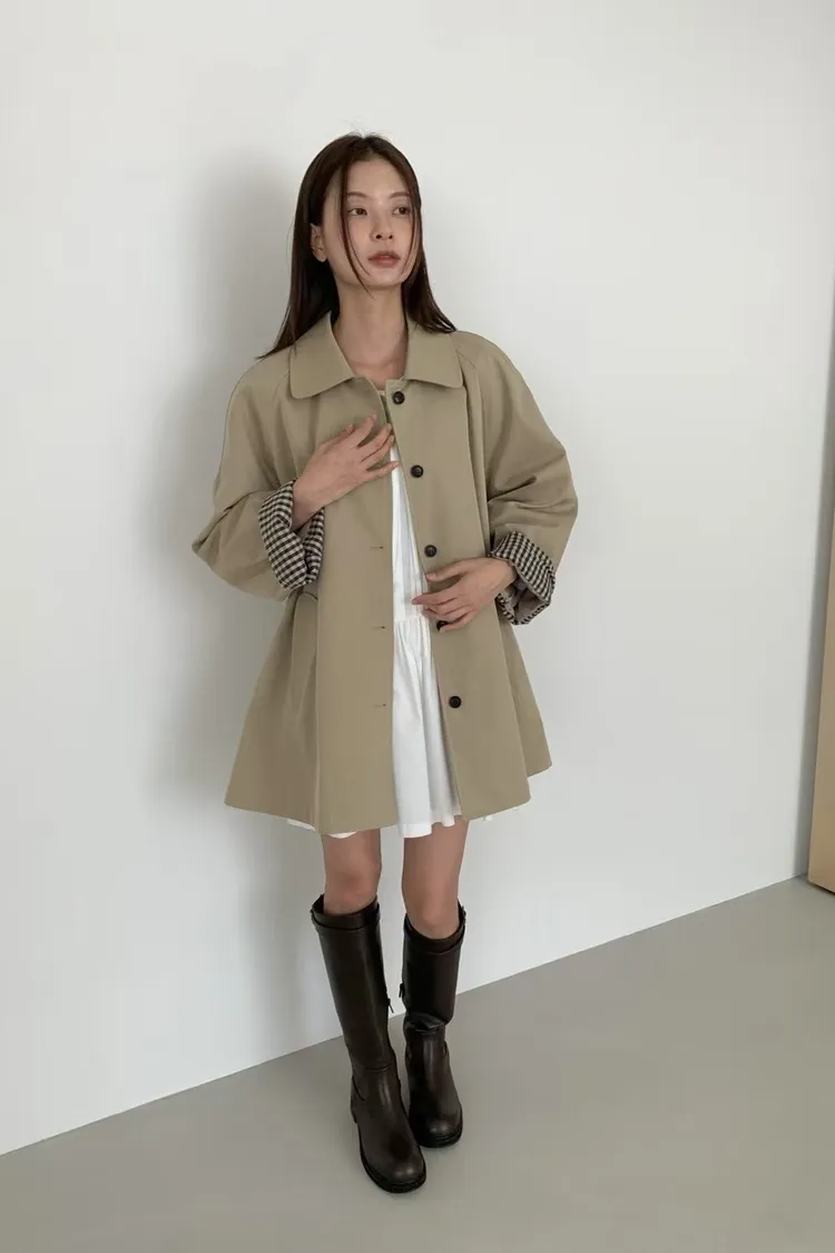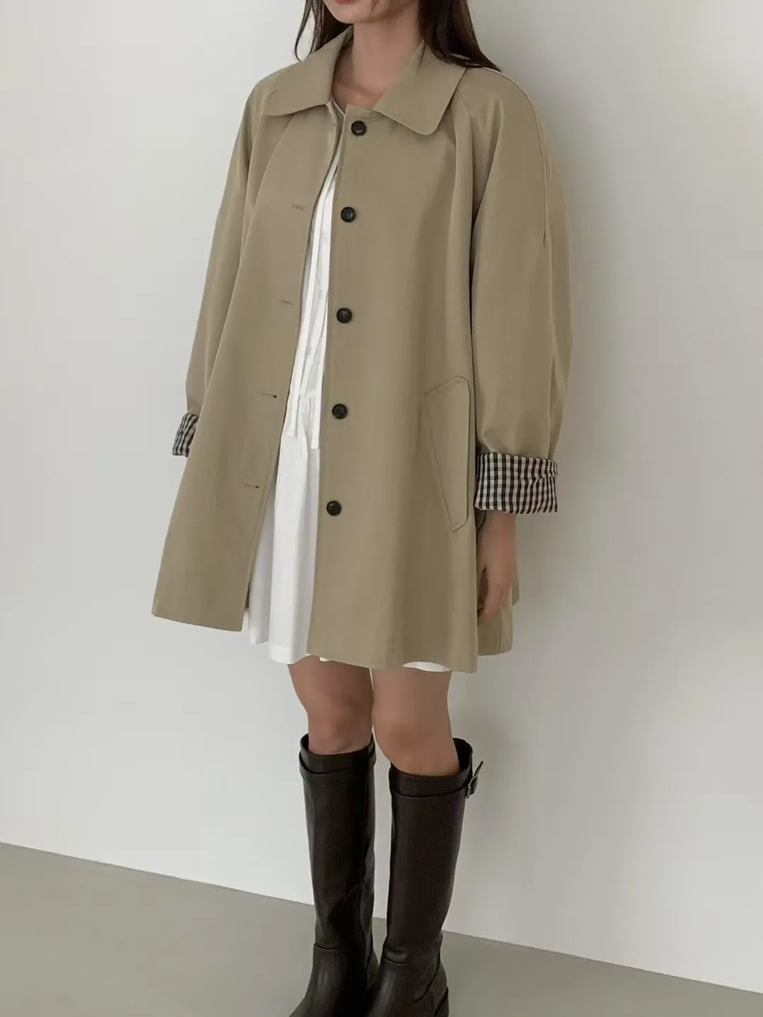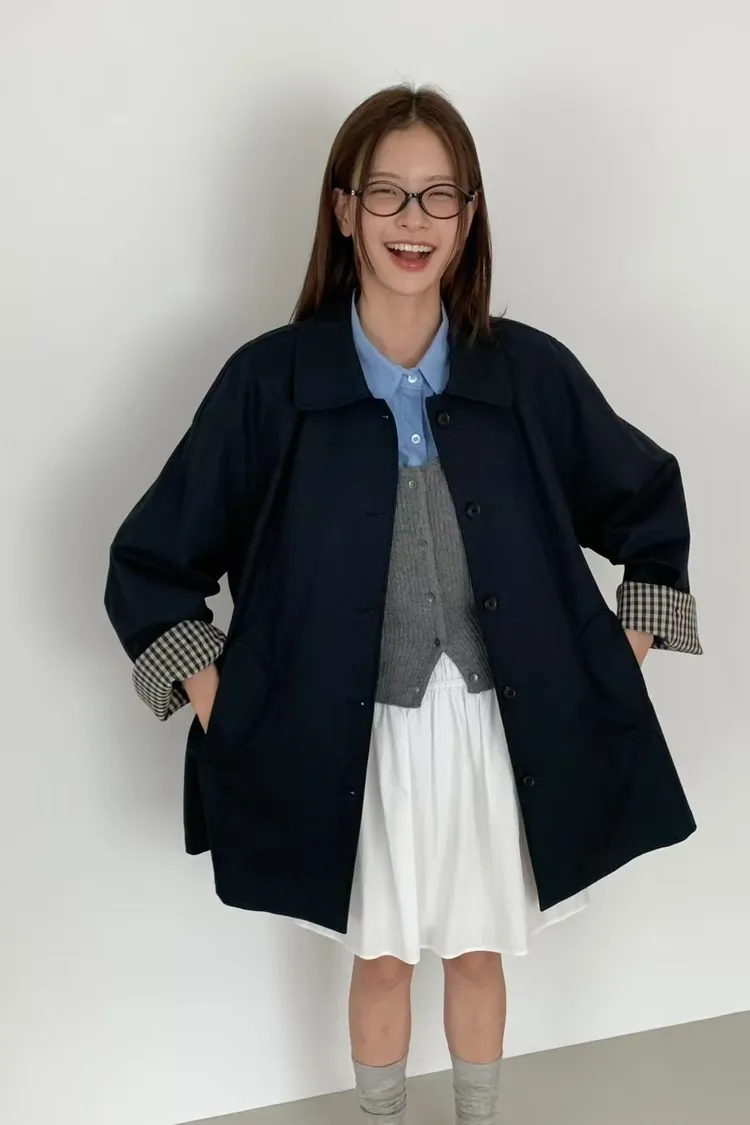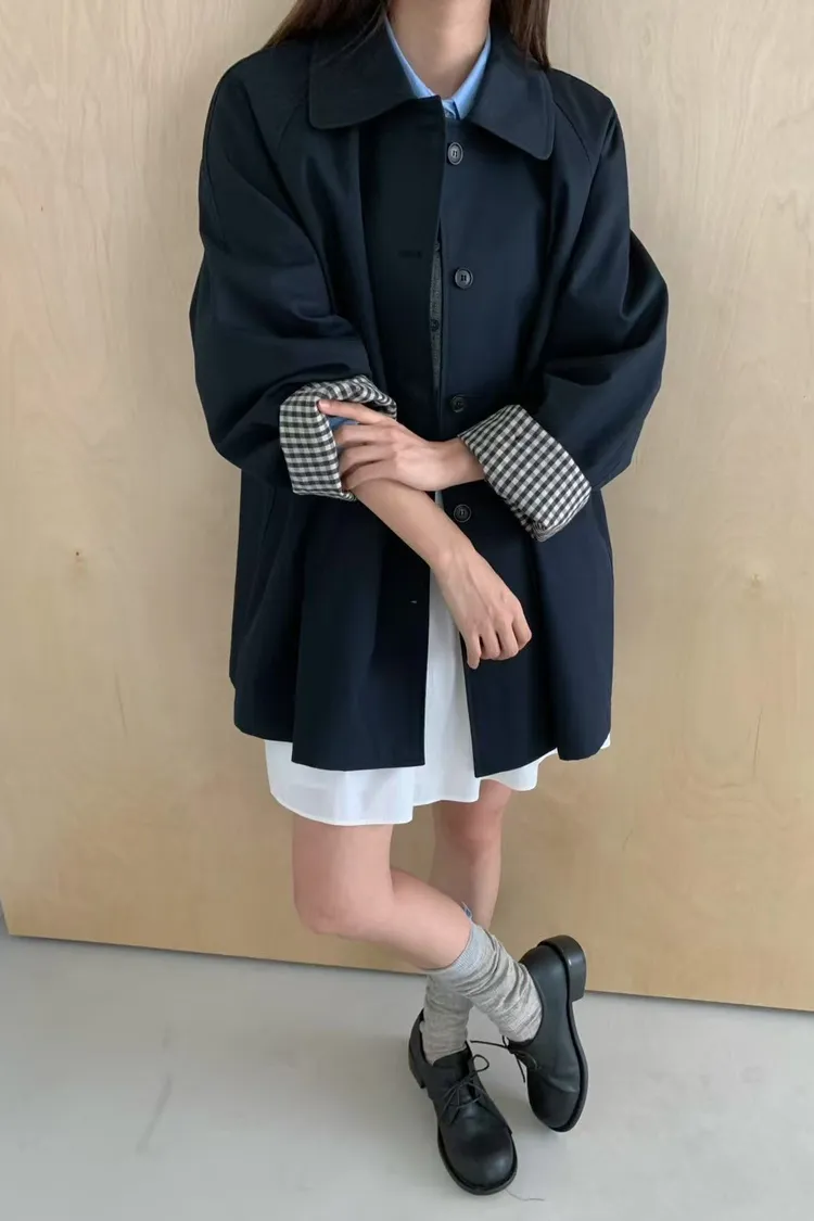 棉+聚酯 圓翻領 反摺袖格紋 立體口袋 排釦穿脫 立體剪裁