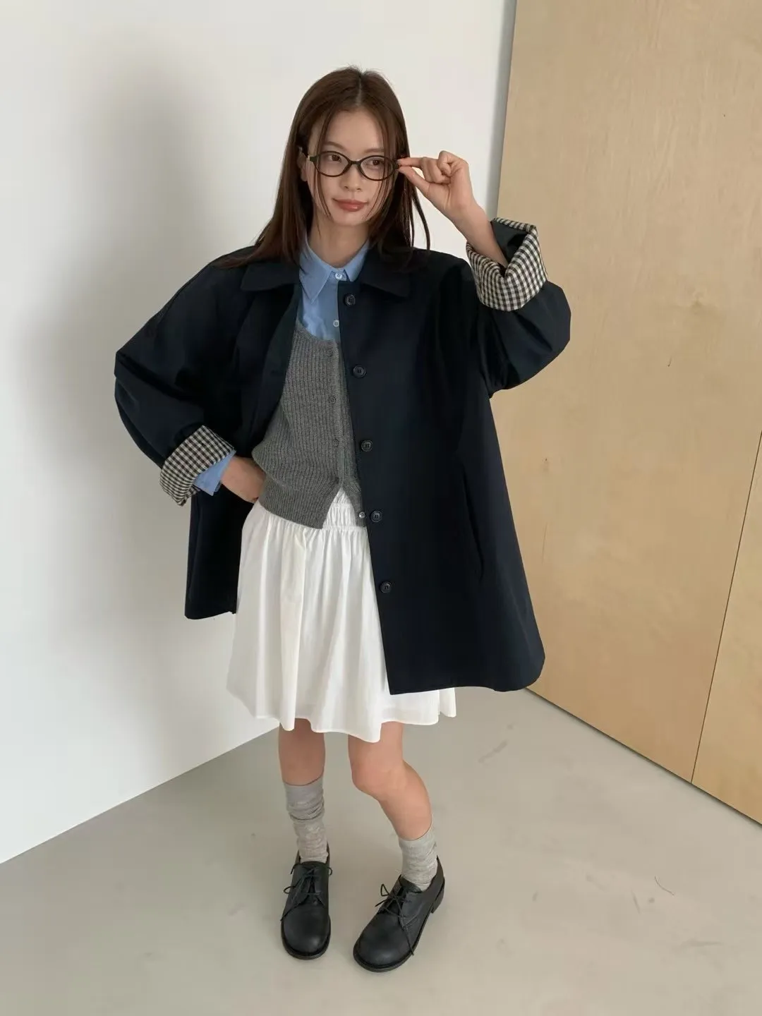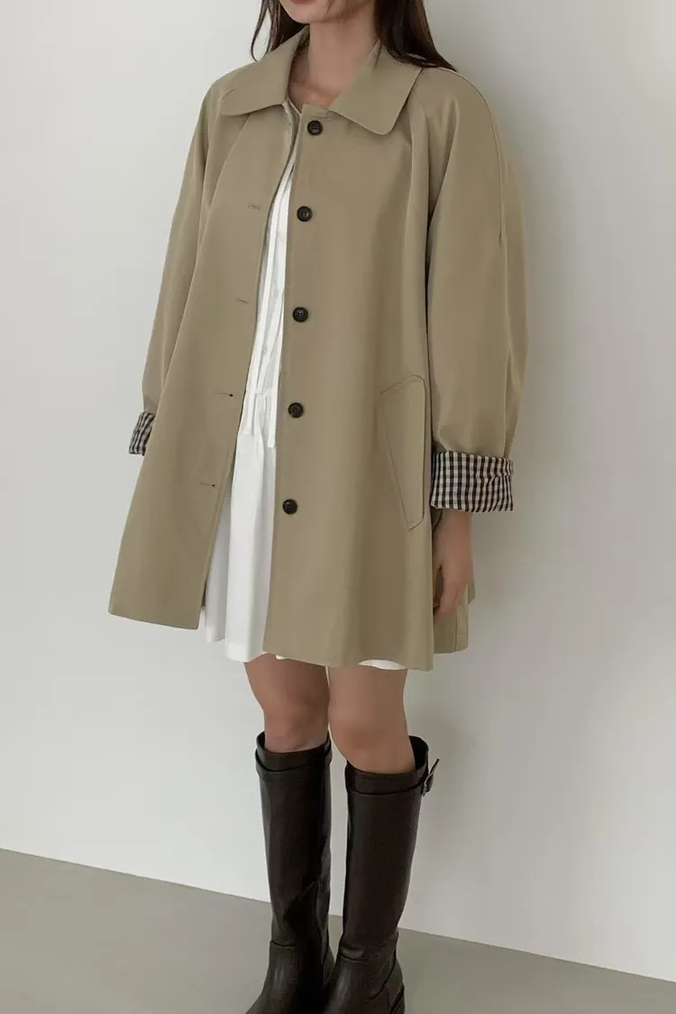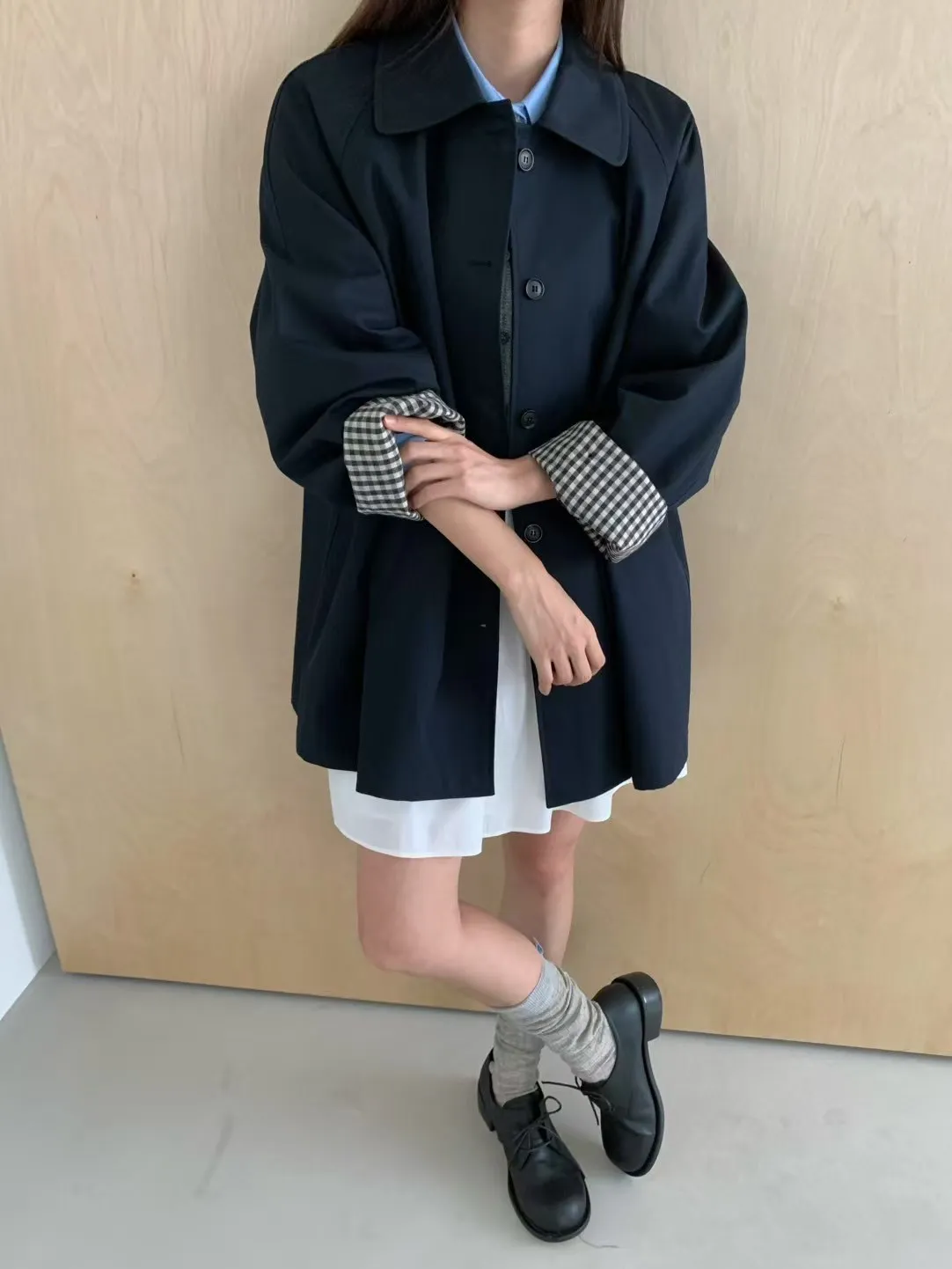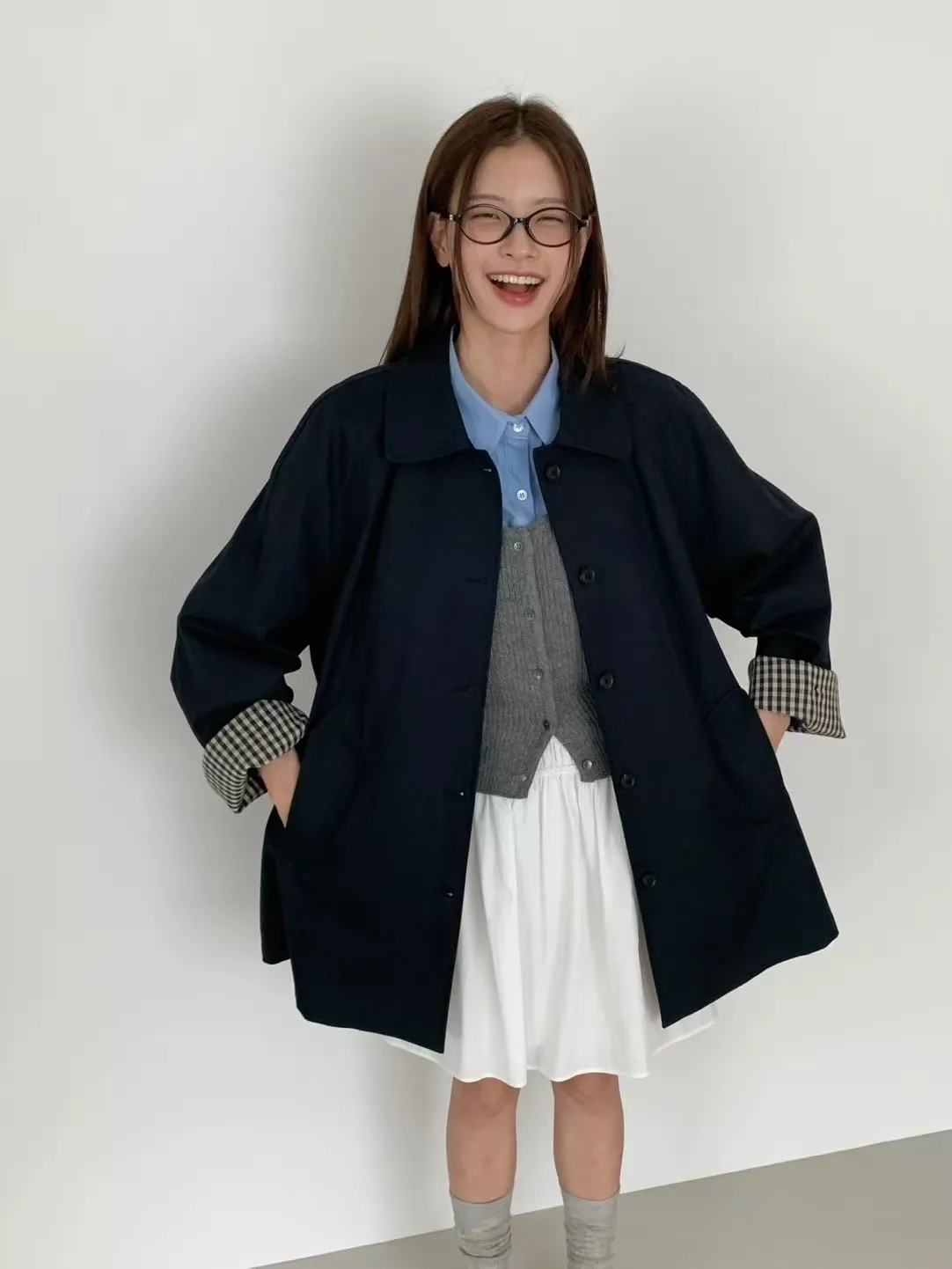 棉+聚酯 圓翻領 反摺袖格紋 立體口袋 排釦穿脫 立體剪裁