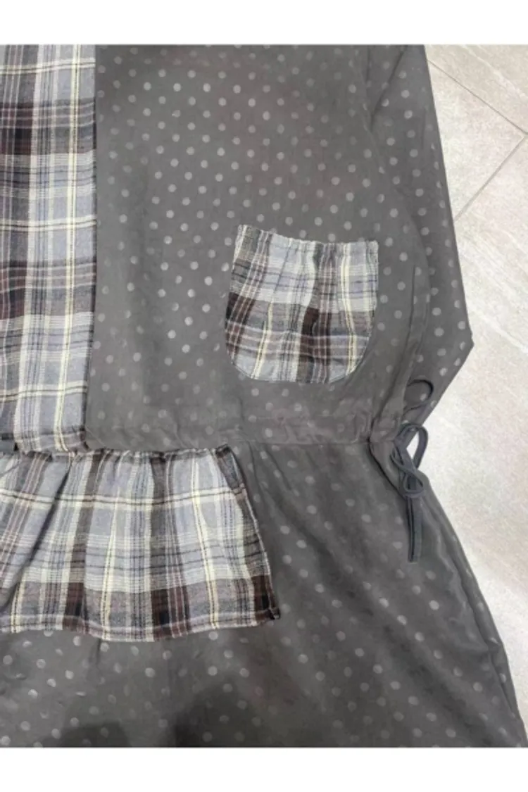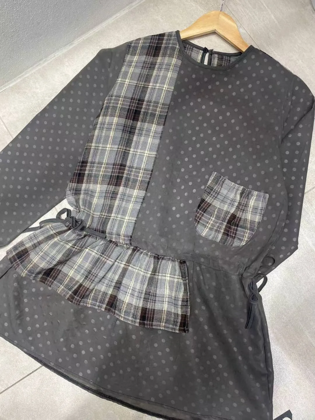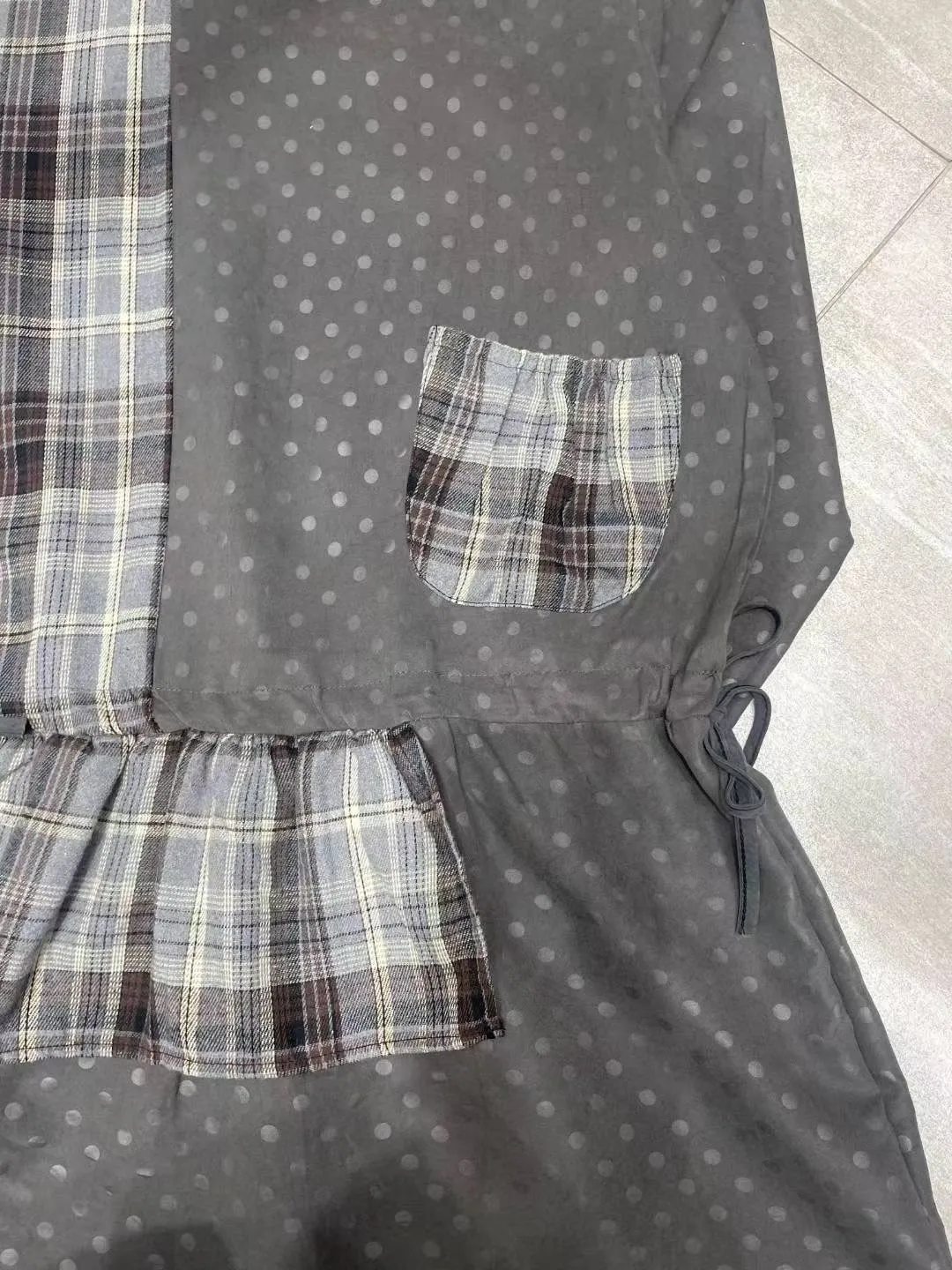 棉+聚酯 後頸釦穿脫 腰有綁繩 灰色有點點 領口包邊 胸前口袋