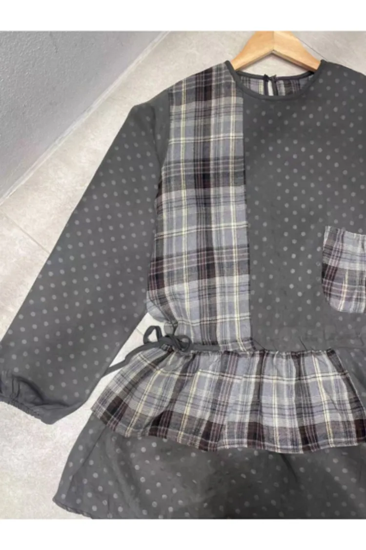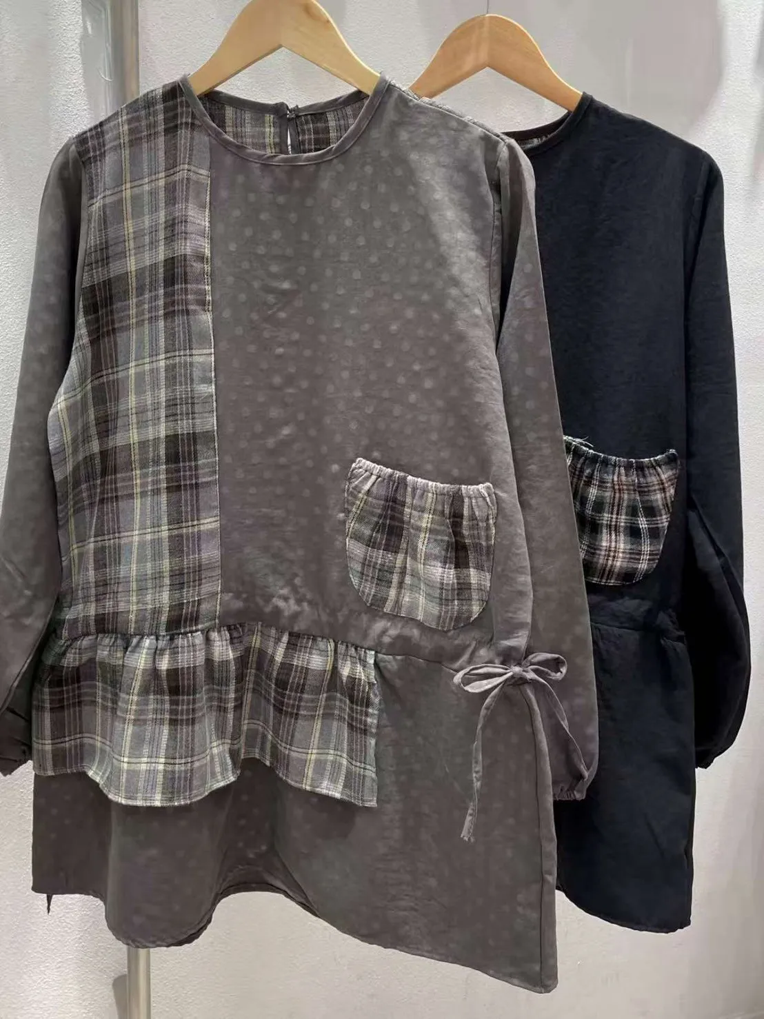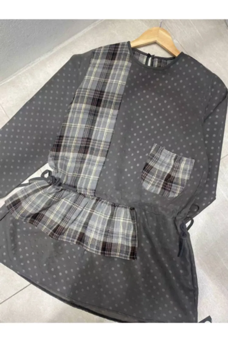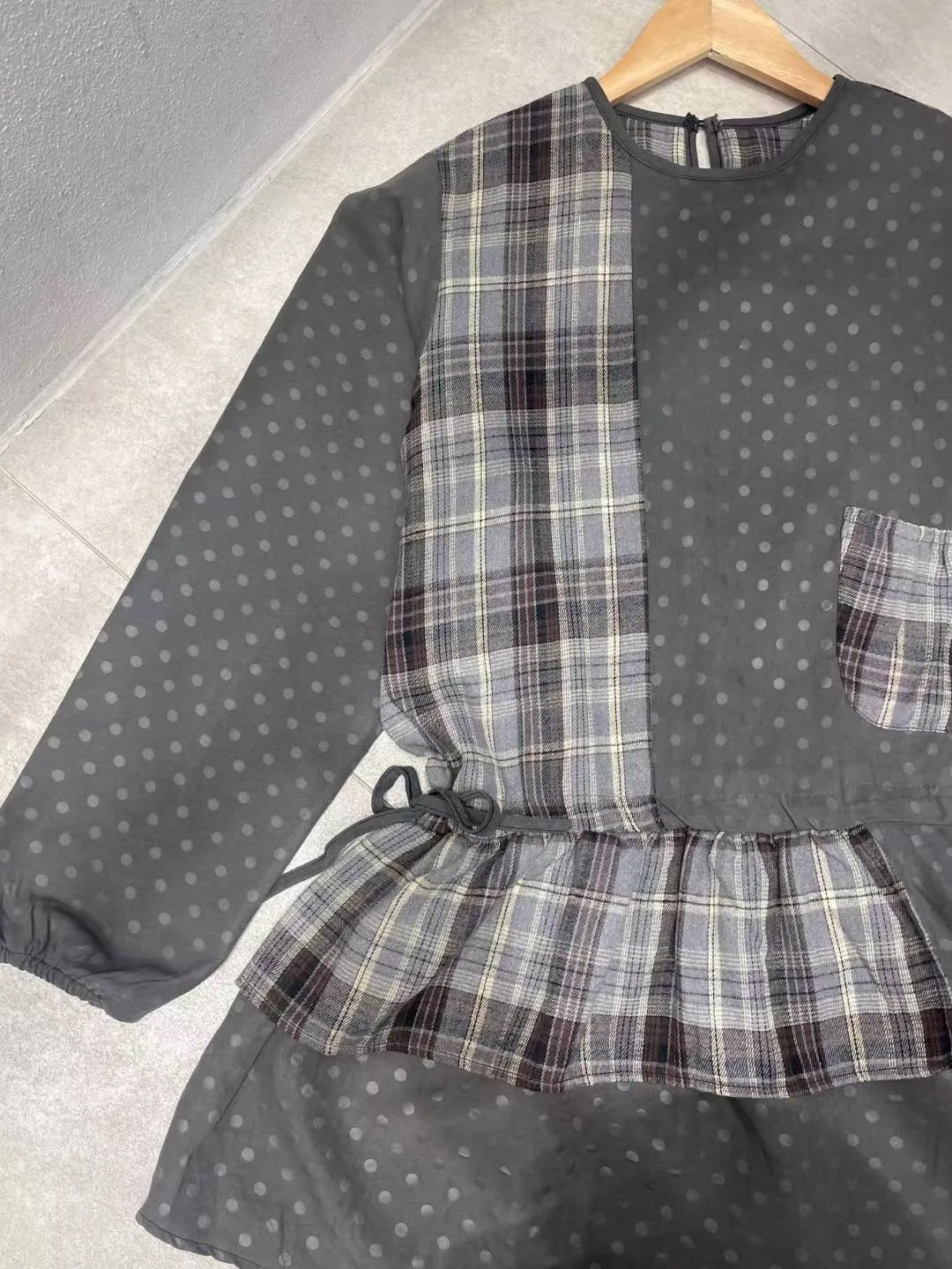 棉+聚酯 後頸釦穿脫 腰有綁繩 灰色有點點 領口包邊 胸前口袋