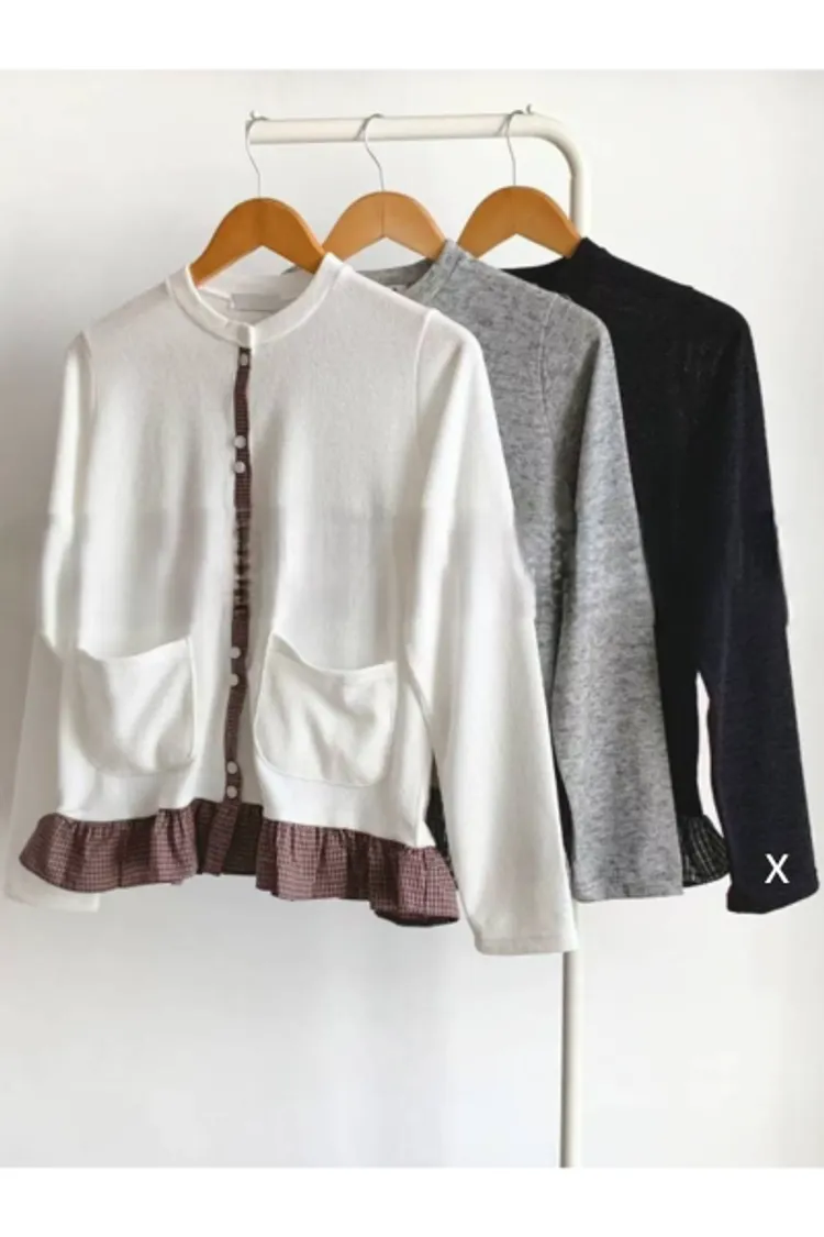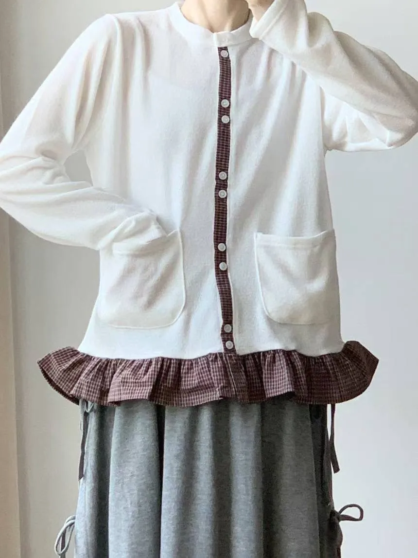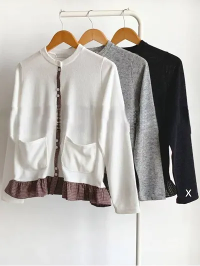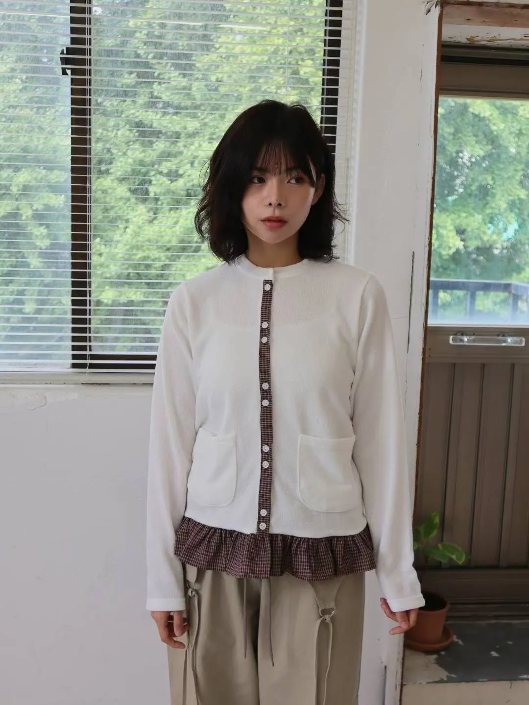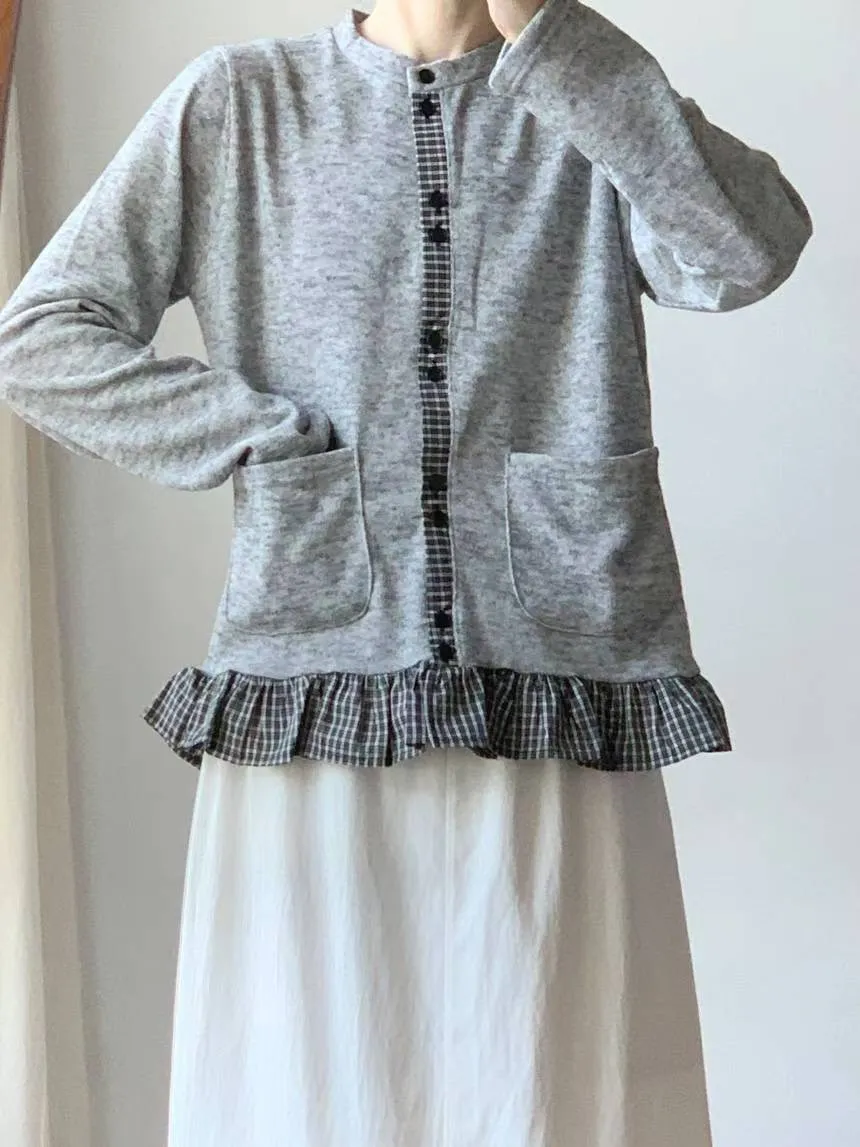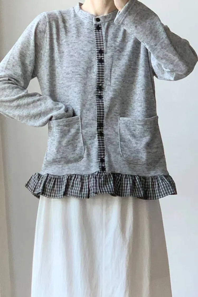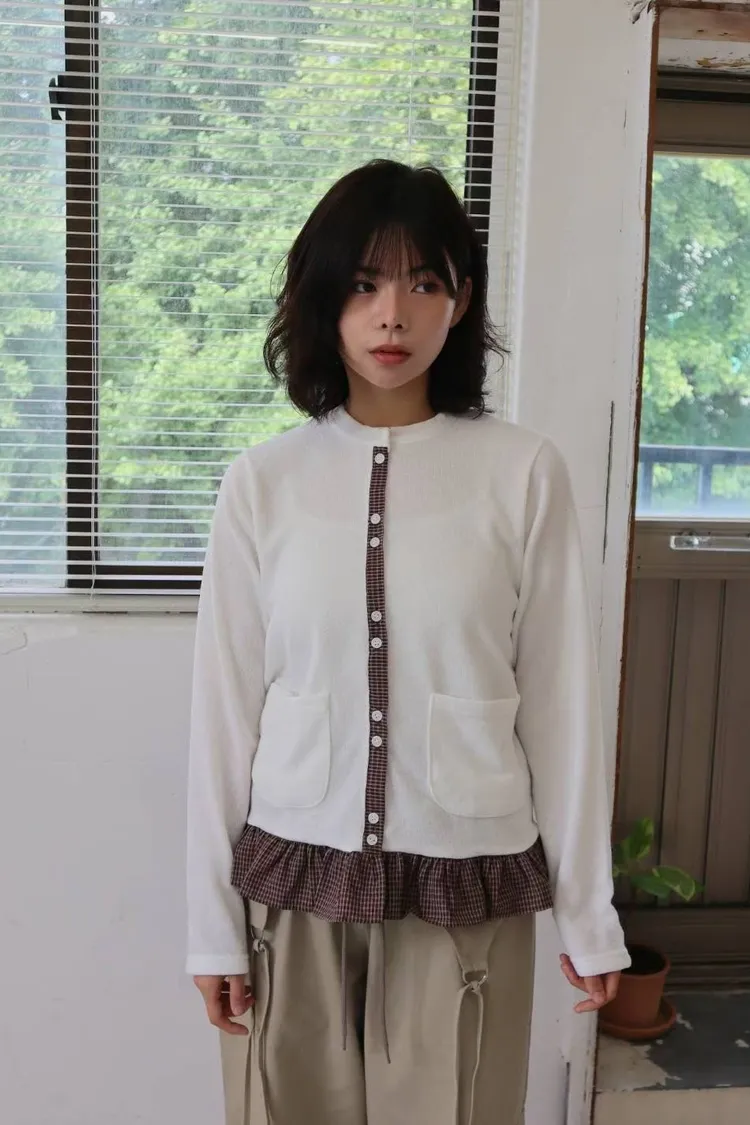 棉 細緻格紋拼接 雙口袋 荷葉下擺 排釦穿脫 秋天款厚度