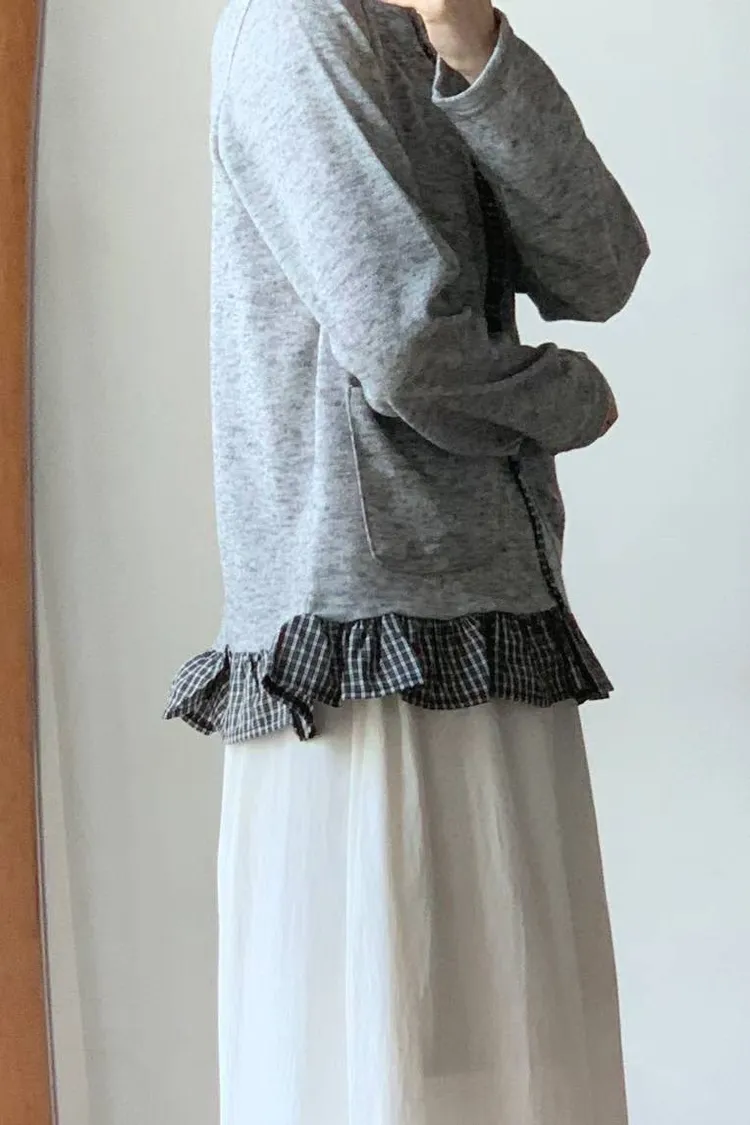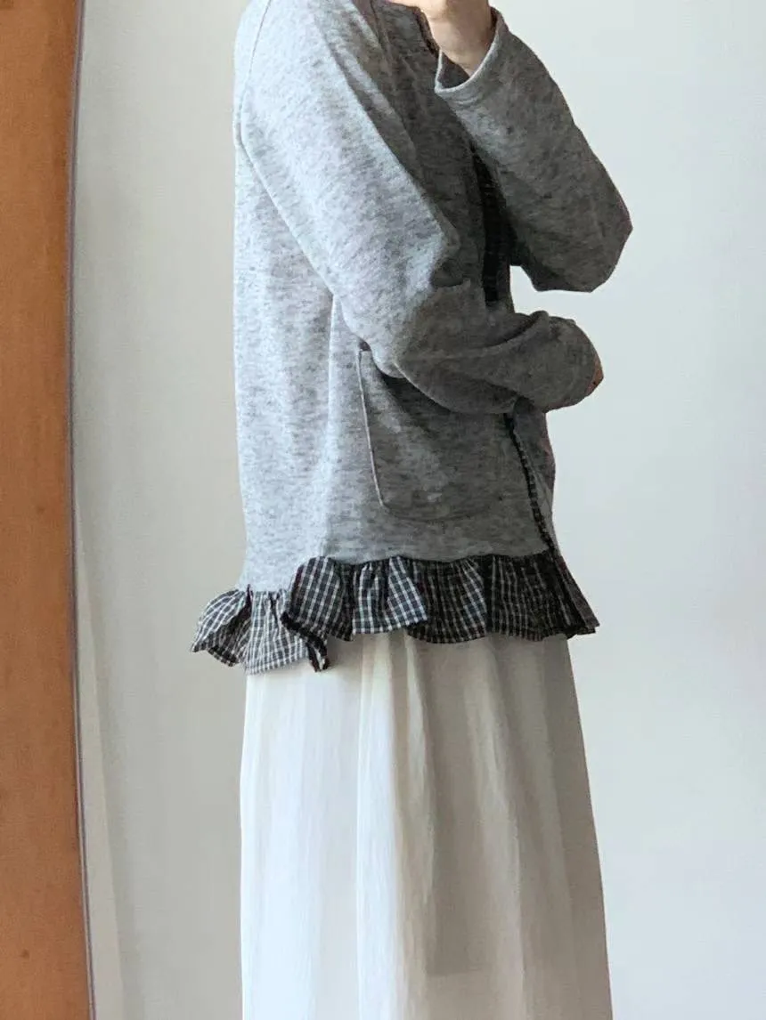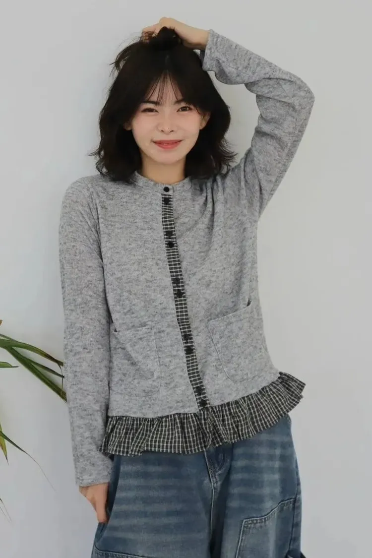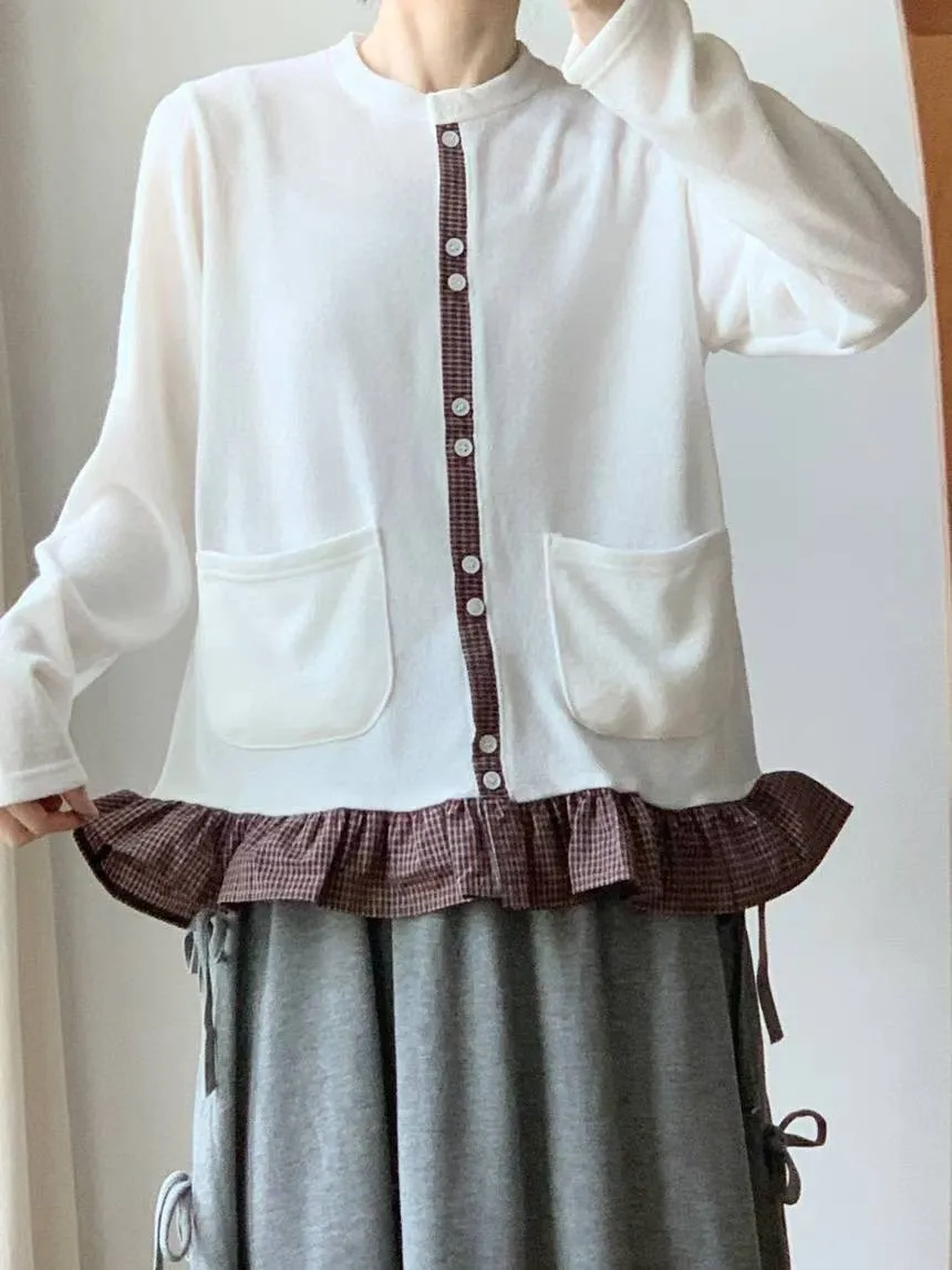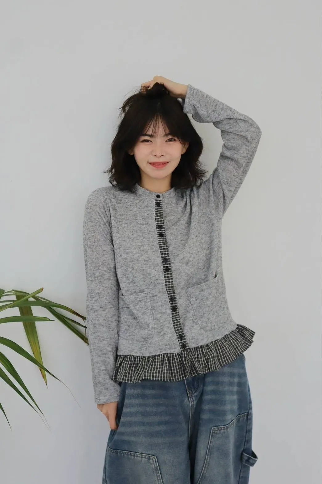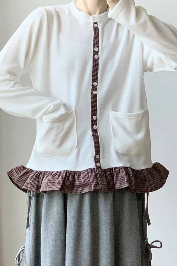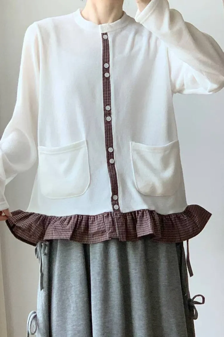 棉 細緻格紋拼接 雙口袋 荷葉下擺 排釦穿脫 秋天款厚度