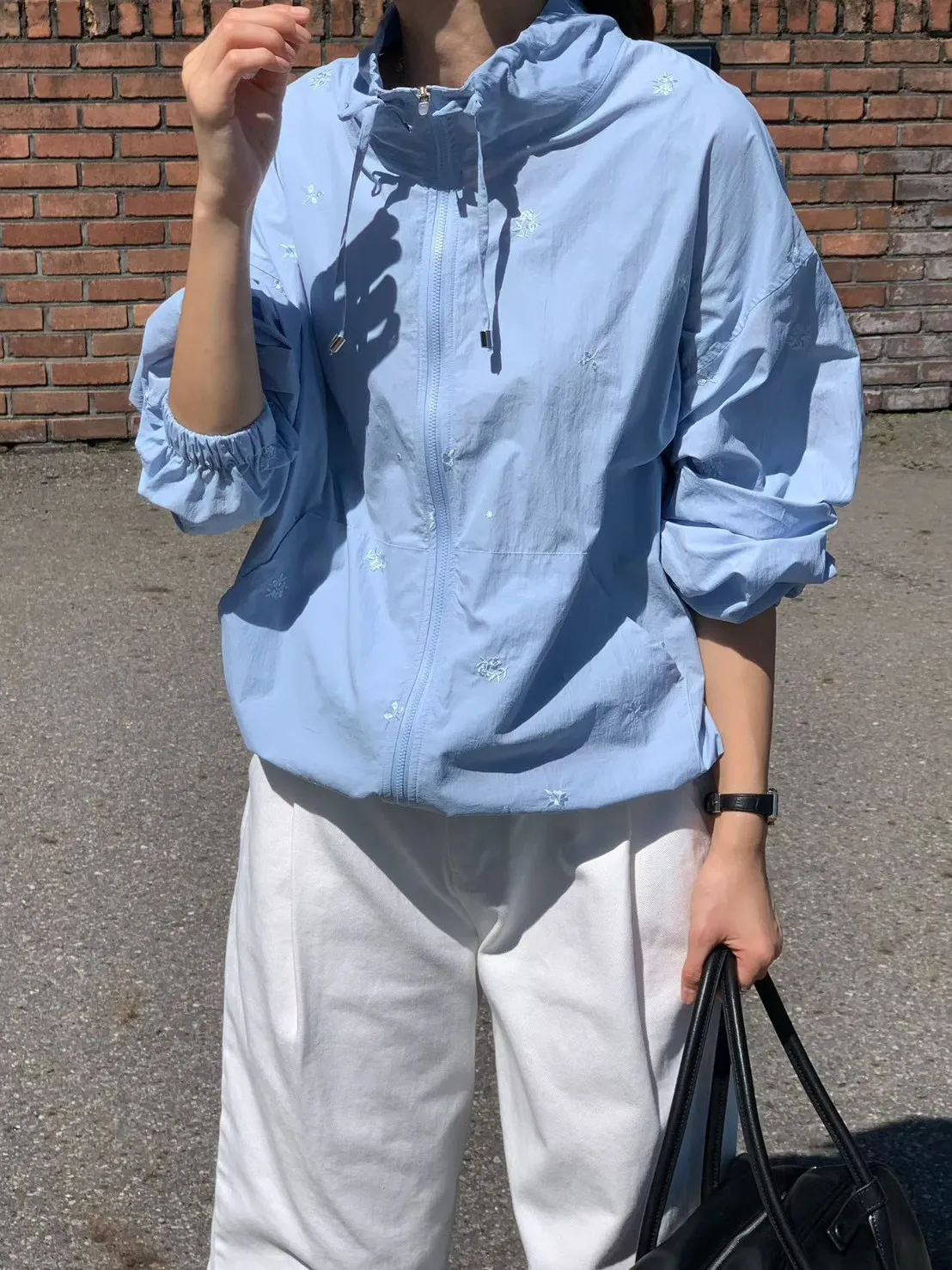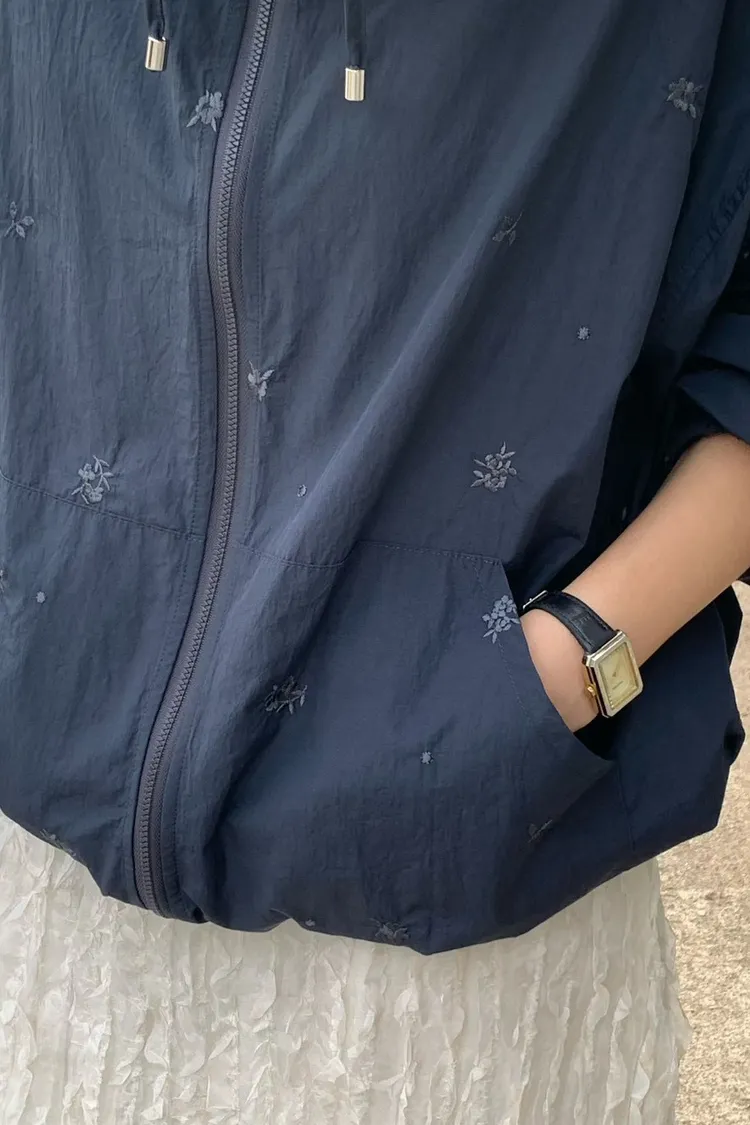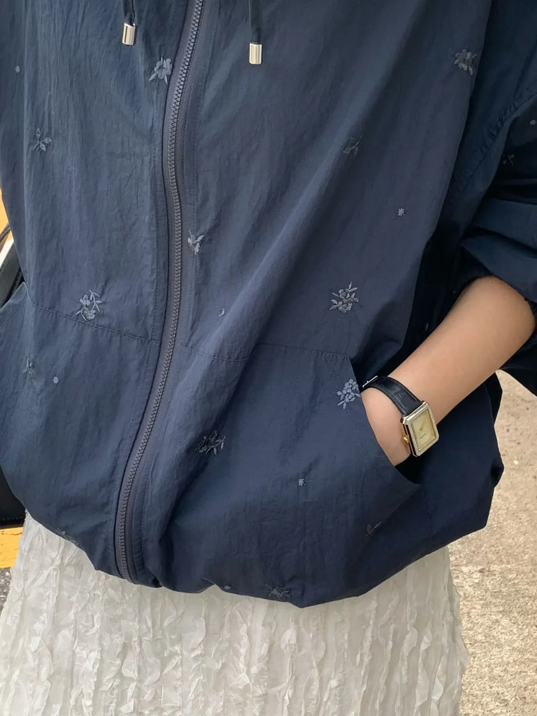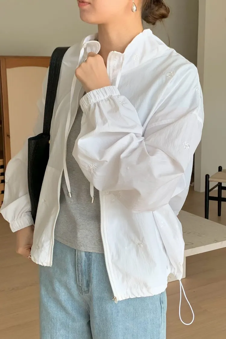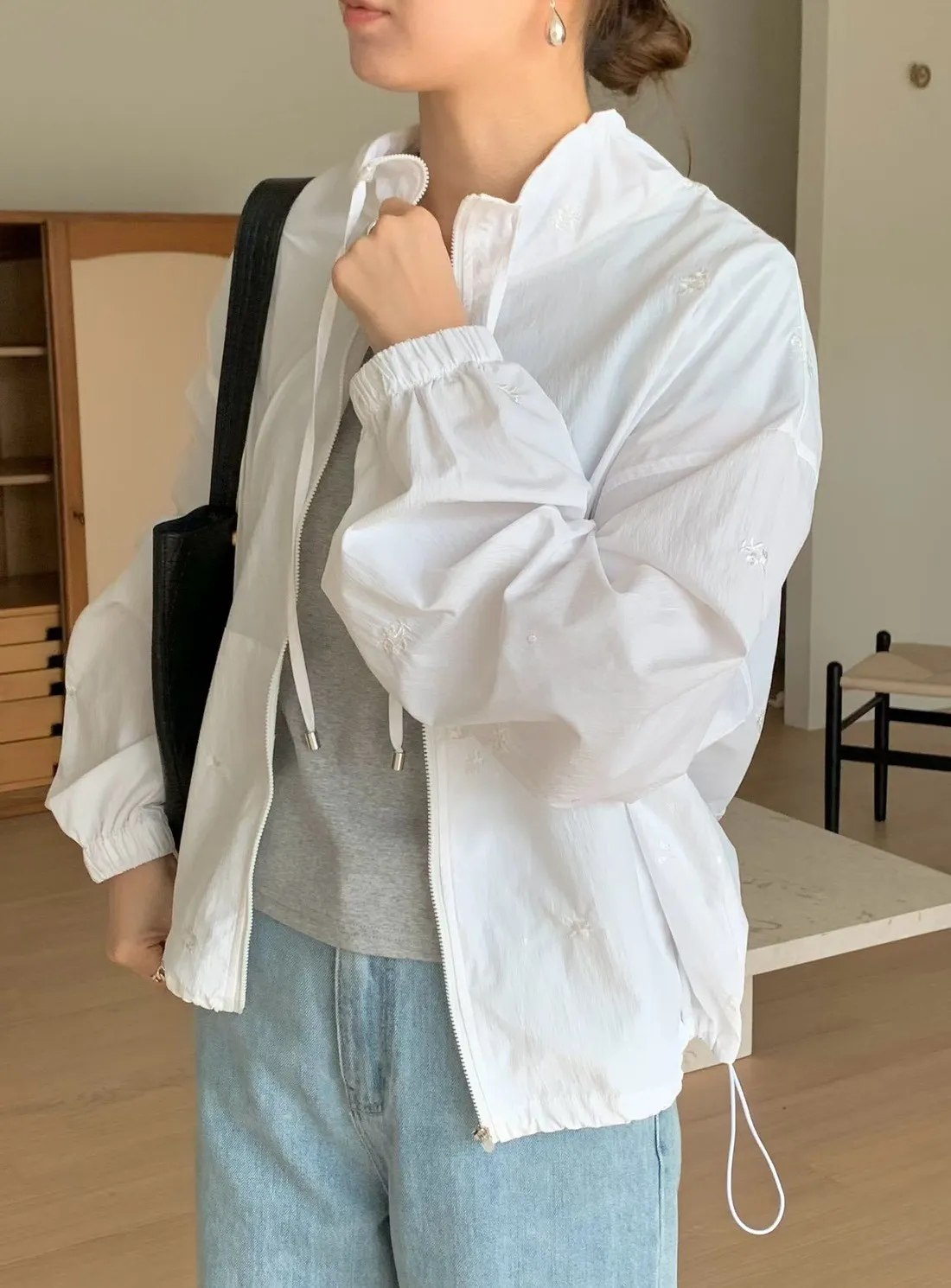 尼龍 薄款輕盈 拉鍊穿脫 刺繡小花 袖口鬆緊 有口袋