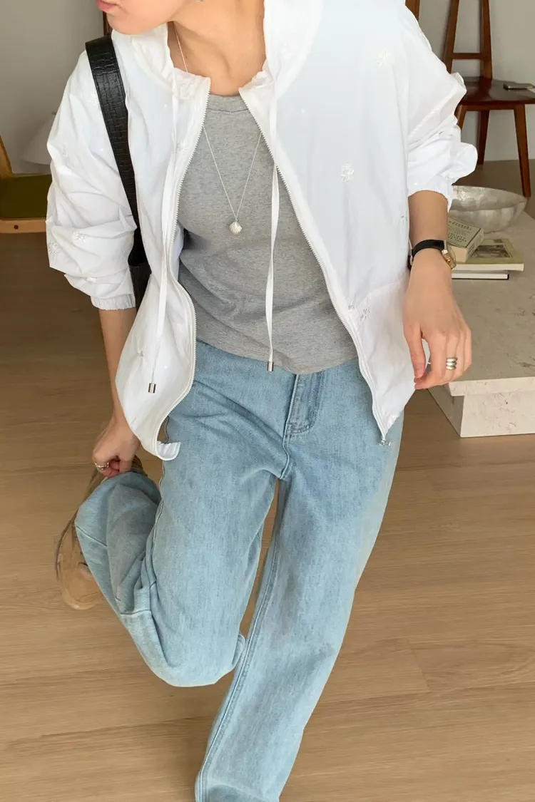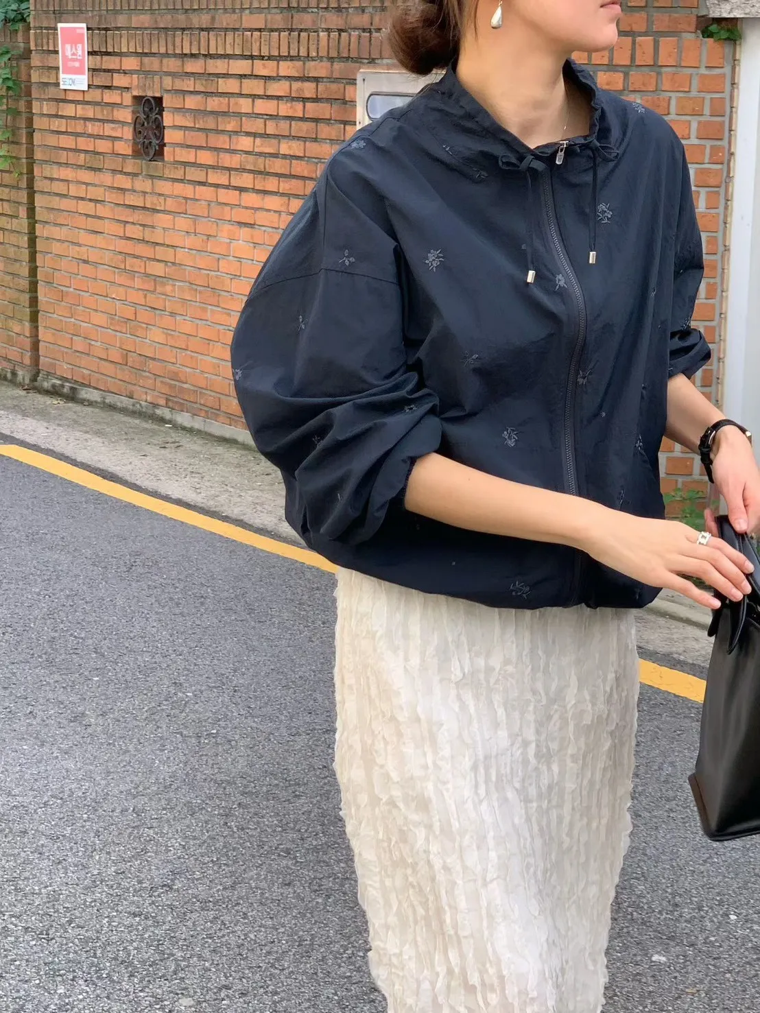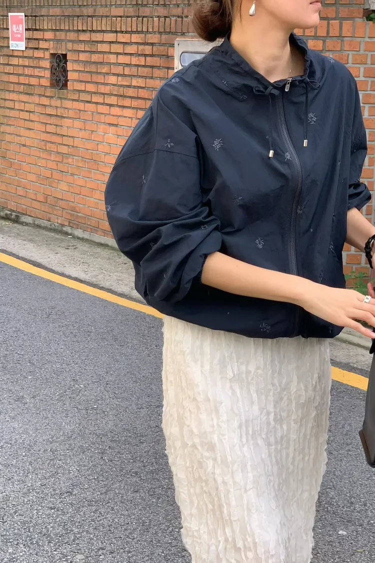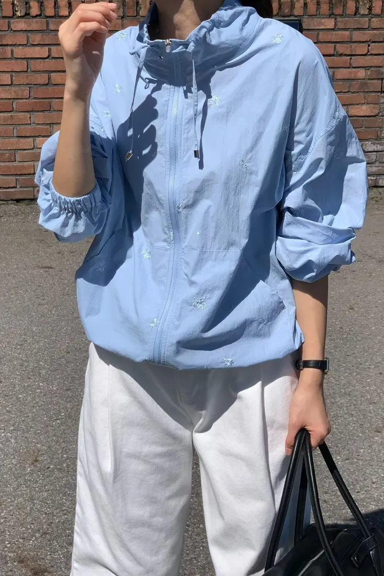 尼龍 薄款輕盈 拉鍊穿脫 刺繡小花 袖口鬆緊 有口袋
