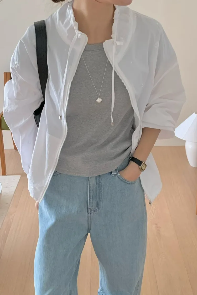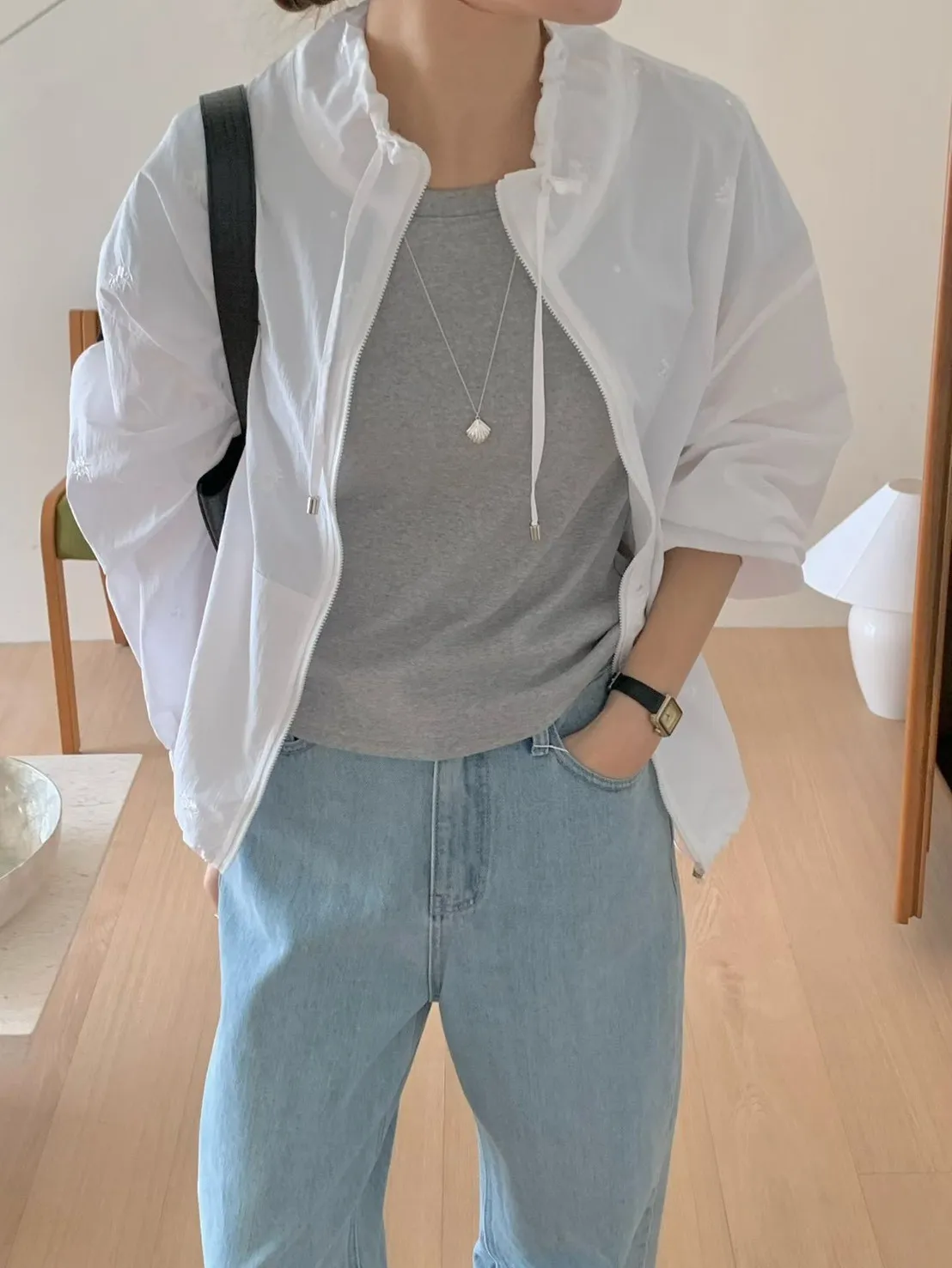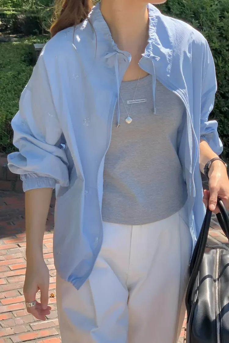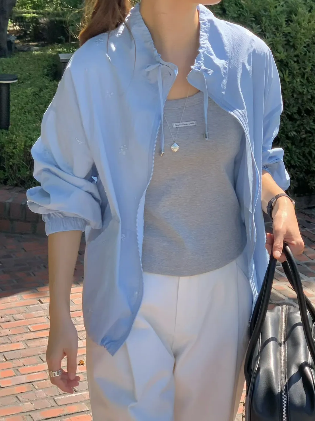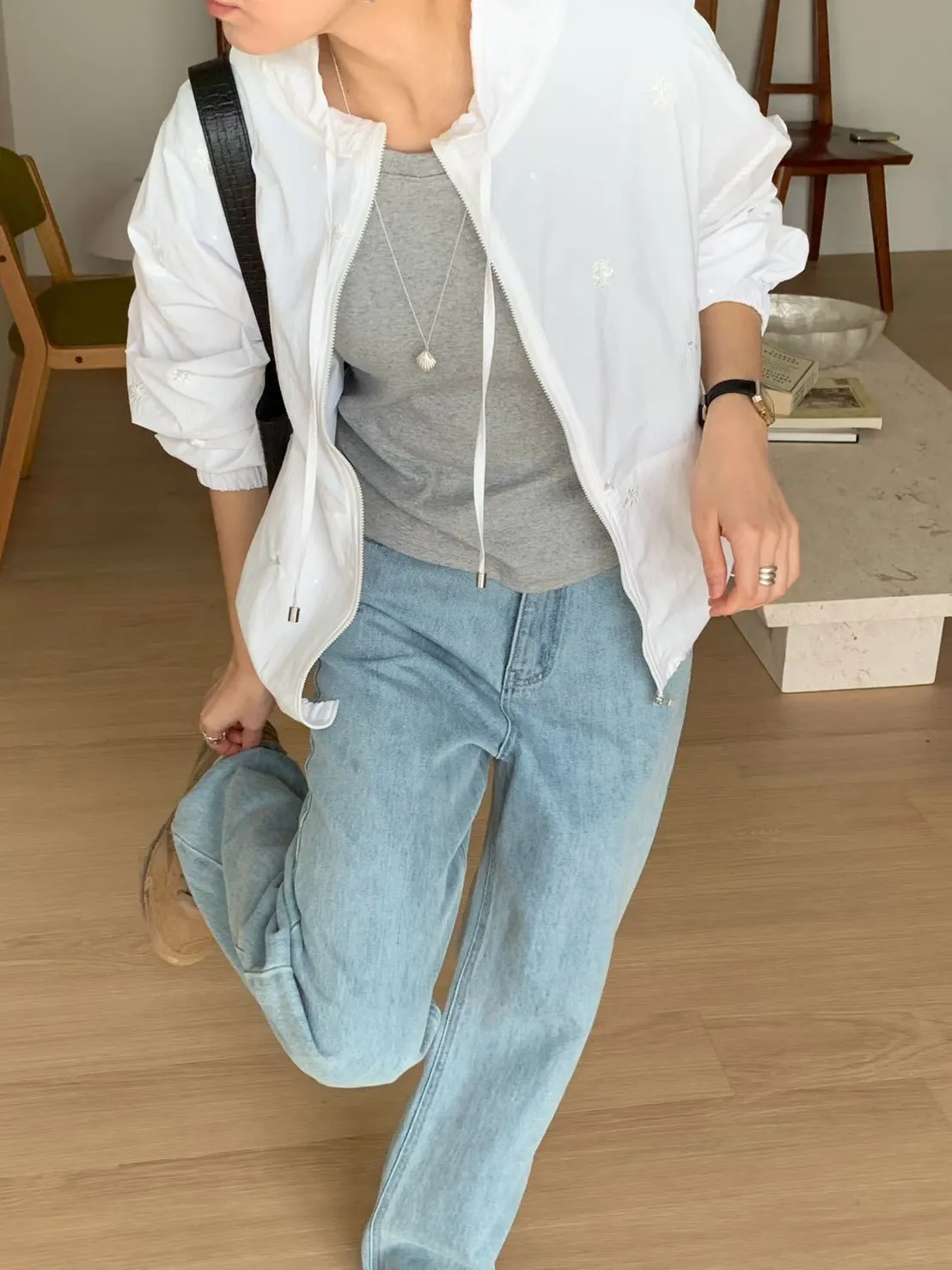 尼龍 薄款輕盈 拉鍊穿脫 刺繡小花 袖口鬆緊 有口袋