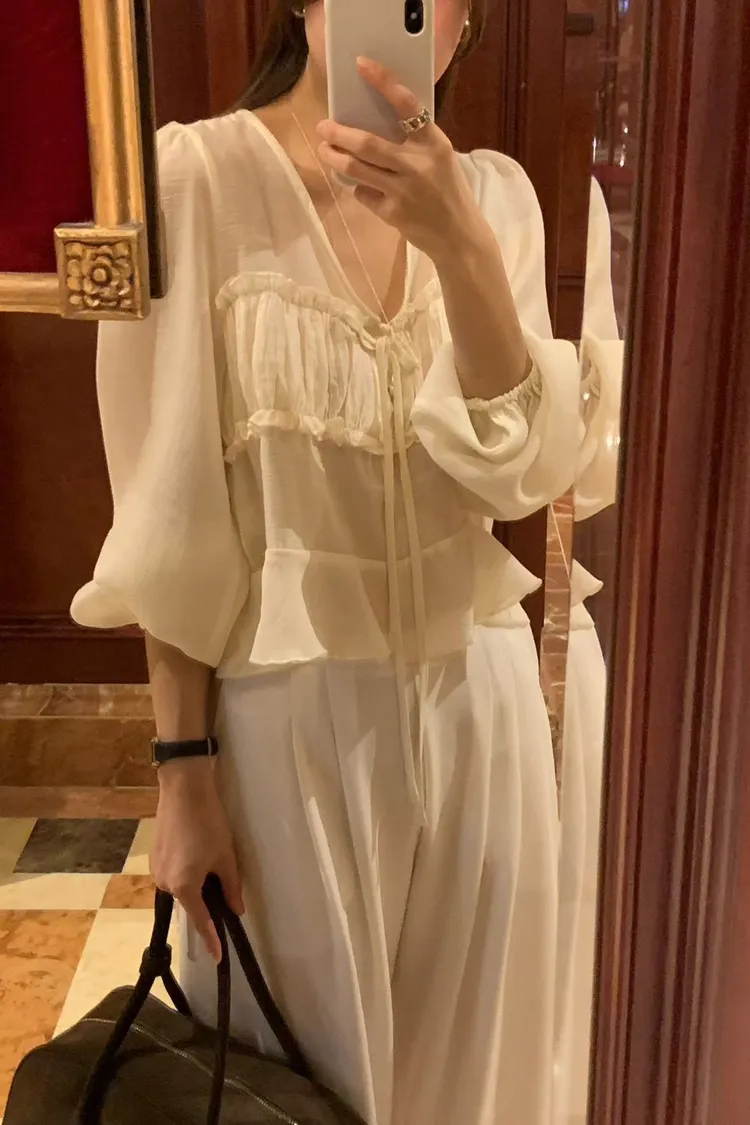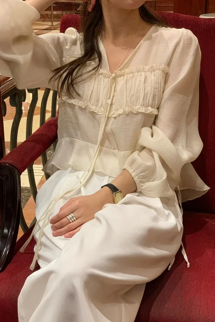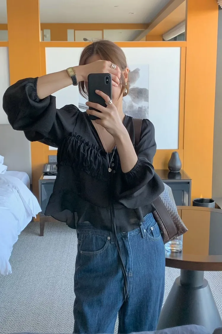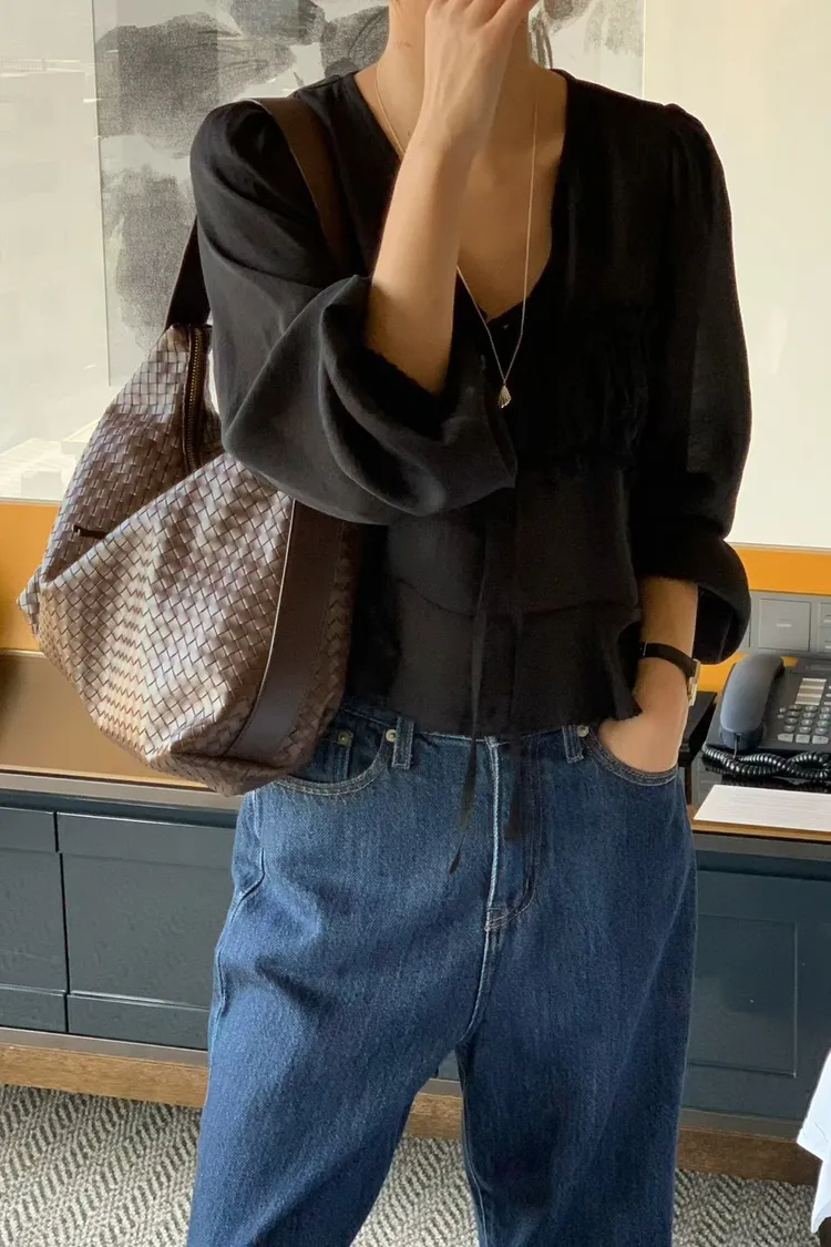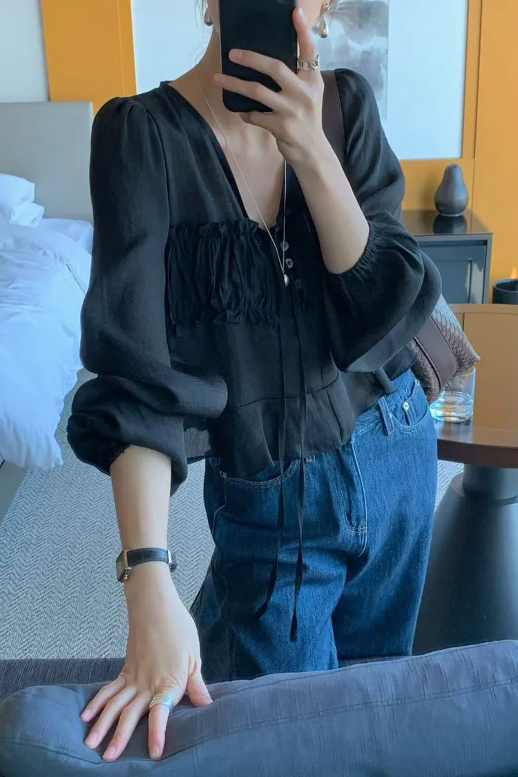 MK336浪漫V領法式天絲上衣 米 黑 官網價$780 線上價$750