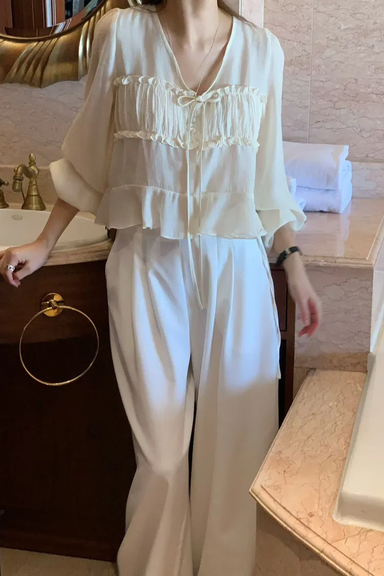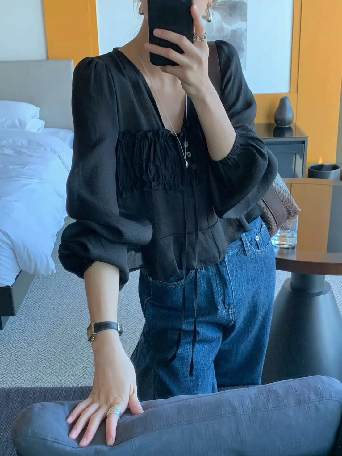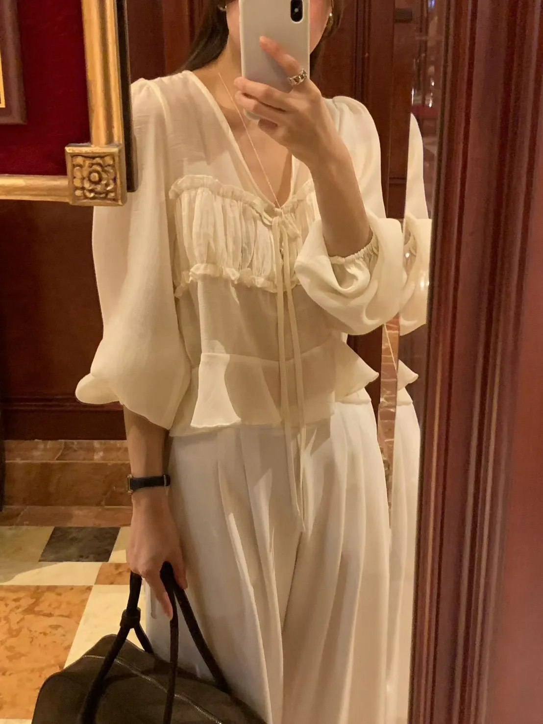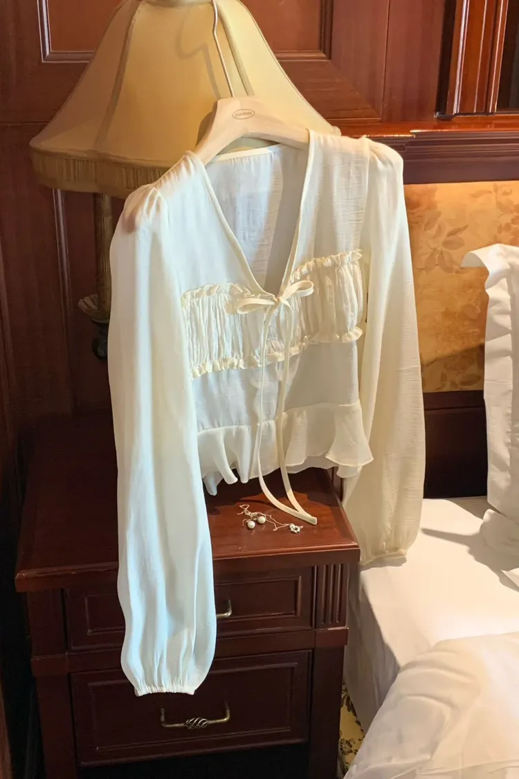 MK336浪漫V領法式天絲上衣 米 黑 官網價$780 線上價$750