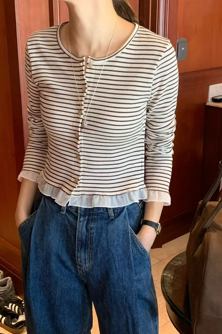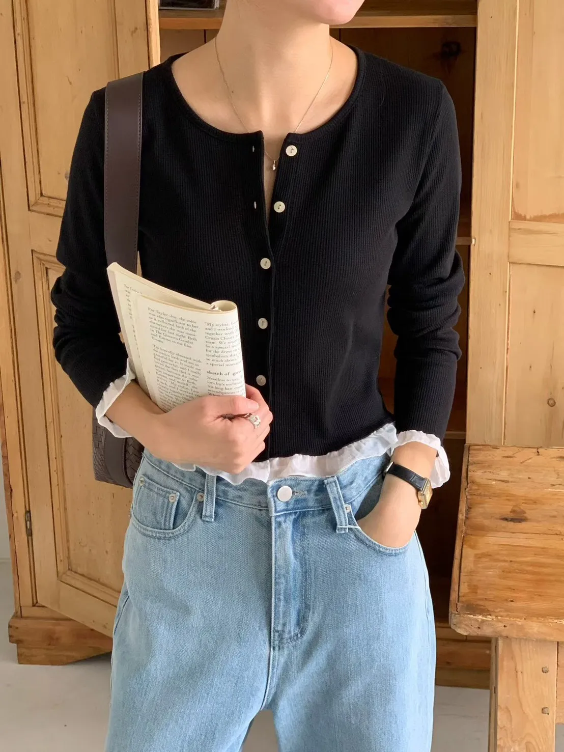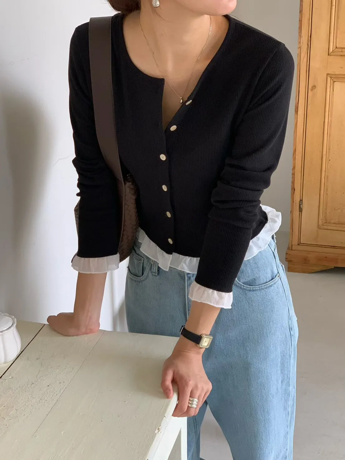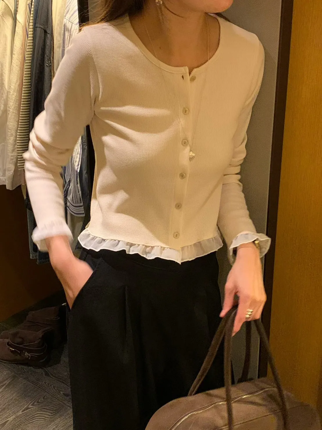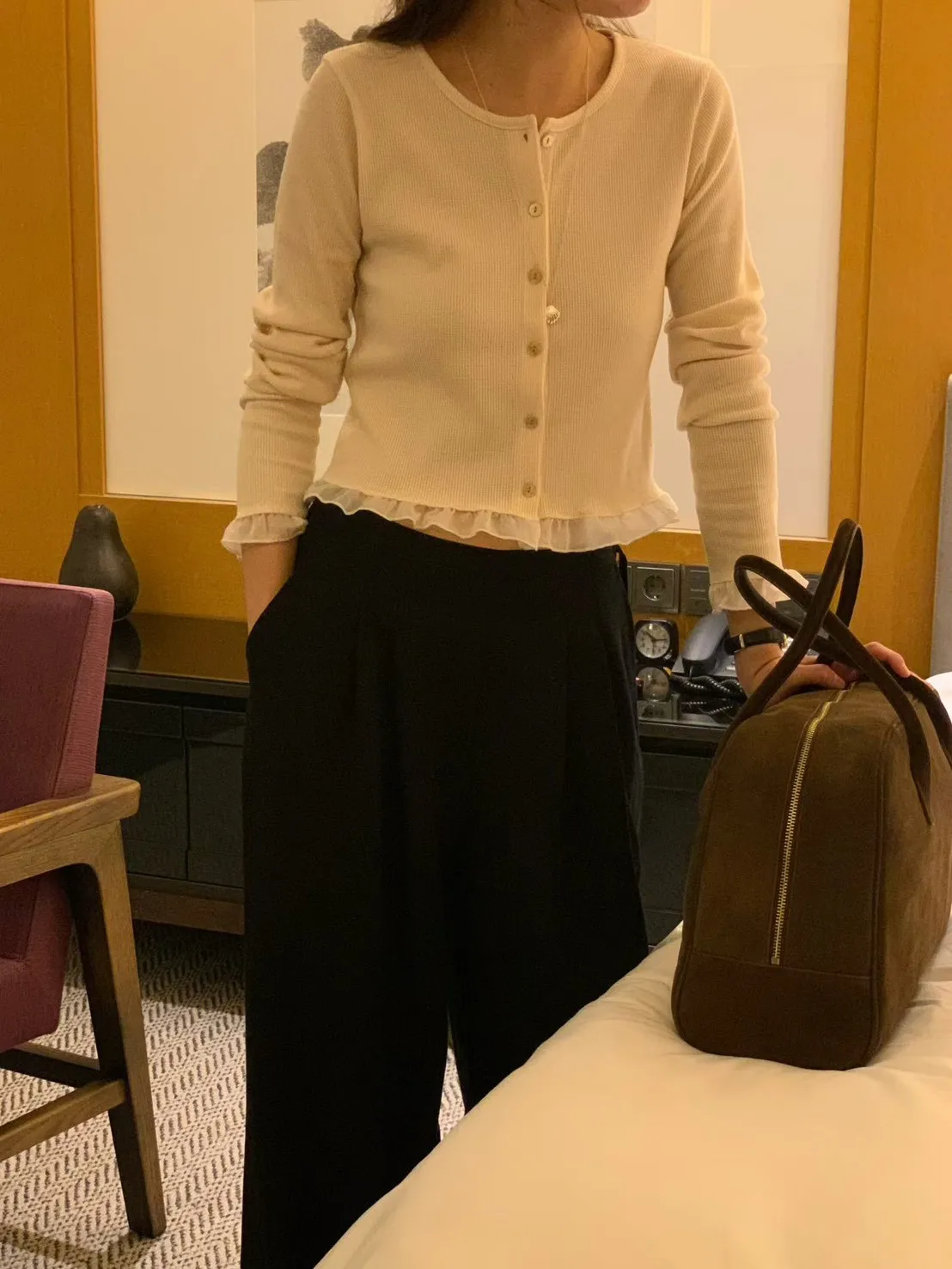 棉+彈力 面料舒適 短版好比例 下擺袖口拼接荷葉設計