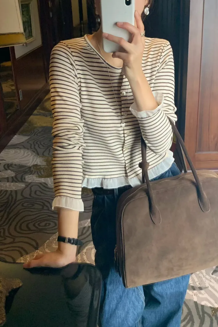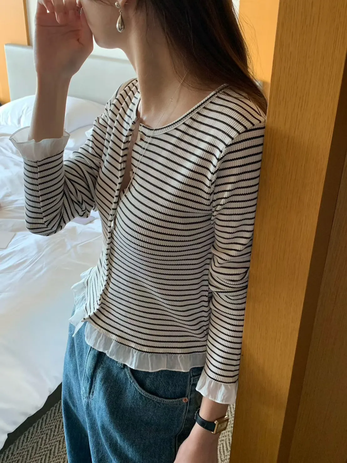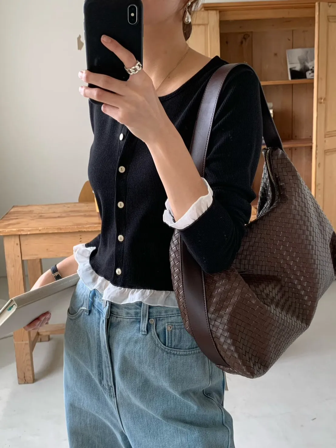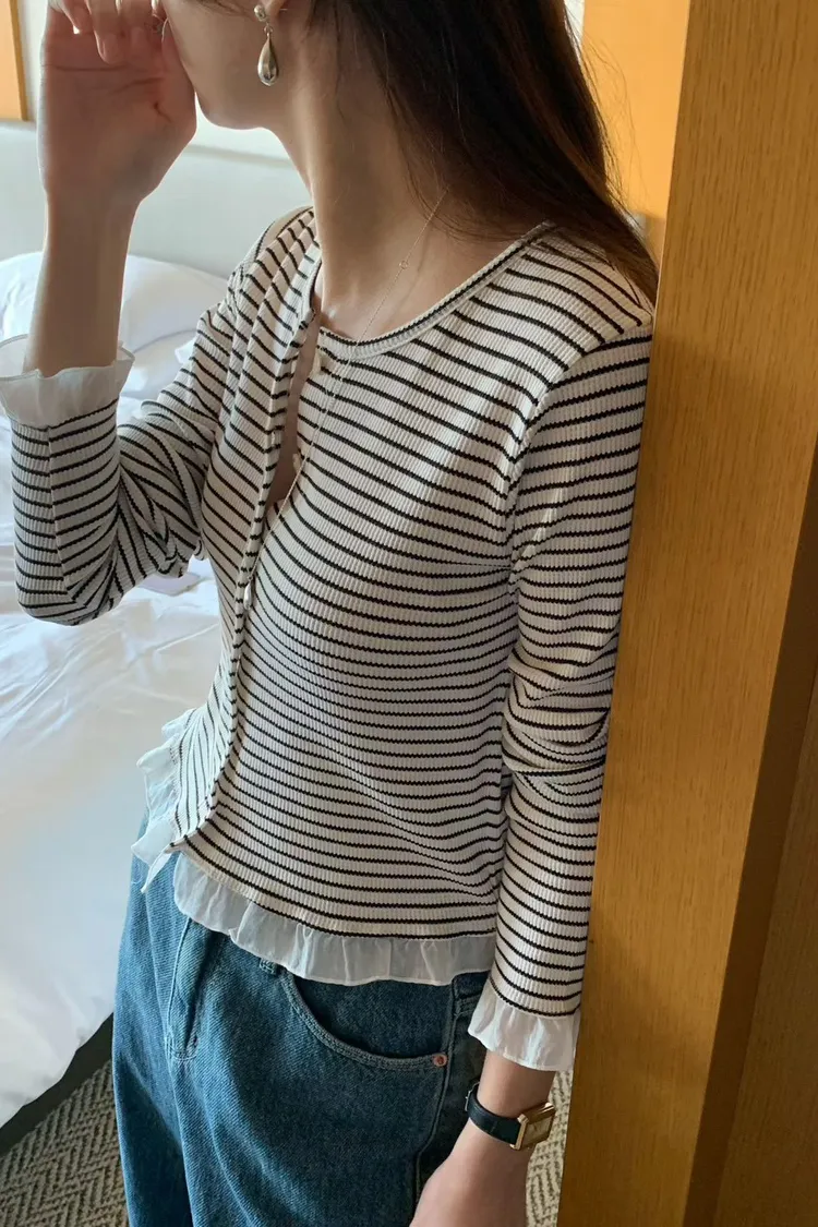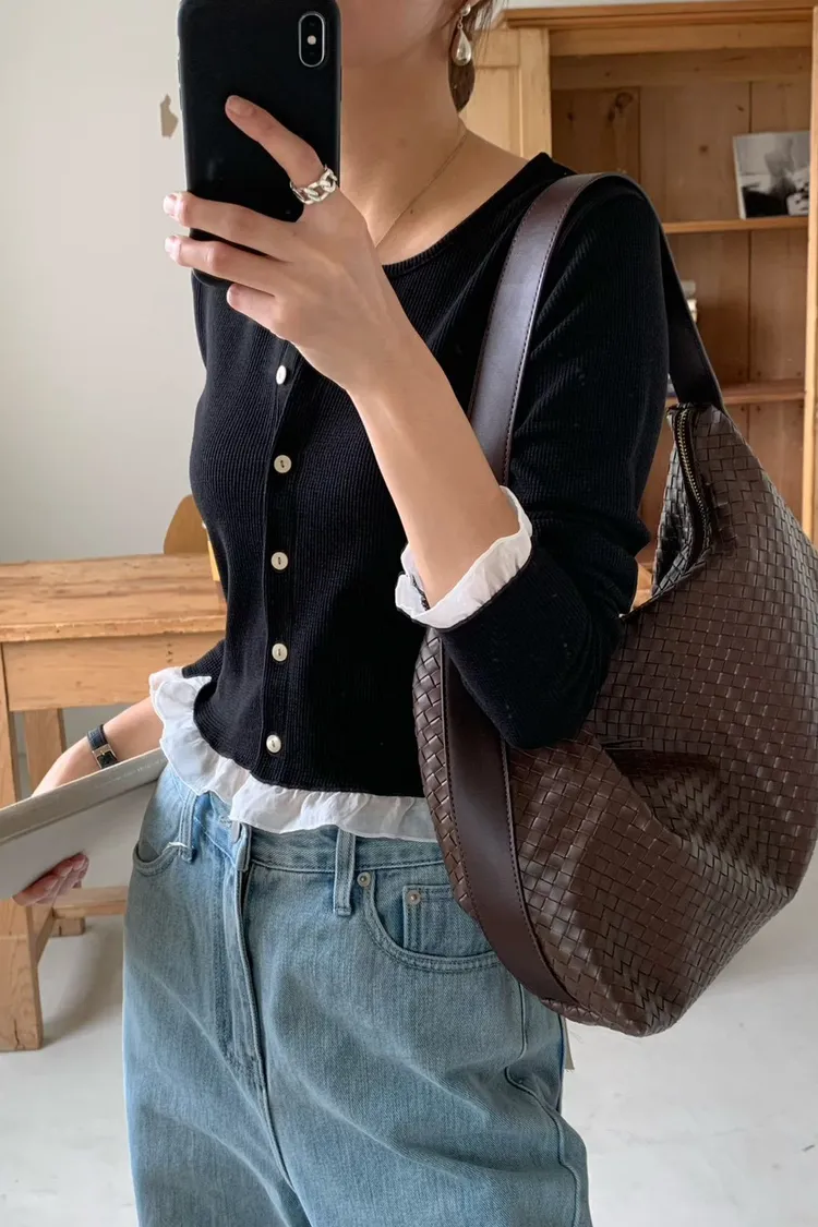 棉+彈力 面料舒適 短版好比例 下擺袖口拼接荷葉設計