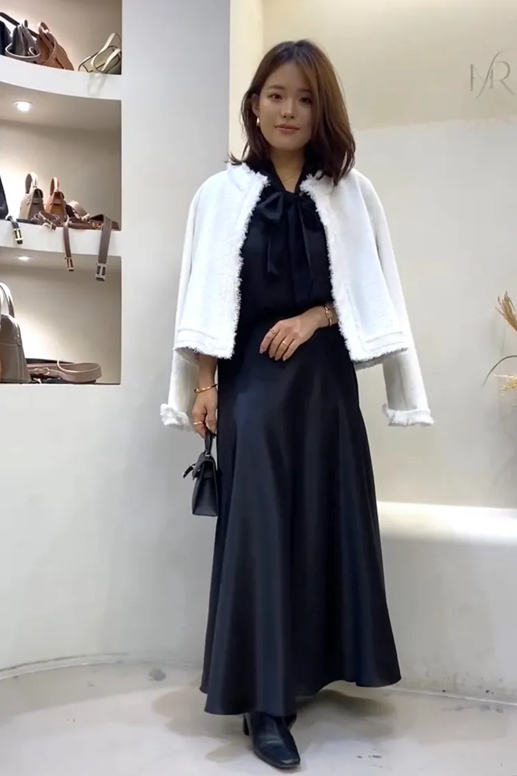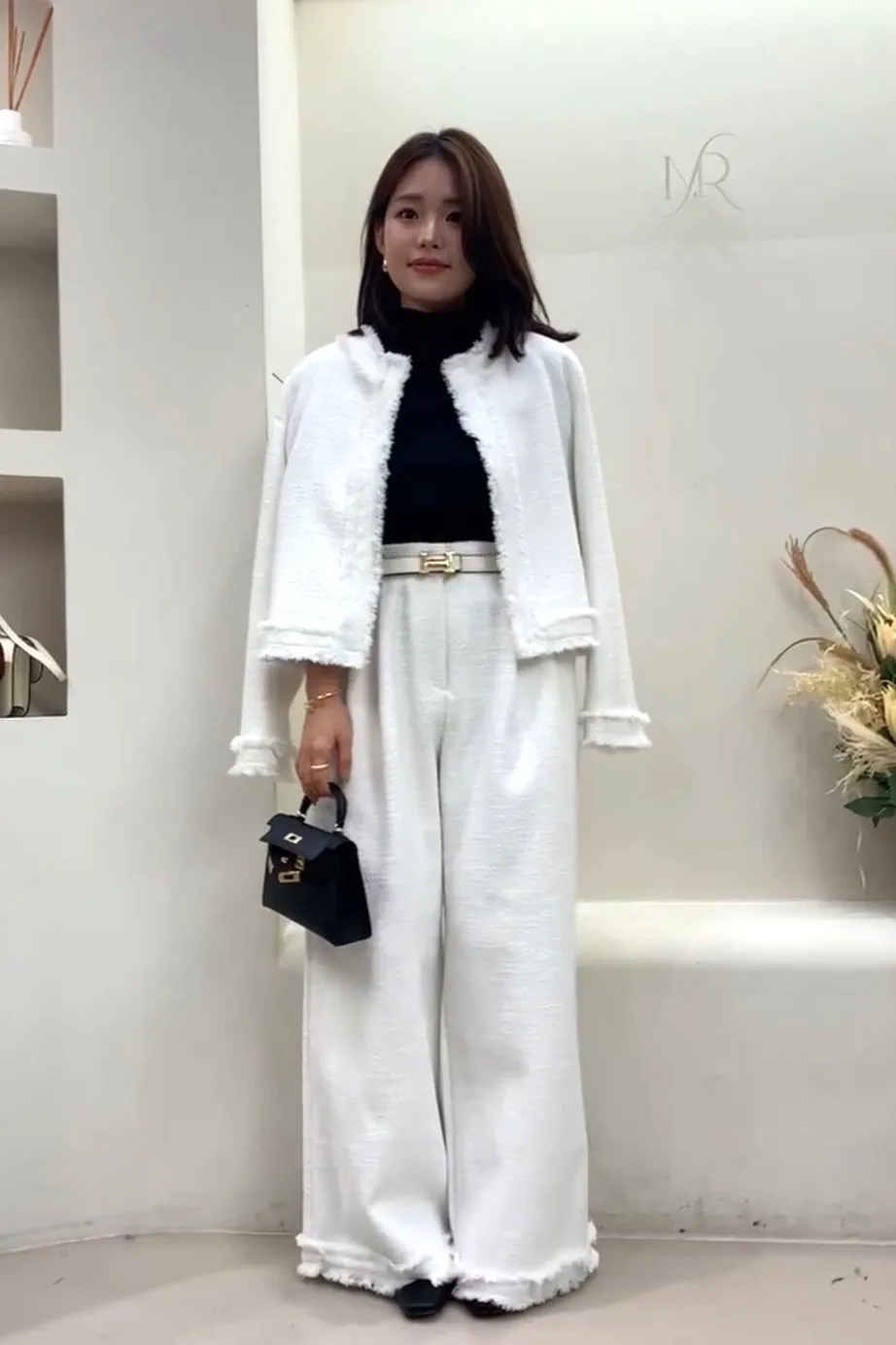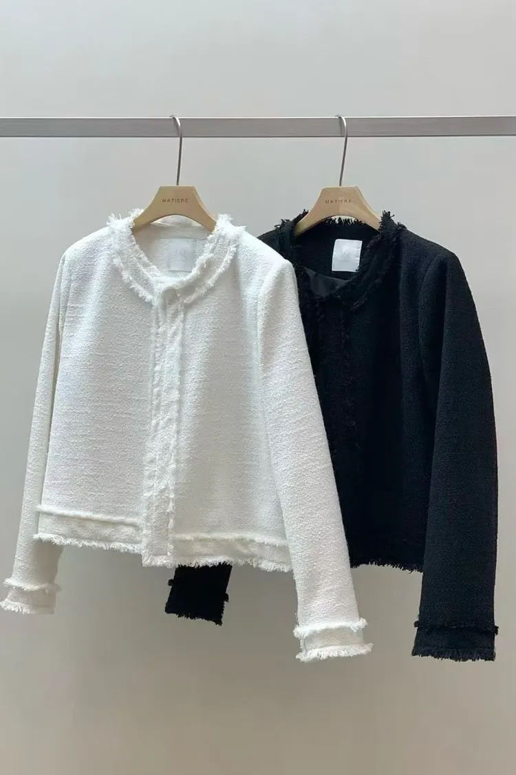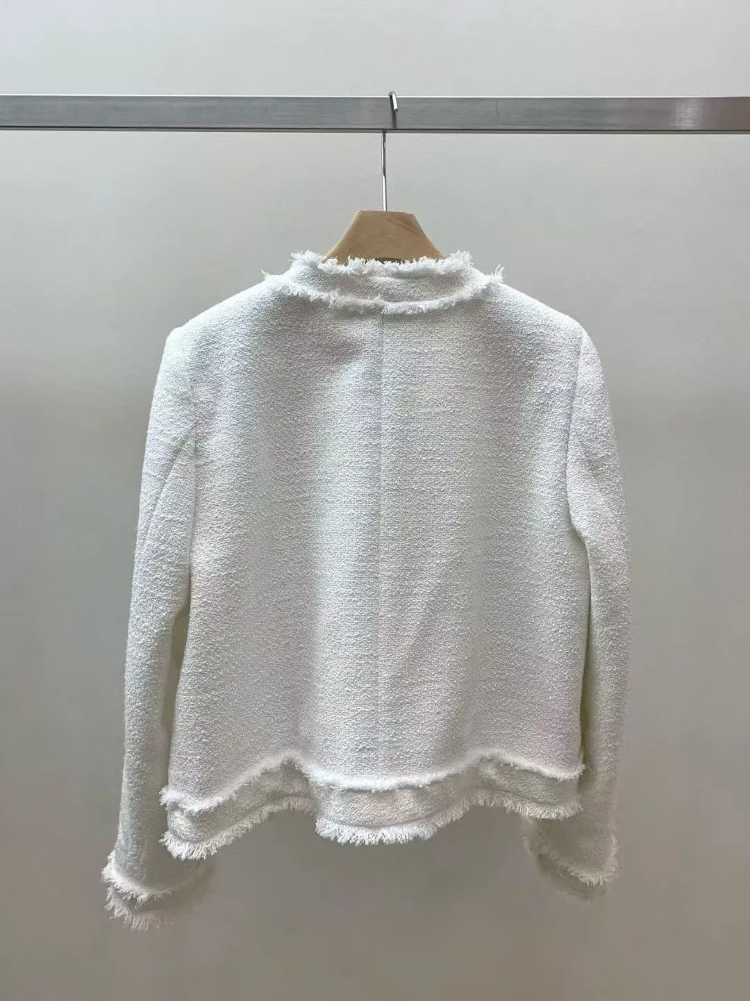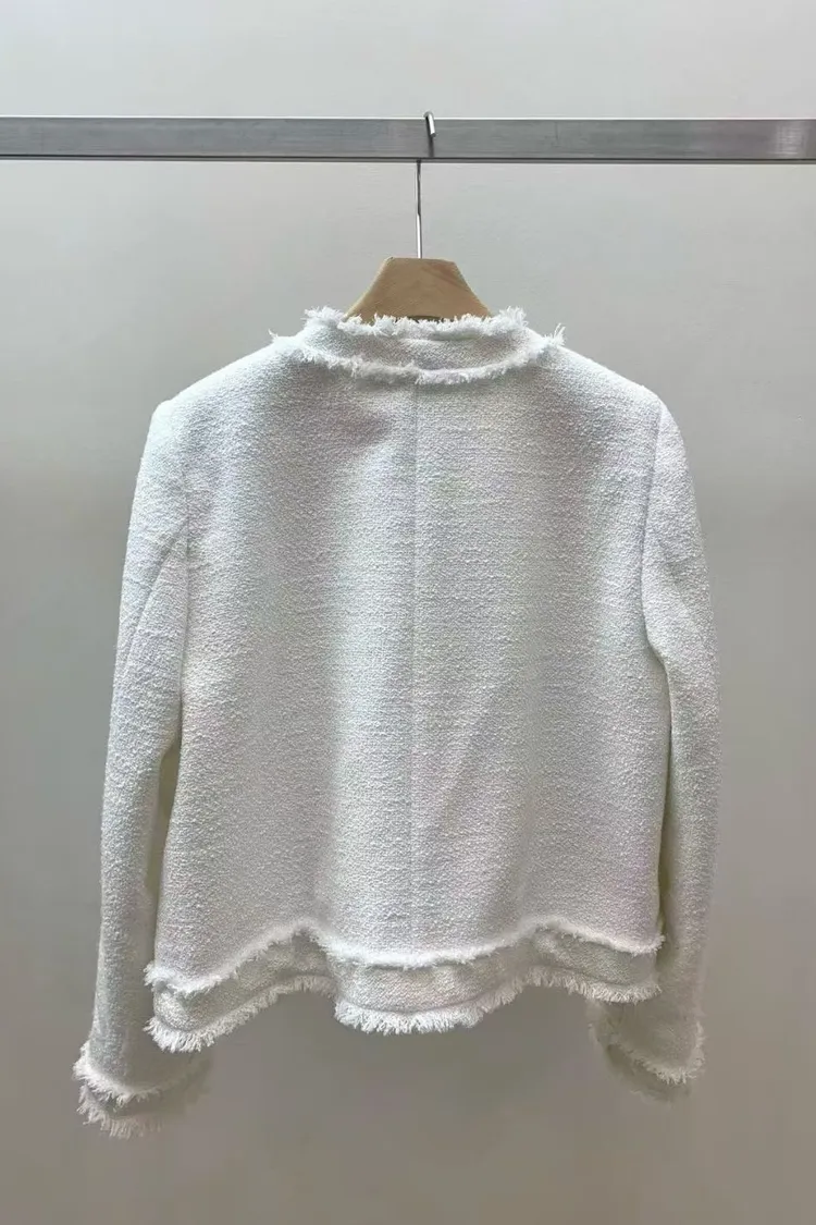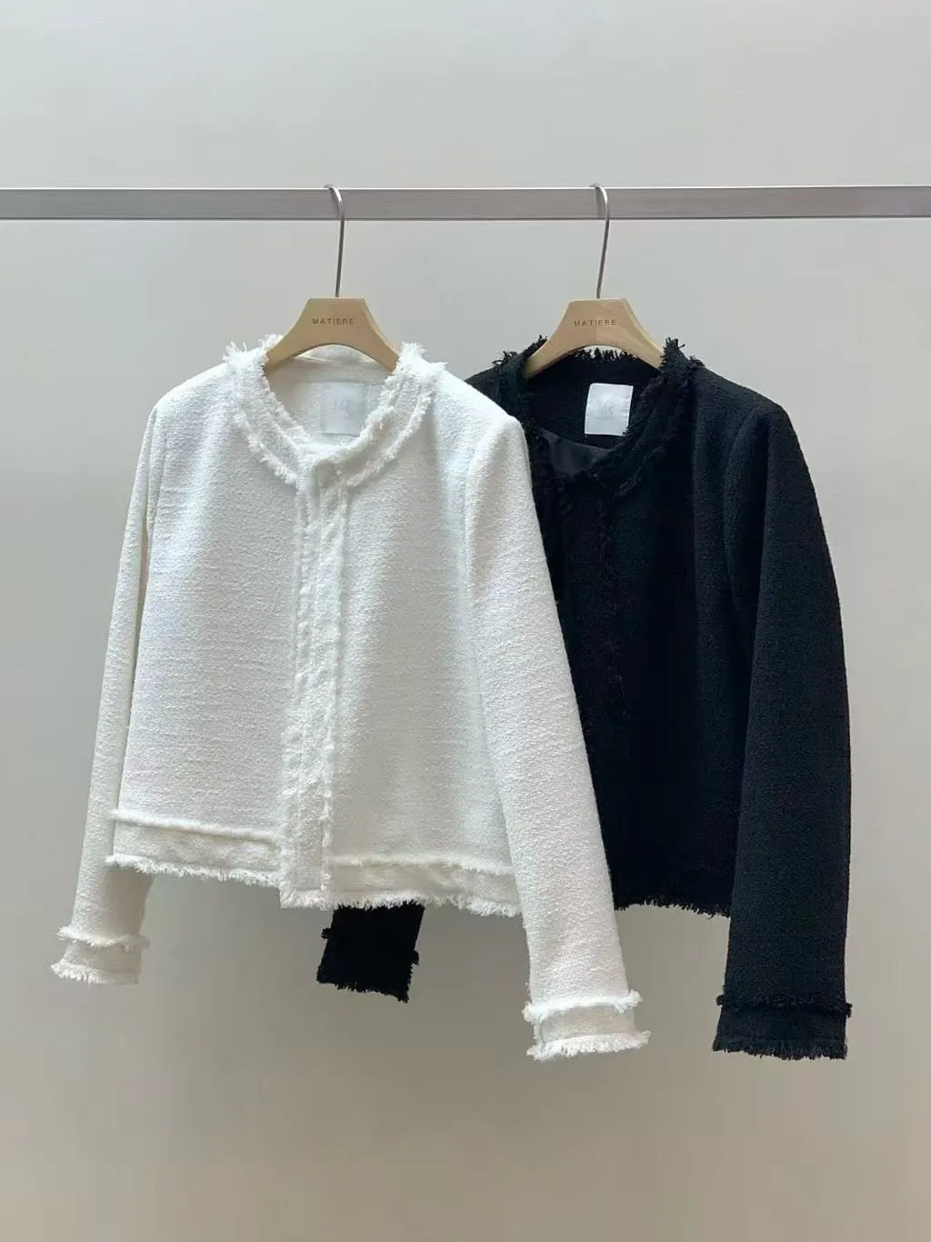 MK428套裝的鬚鬚無釦小香風外套 米 黑 官網價$1930 永恆甜甜價$1880 羊毛10%+聚酯 無釦穿脫 適合各種身形 肩寬40胸寬52全長55