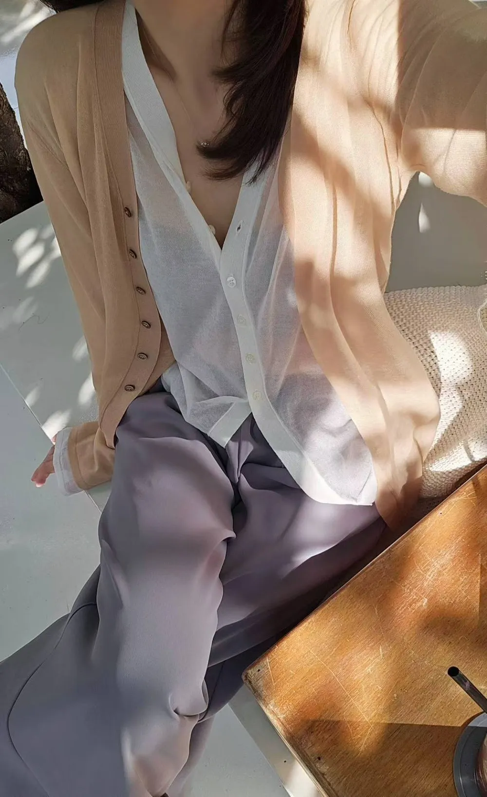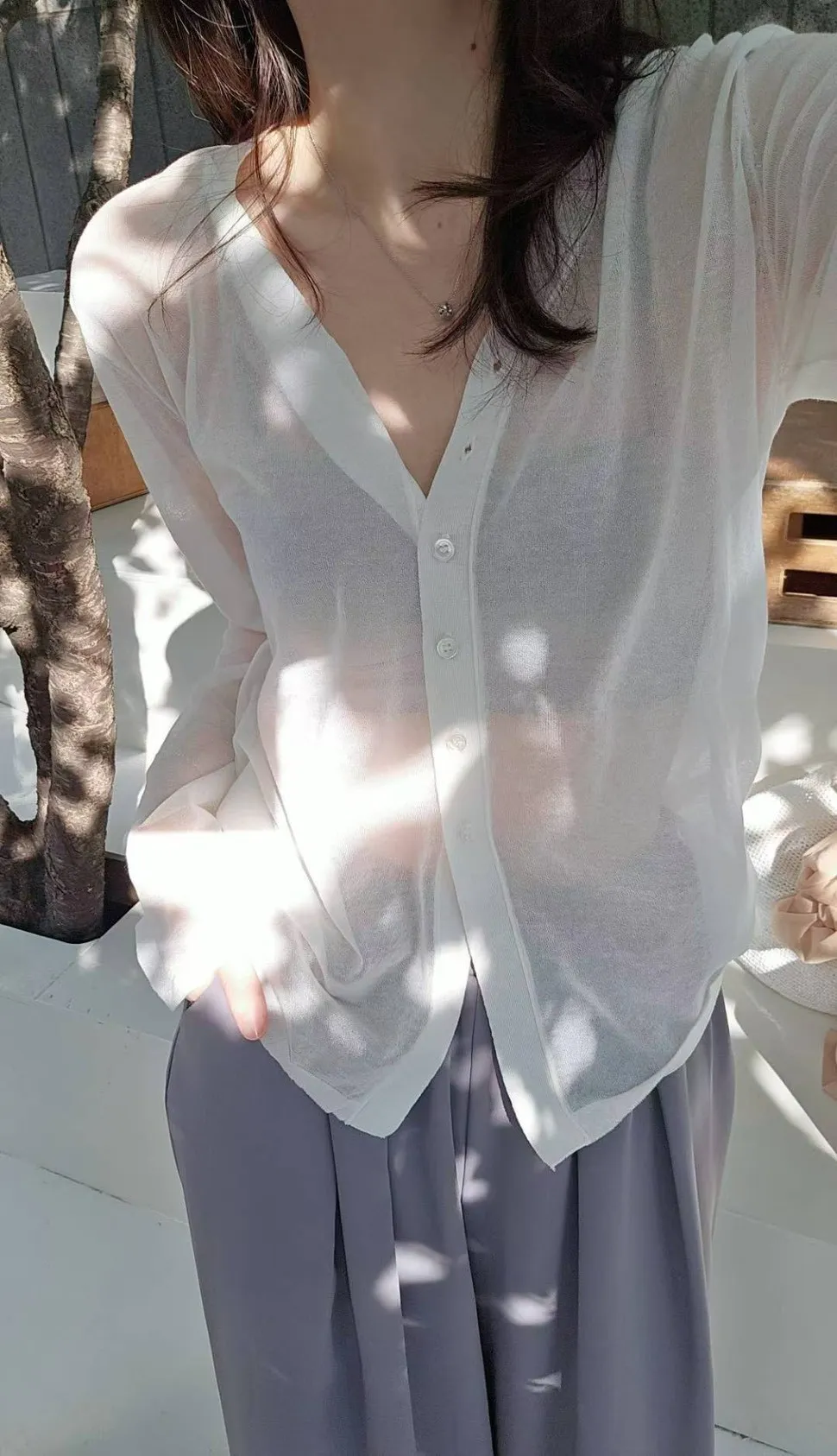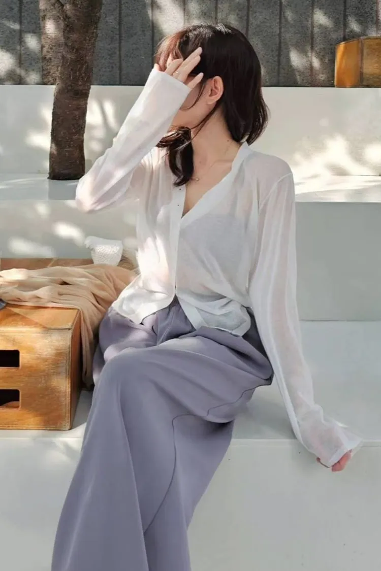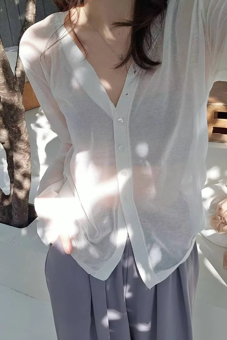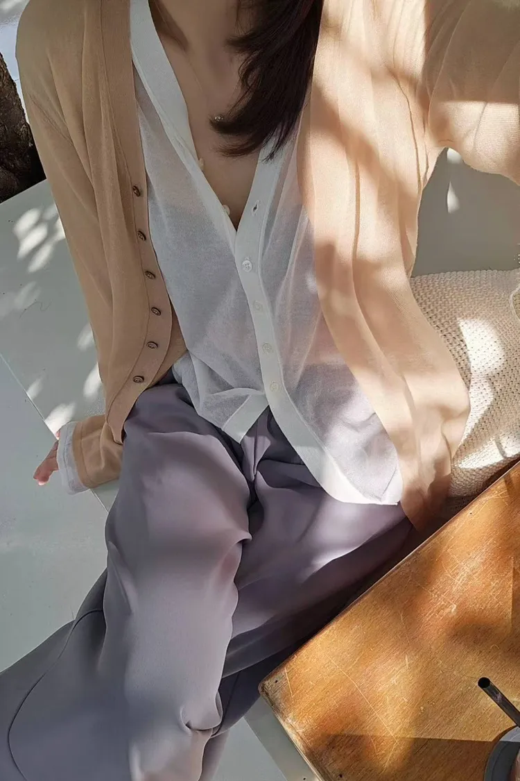 超細精梳棉82%+尼龍 柔滑如絲 透肌薄紗輕盈 下擺開叉 珍珠母貝釦
