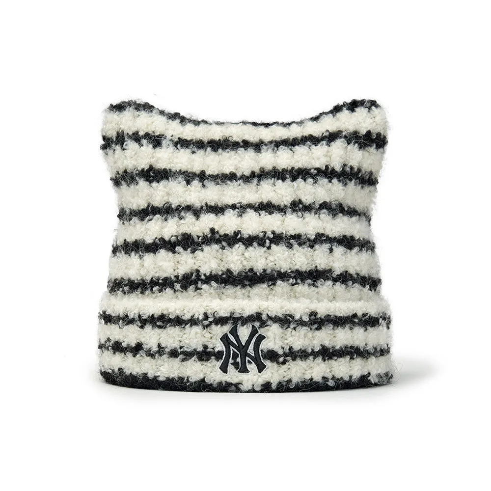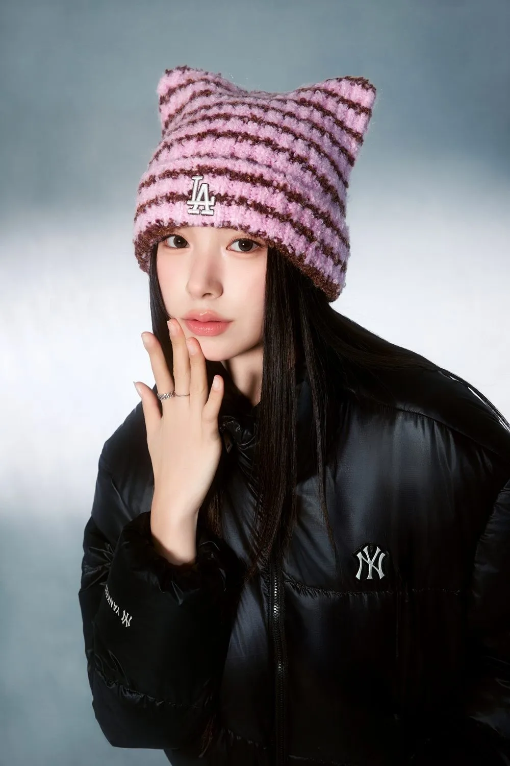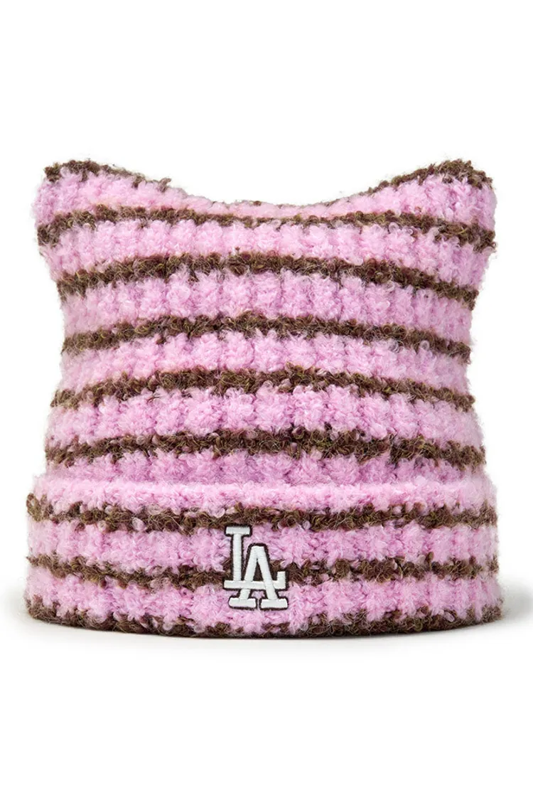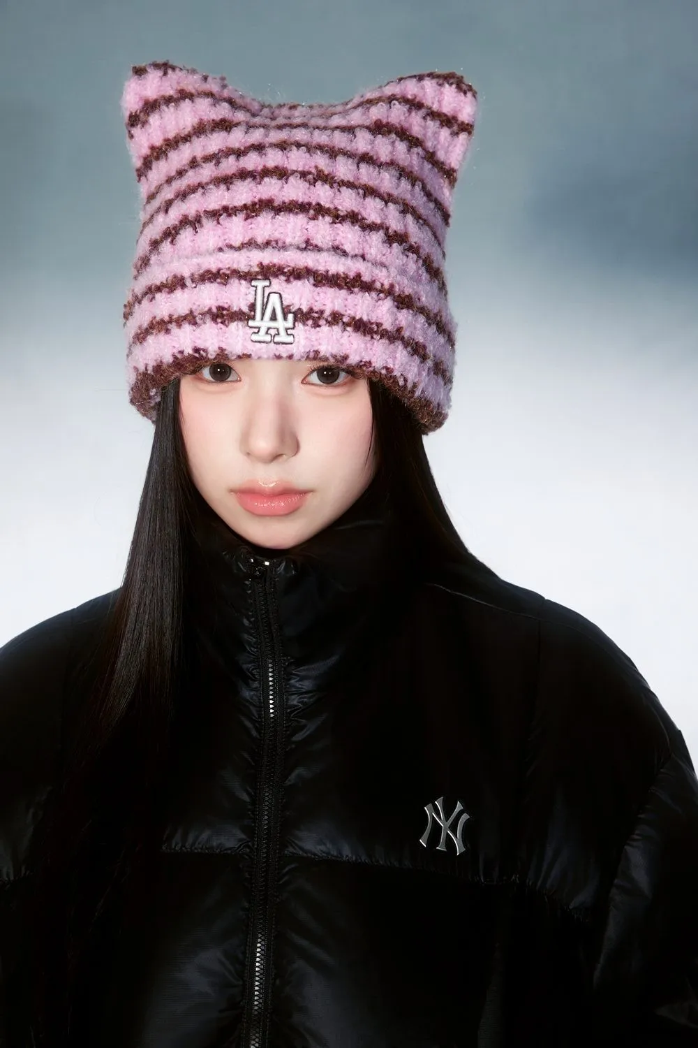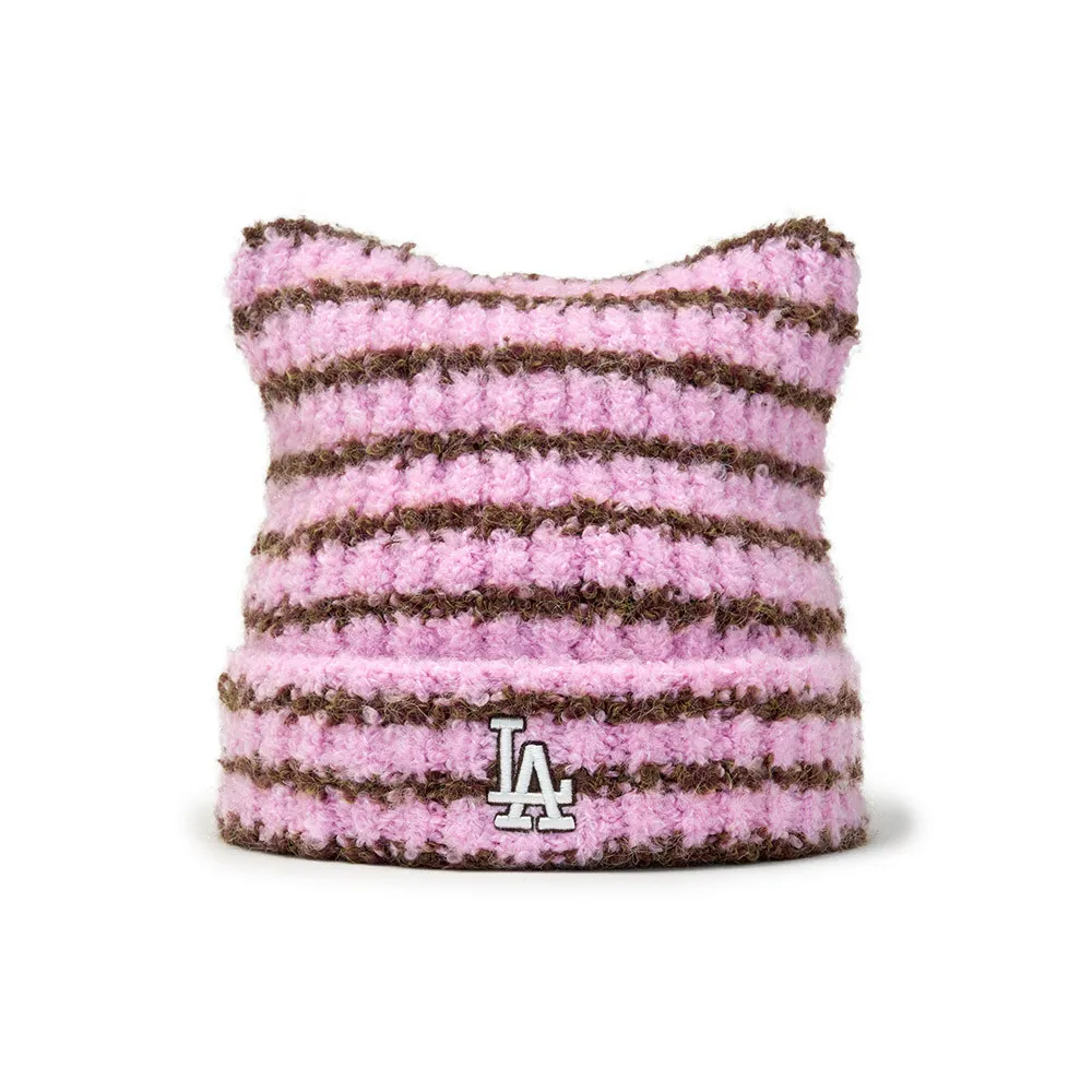 MLB001毛毛條紋貓耳針織毛帽 米 粉 原價$1280 售價$850