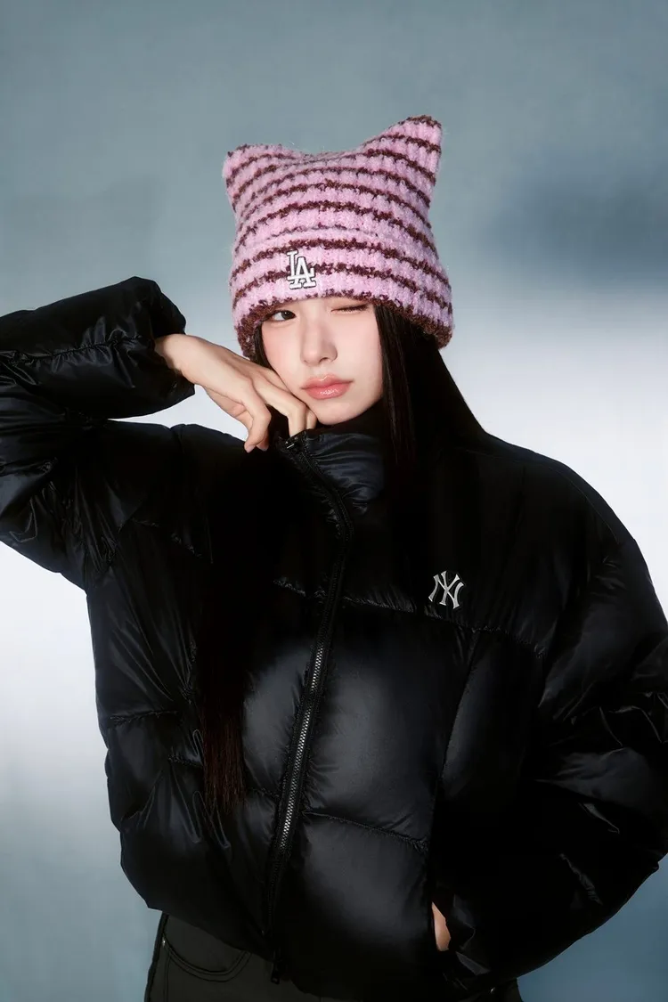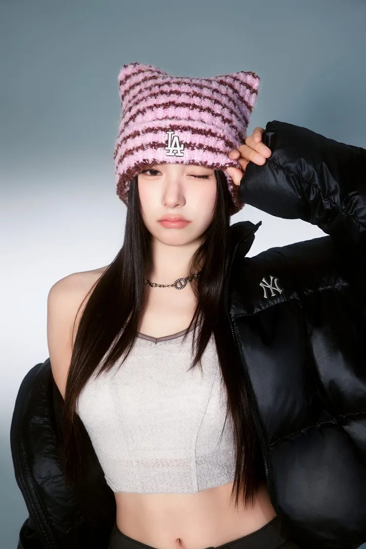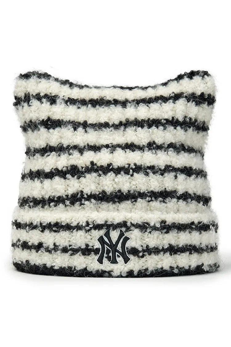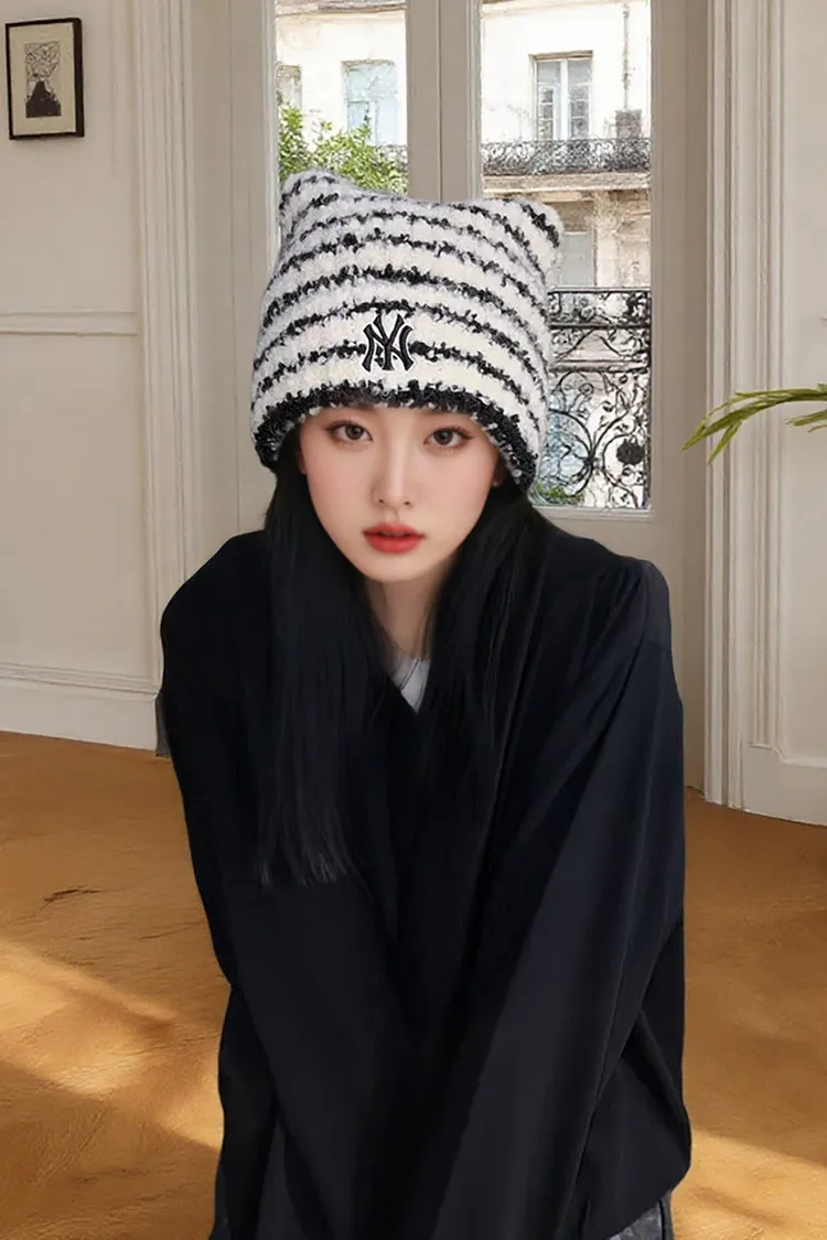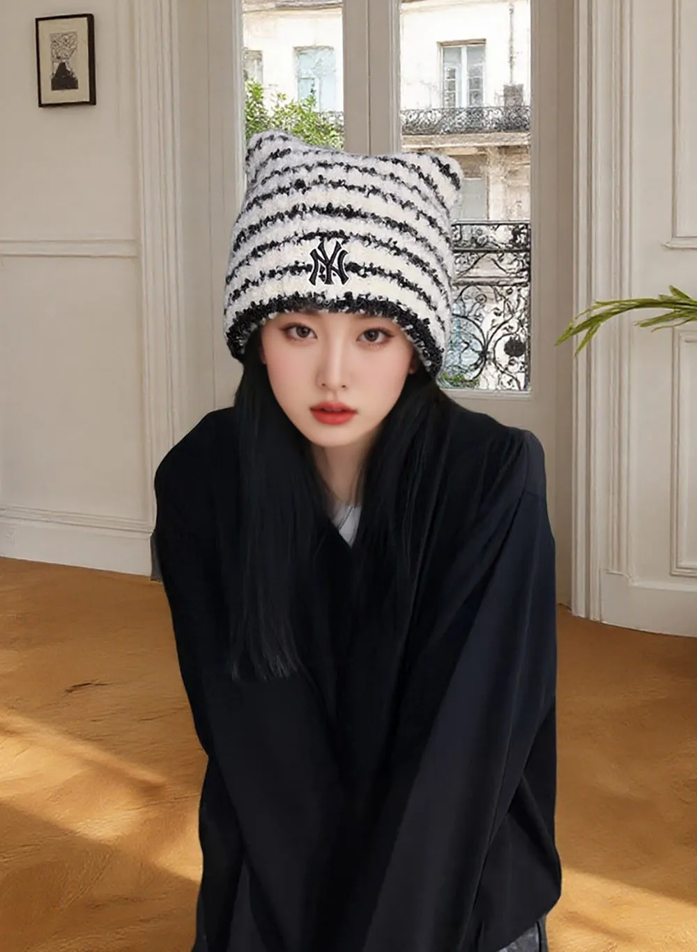 MLB001毛毛條紋貓耳針織毛帽 米 粉 原價$1280 售價$850