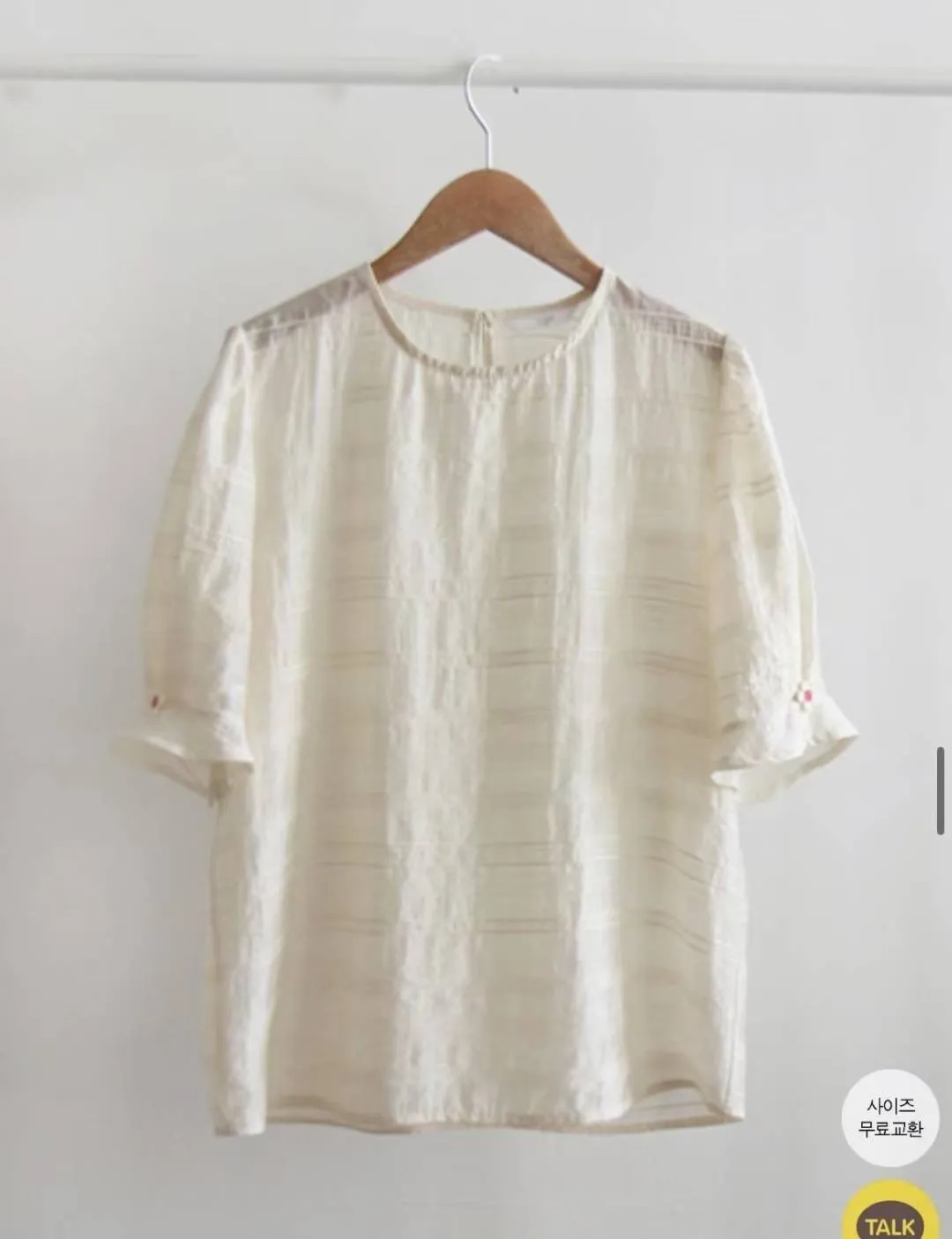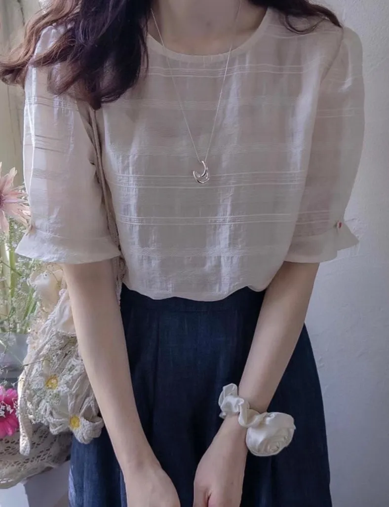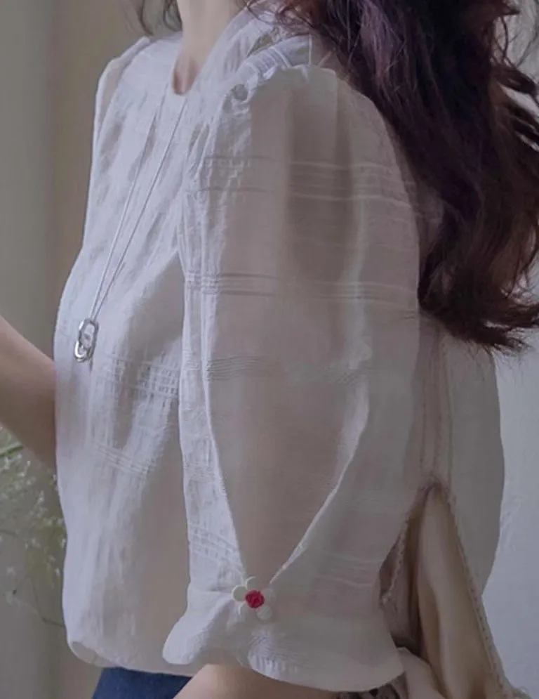 棉 薄款透氣 荷葉袖口小花貼布 輕盈透光 後頸釦穿脫