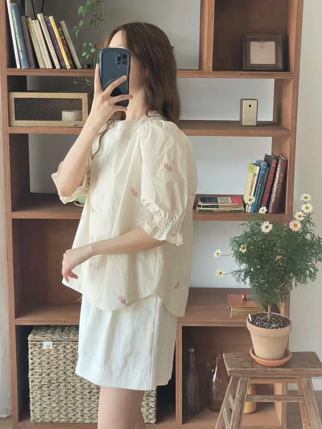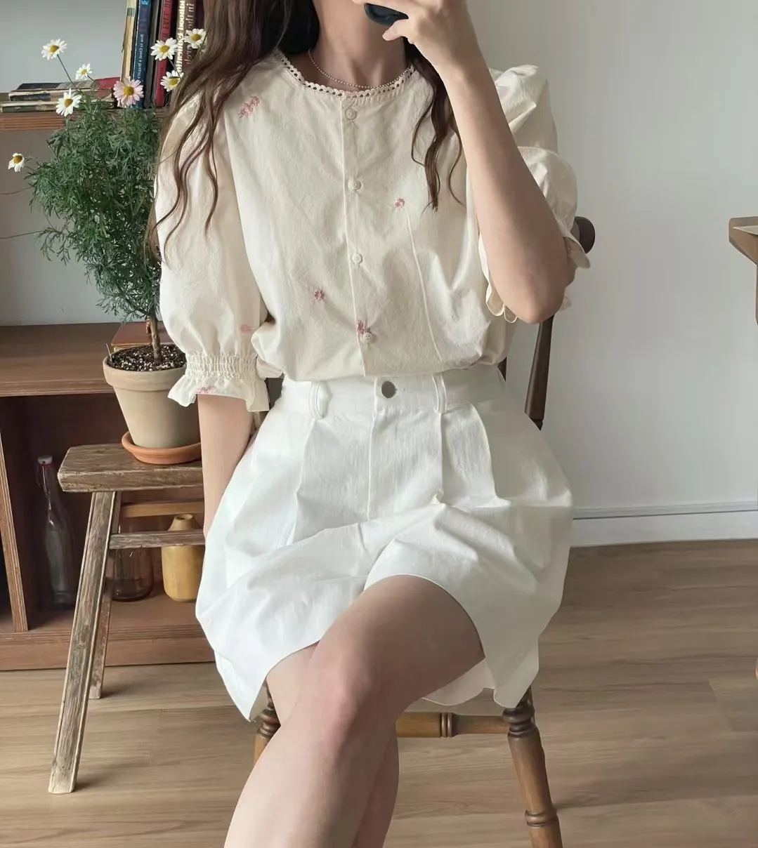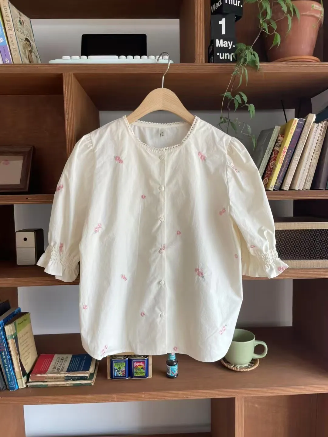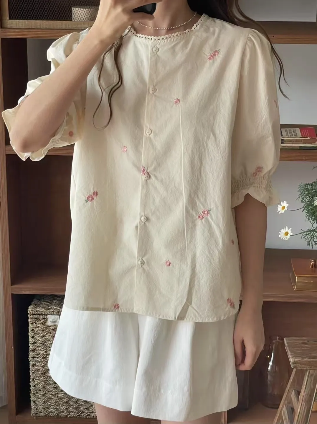 棉 薄款輕盈 精緻刺繡小花 領口蕾絲