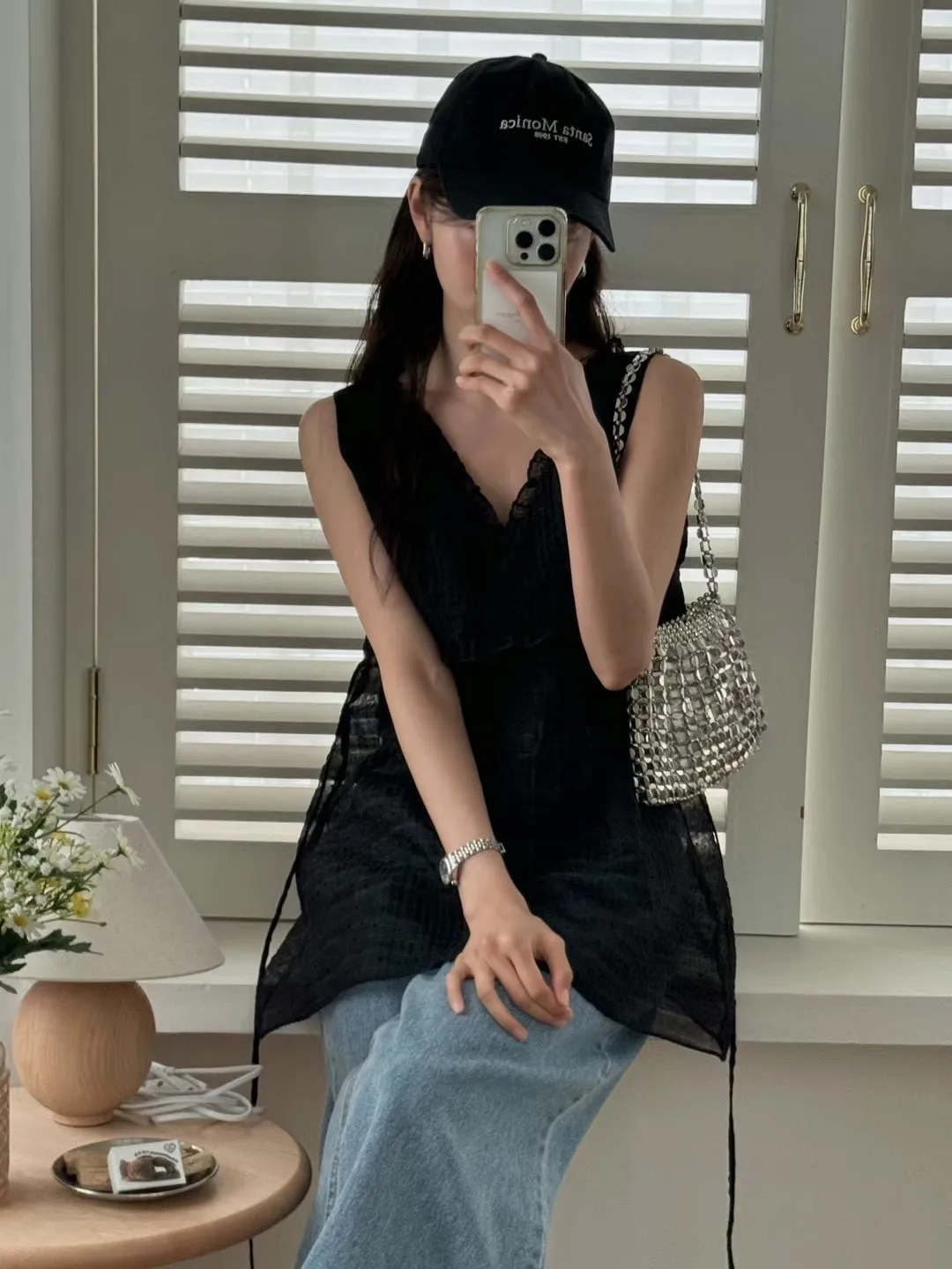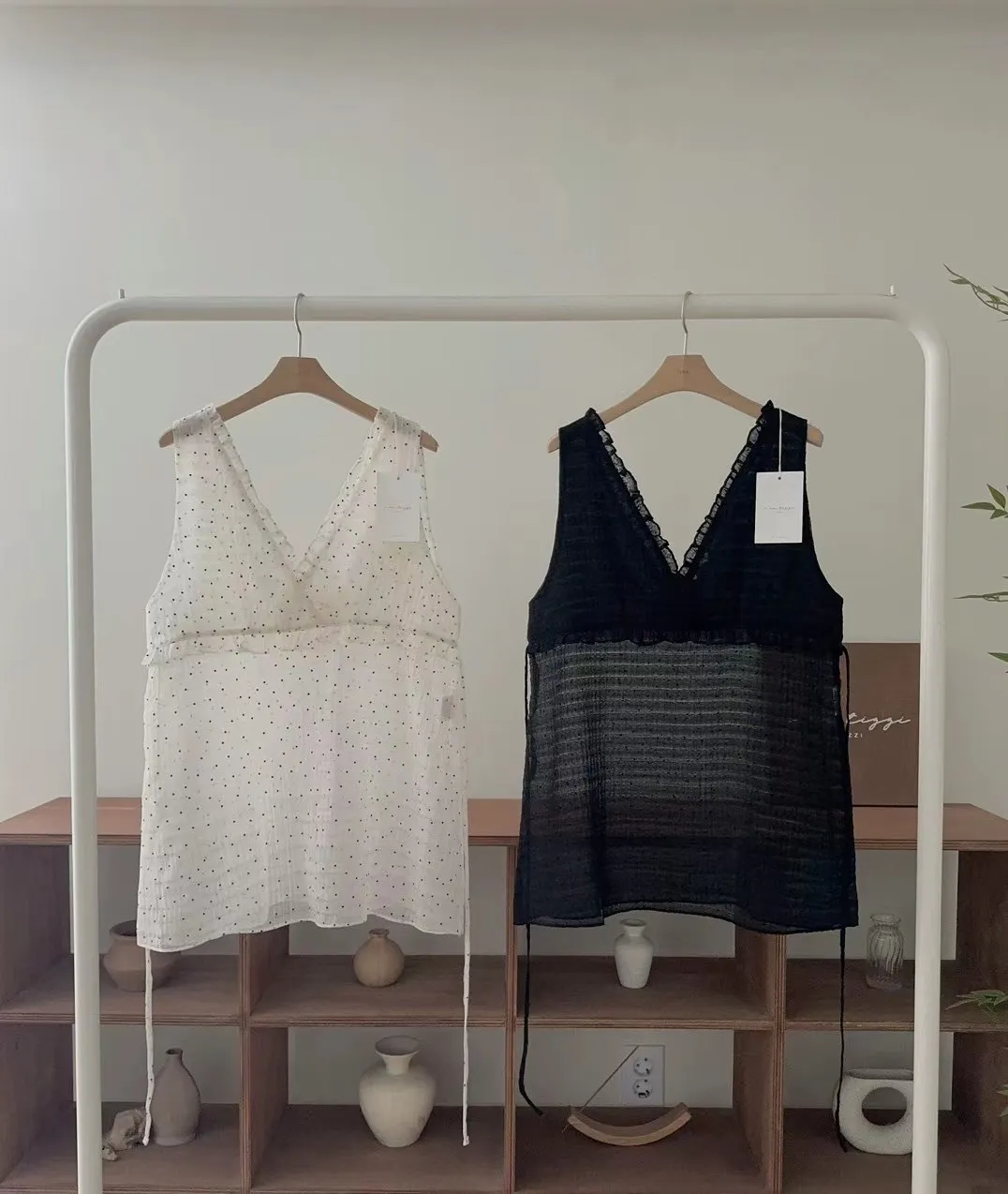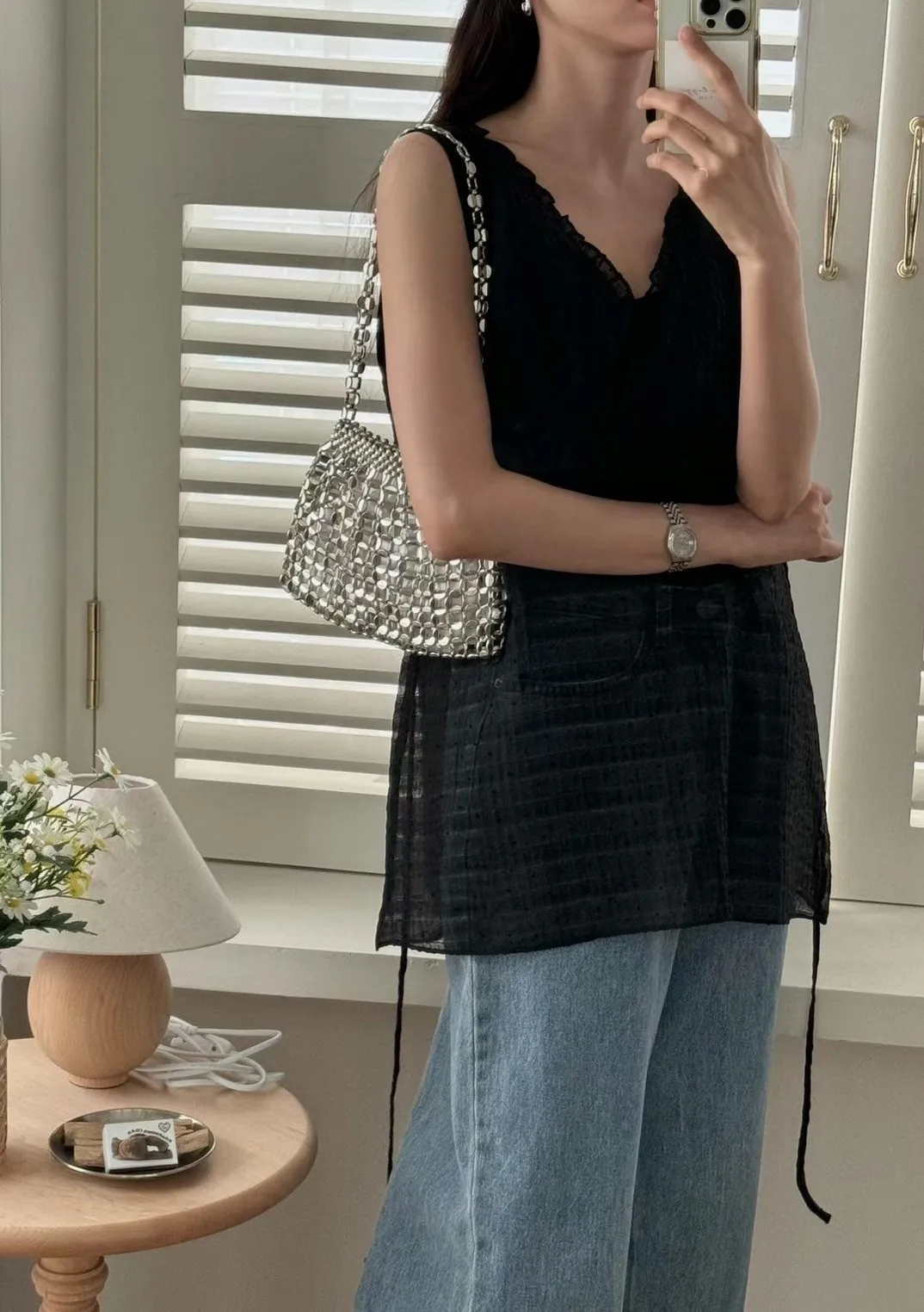 聚酯,輕盈薄款 透光罩衫 荷葉V領 腰有綁繩