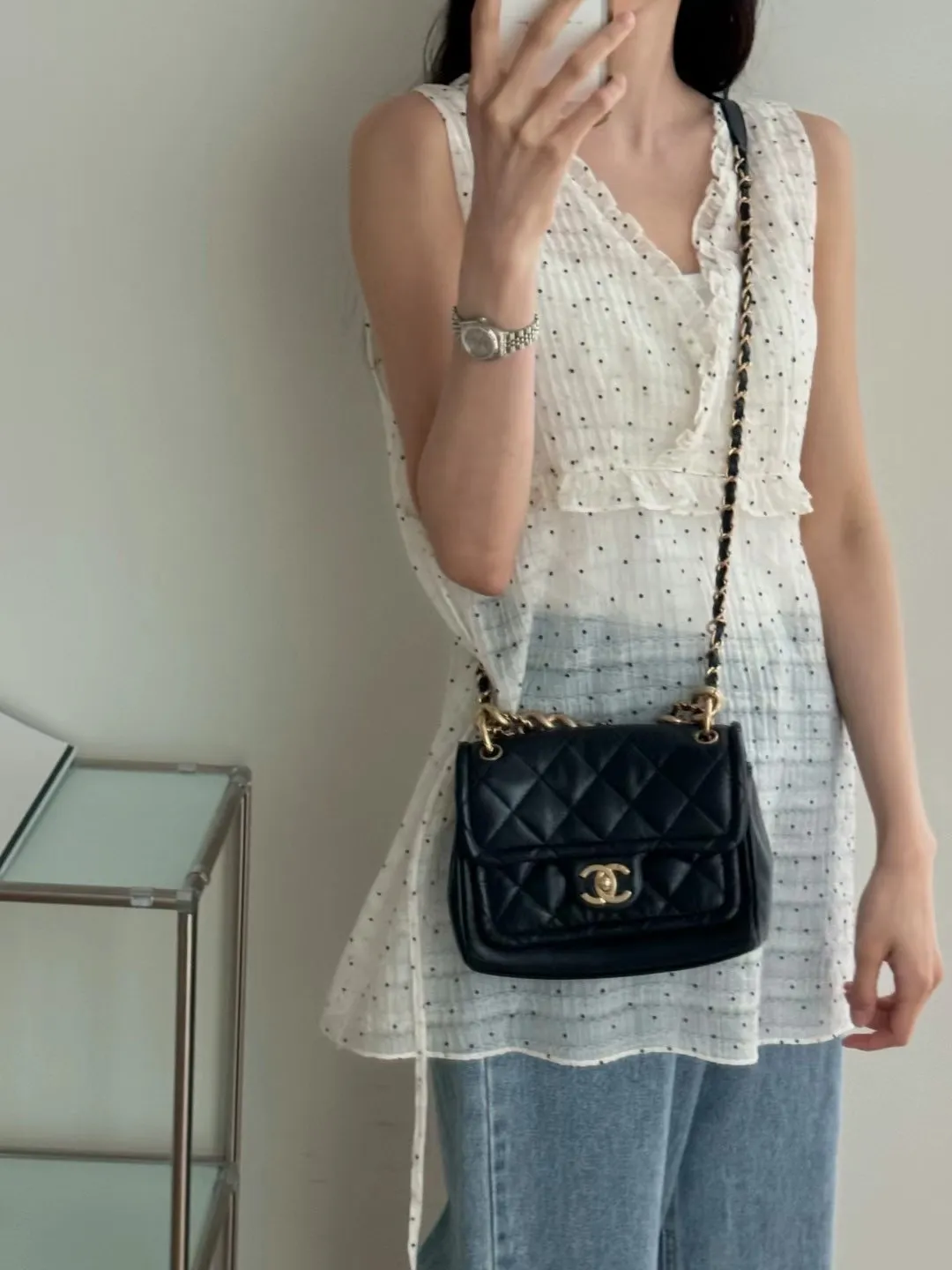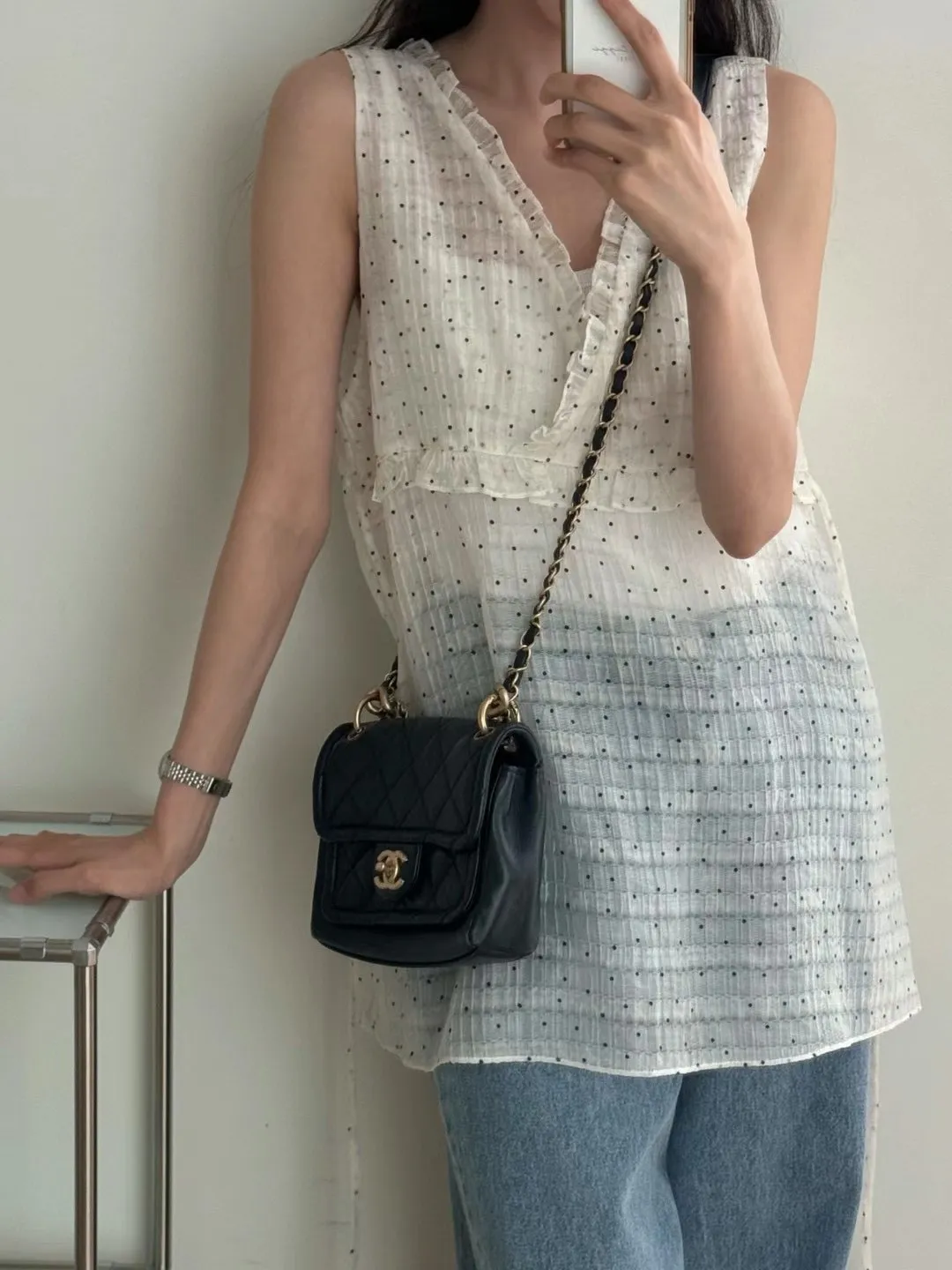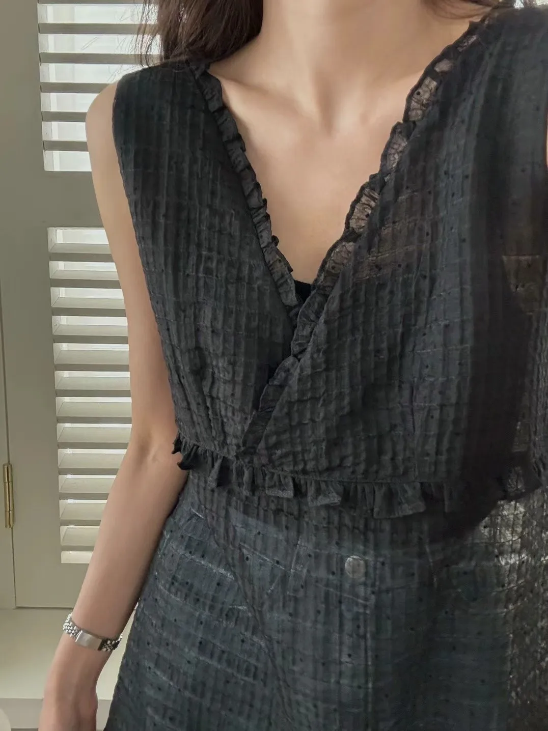 聚酯,輕盈薄款 透光罩衫 荷葉V領 腰有綁繩