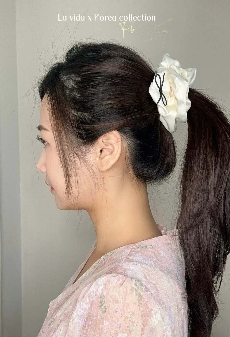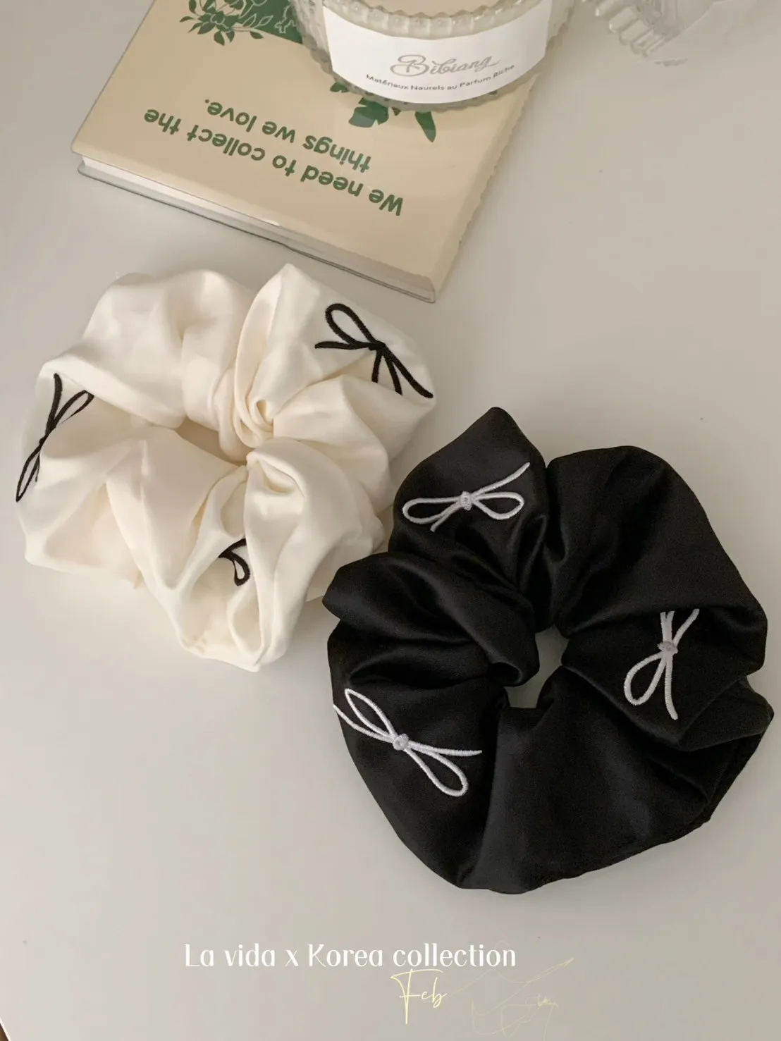 NZ220品牌感刺繡蝴蝶結緞面大腸圈 米 黑 官網價$159 永恆甜甜價$119