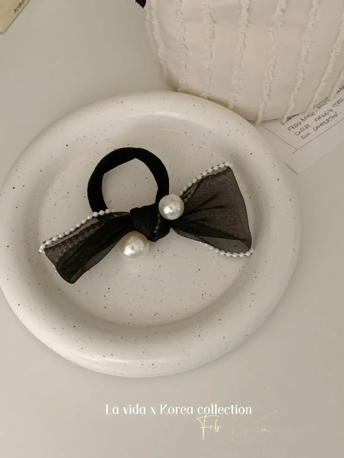 NZ248細珠滾邊透紗黑蝴蝶結髮圈