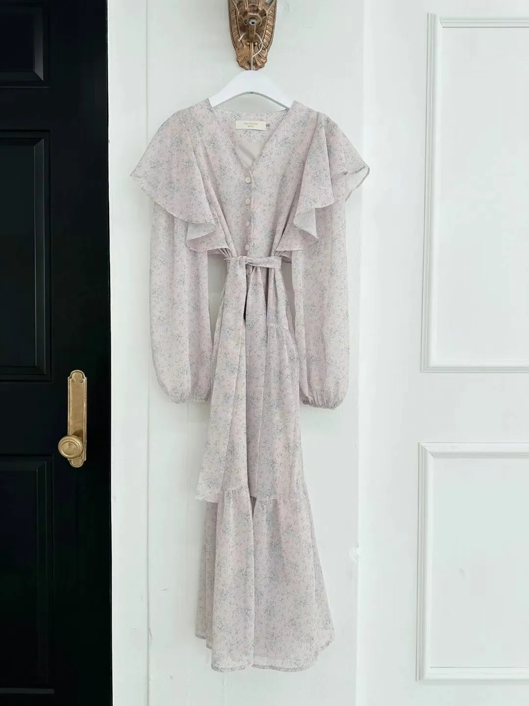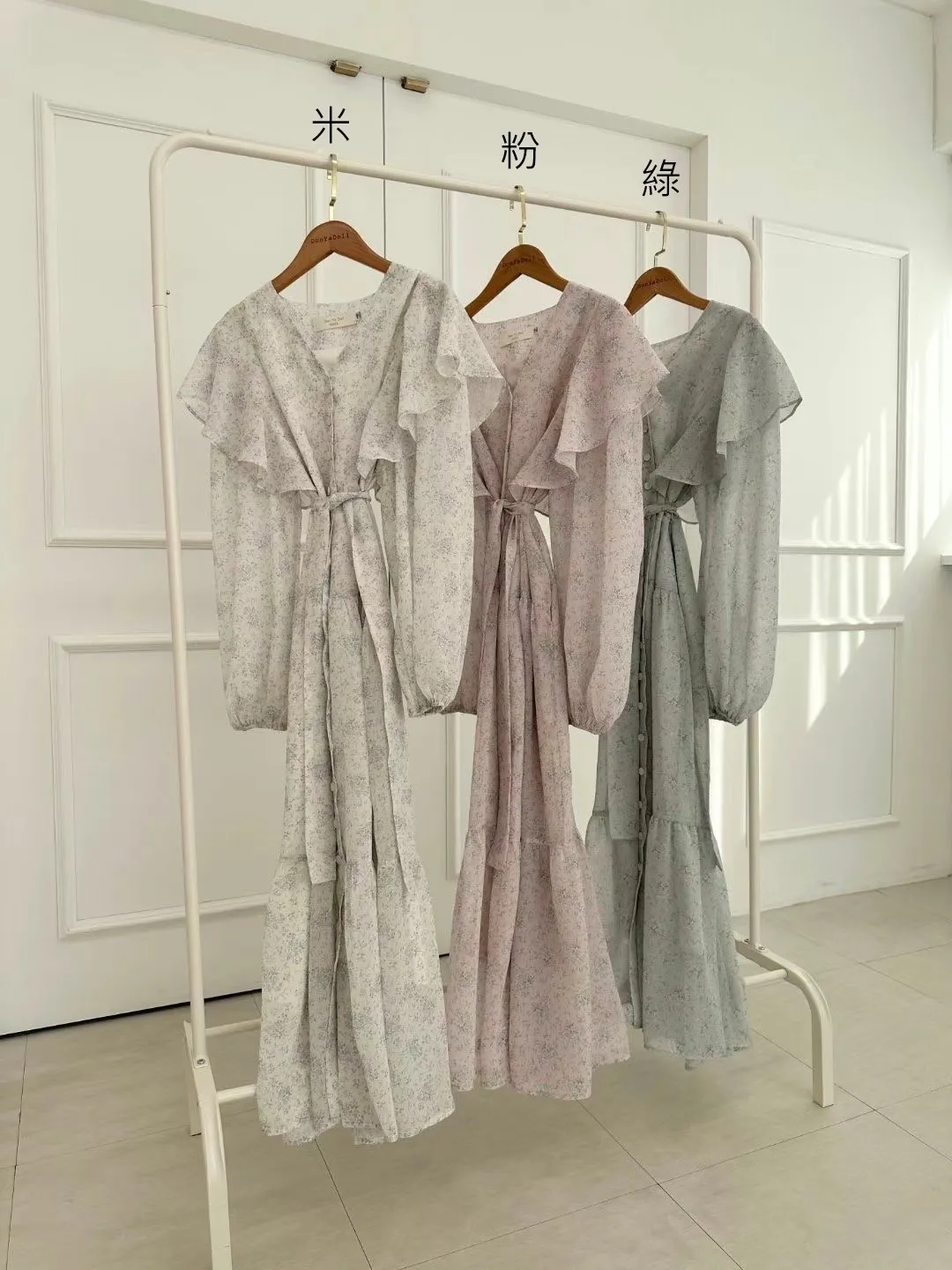 NZ363飄逸美肩袖碎花洋裝(附綁帶) 米 綠 粉 官網價$1780 永恆甜甜價$1750
