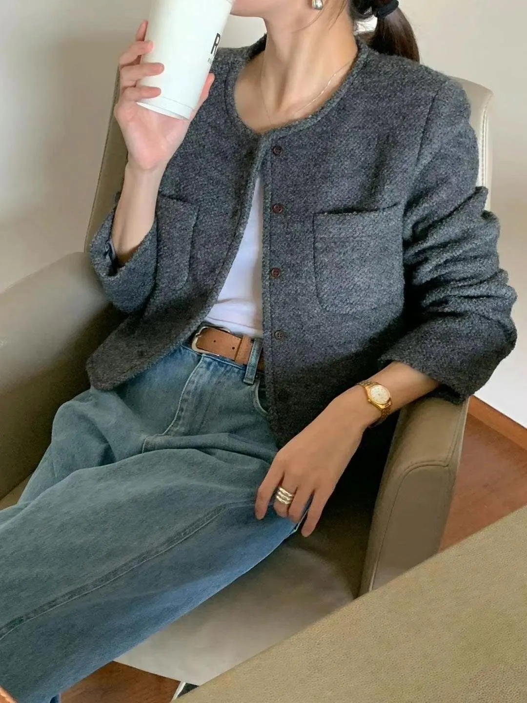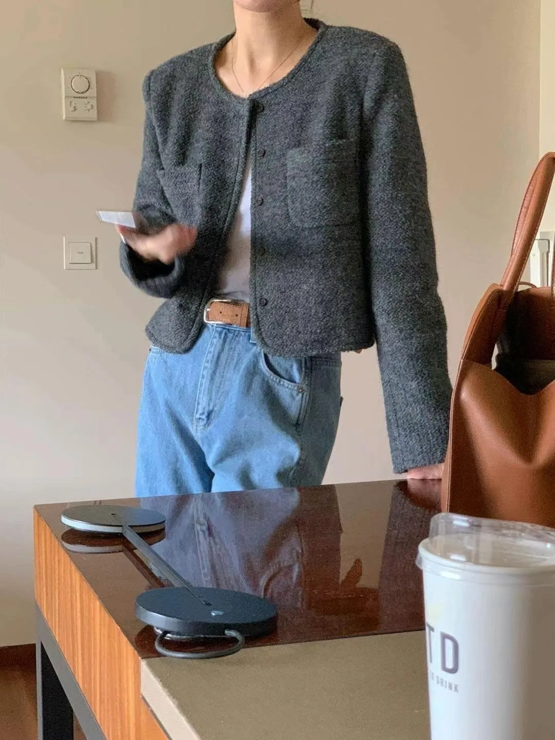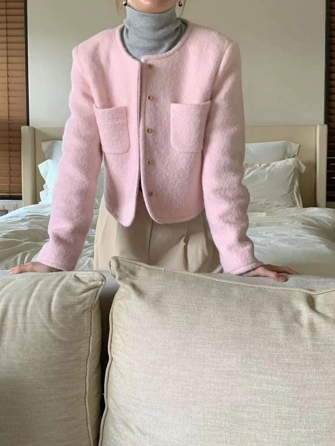 羊毛50%+聚酯 輕盈不易皺 秀氣木釦 微墊肩有內裡 穿到M號