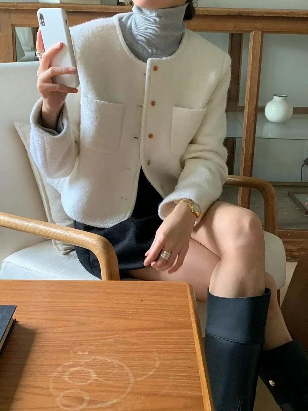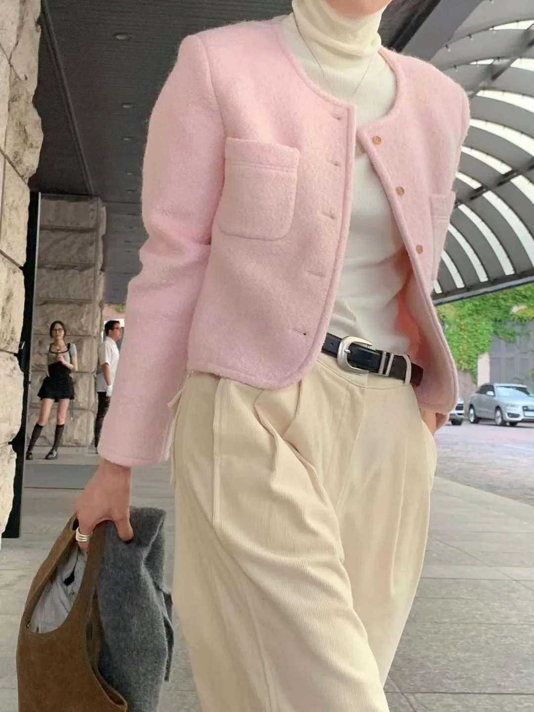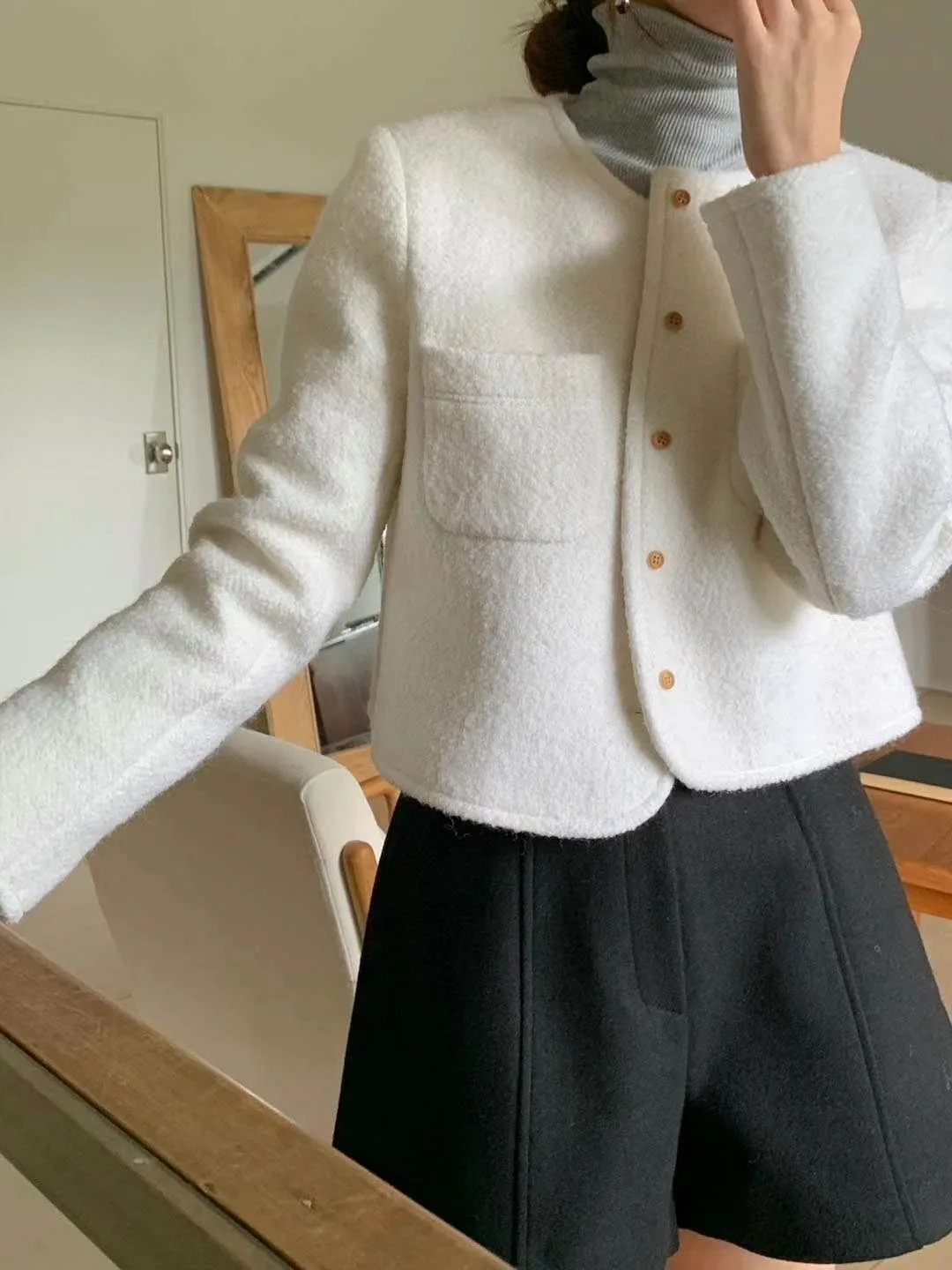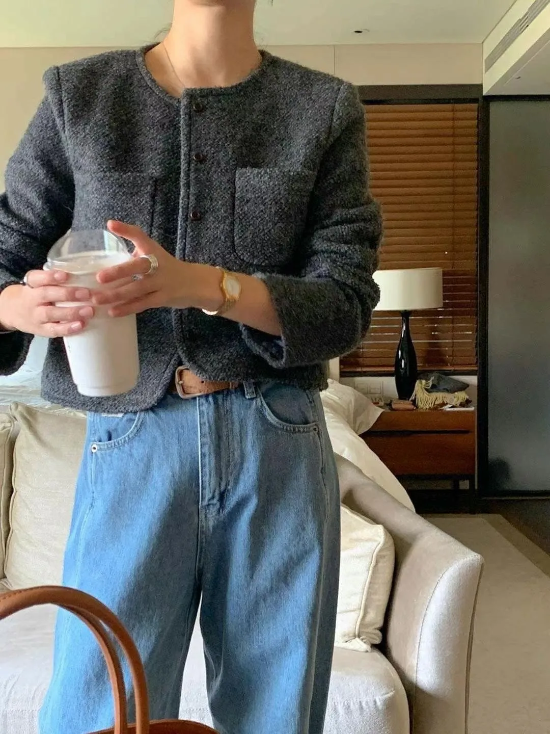 羊毛50%+聚酯 輕盈不易皺 秀氣木釦 微墊肩有內裡 穿到M號