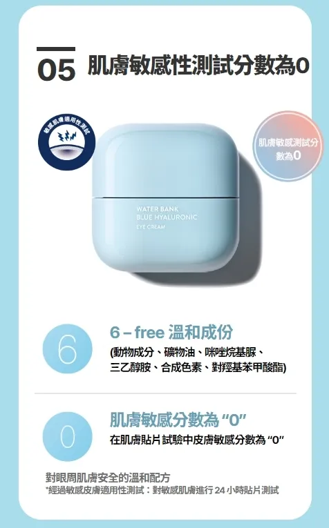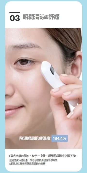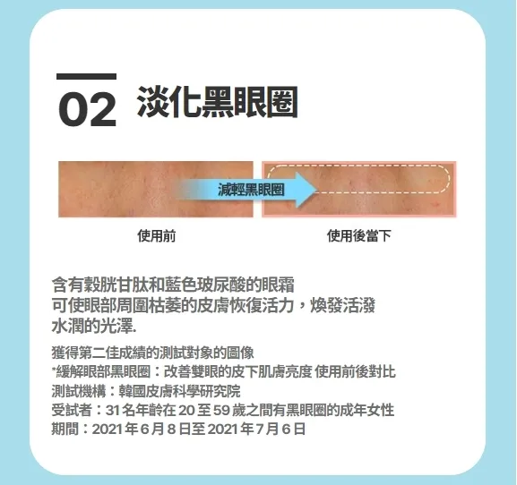 谷胱甘肽和藍色透明質酸,可改善黑眼圈,展現水潤光澤