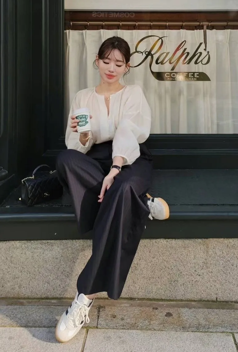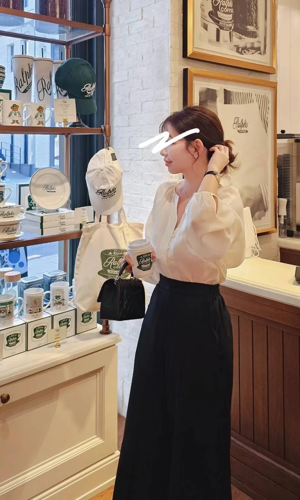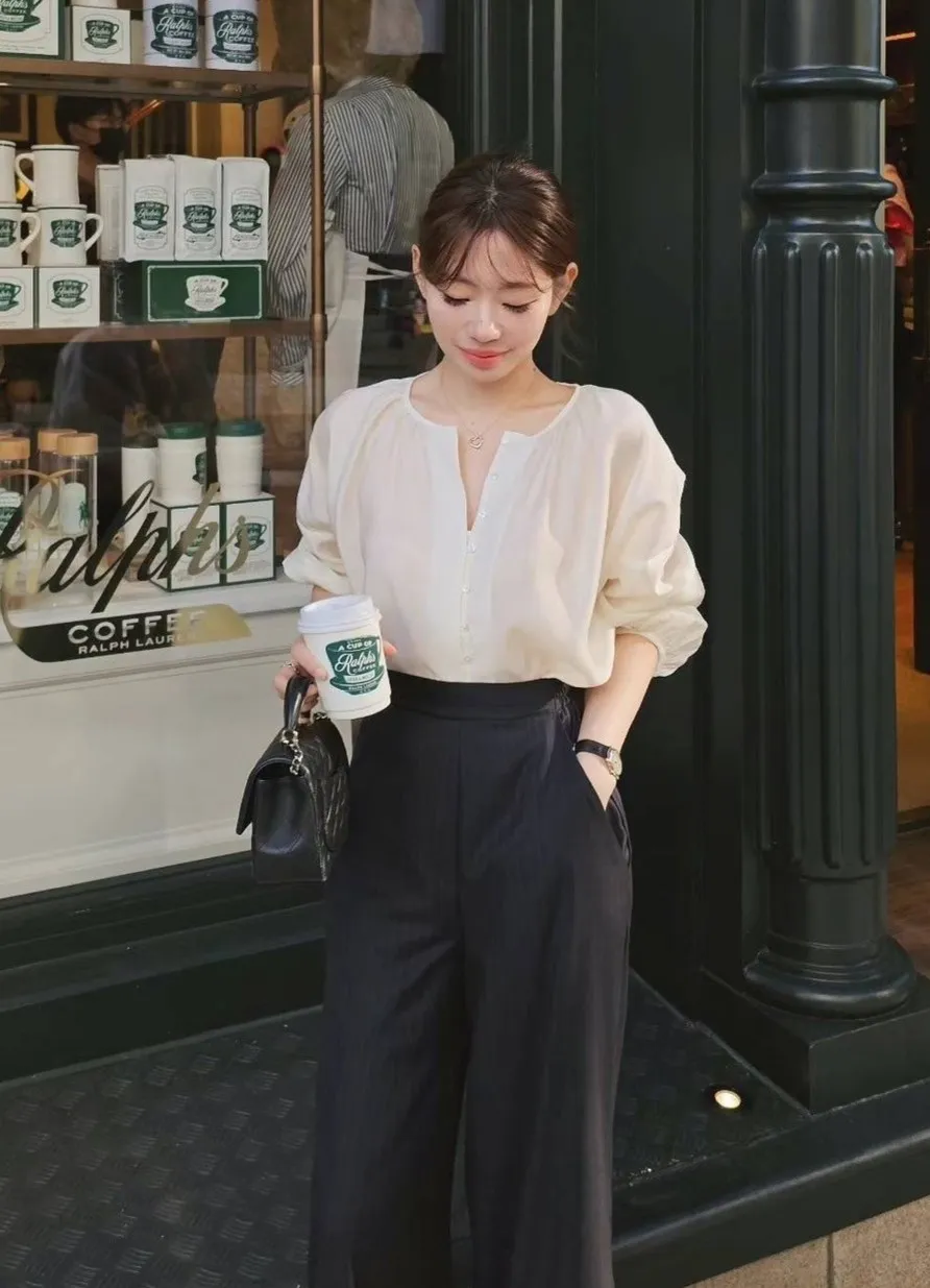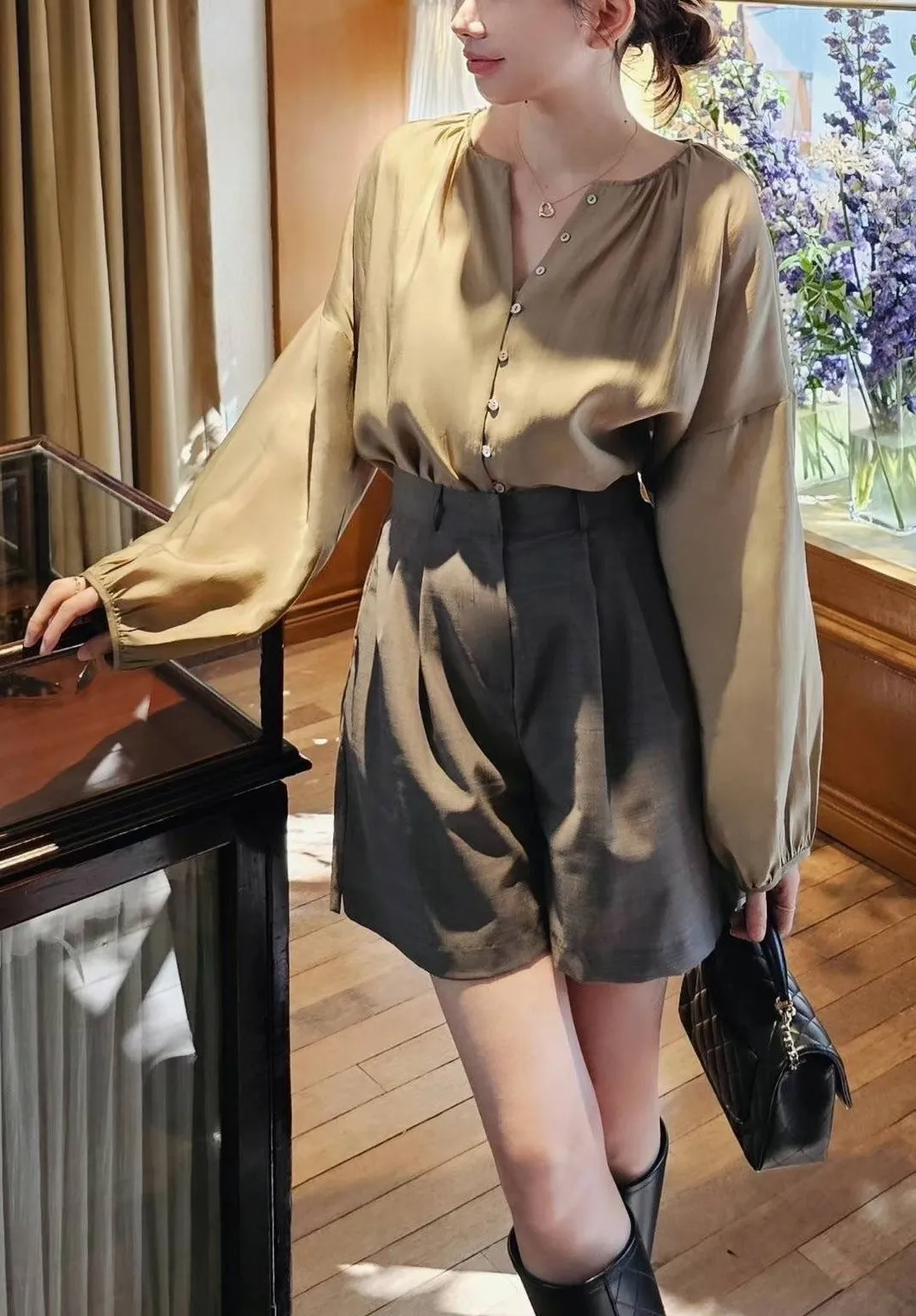 天絲85%+聚酯 領邊細摺V領 氣質微澎袖型 面料細緻微光澤