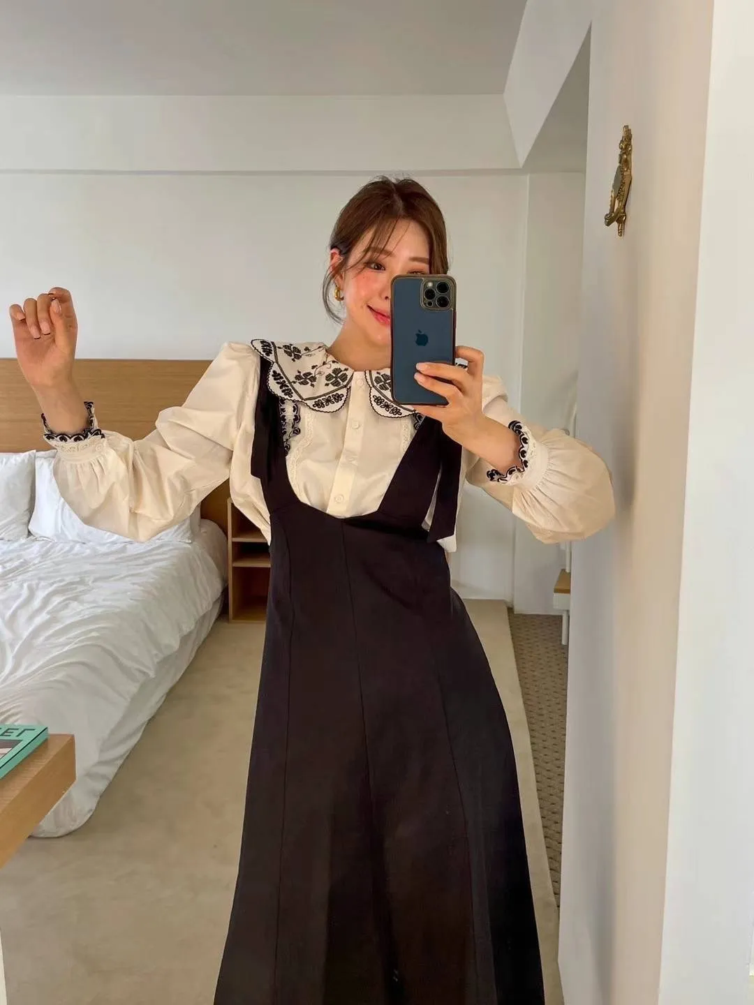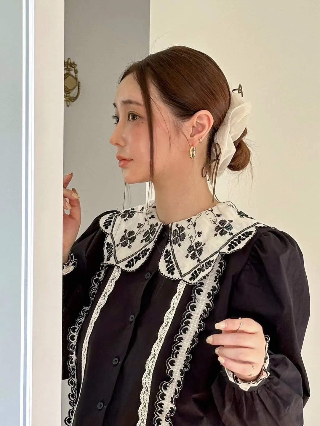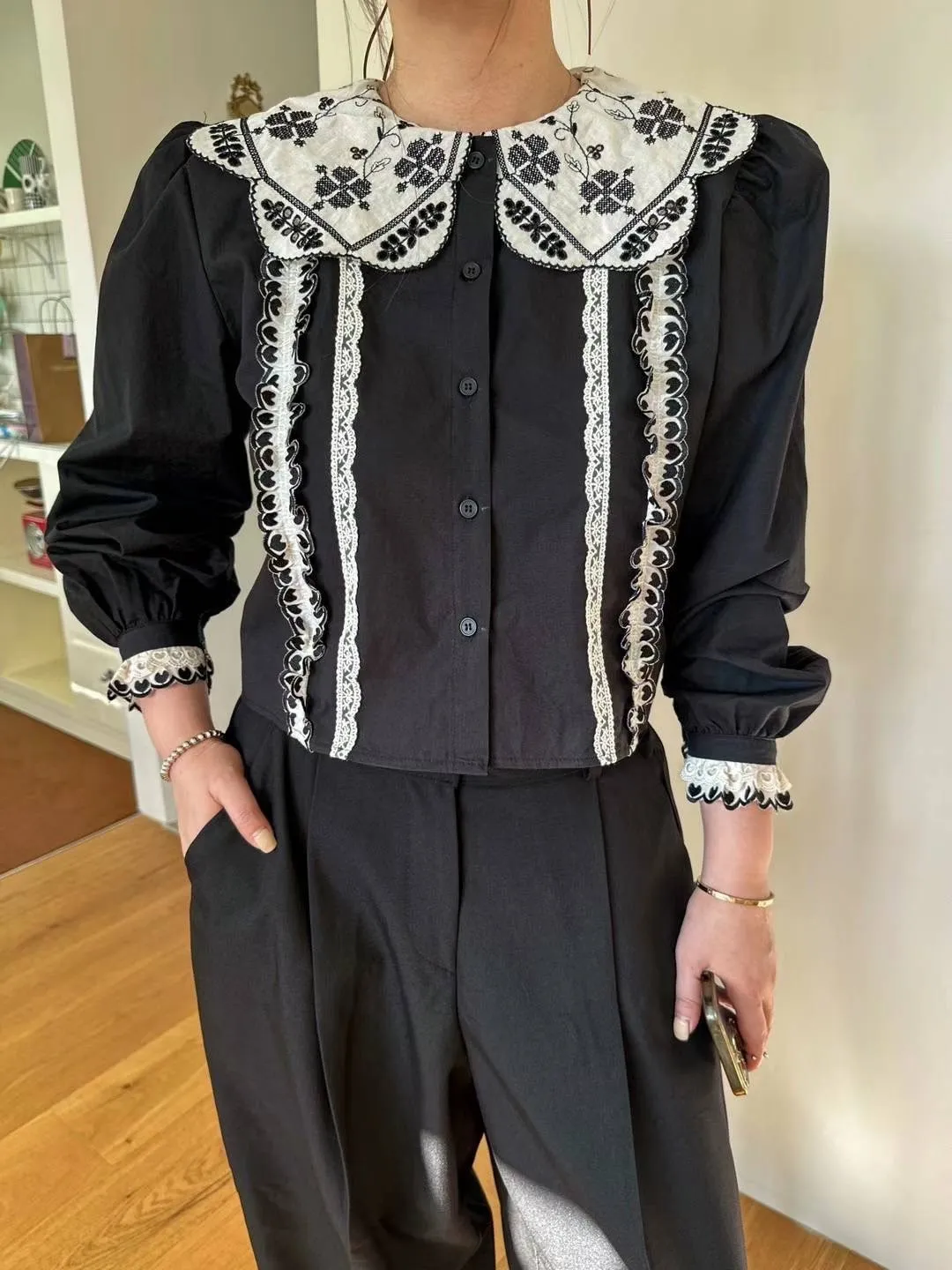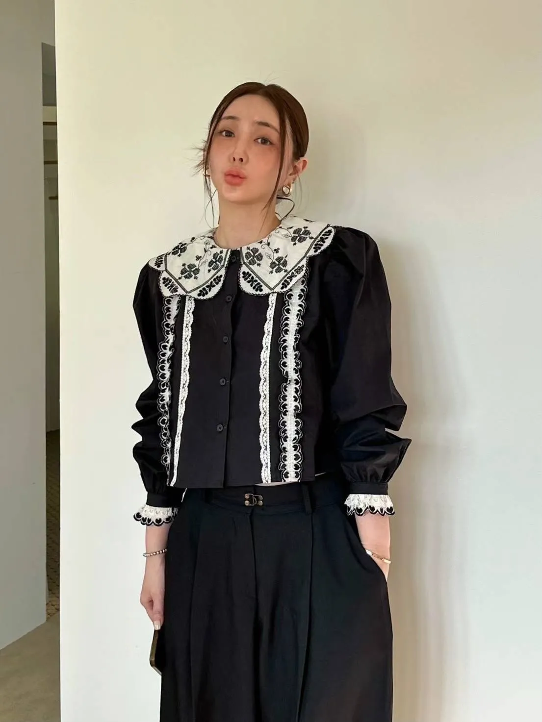 棉 幸運草刺繡 宮廷感翻領 愛心層次手袖 排釦穿脫