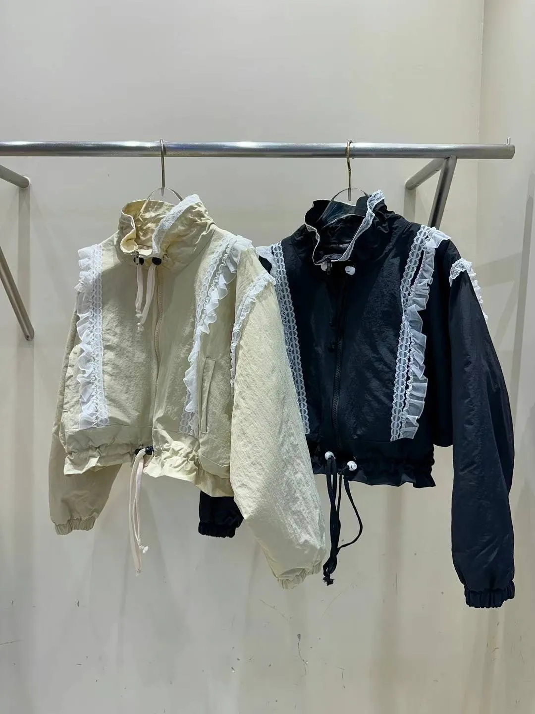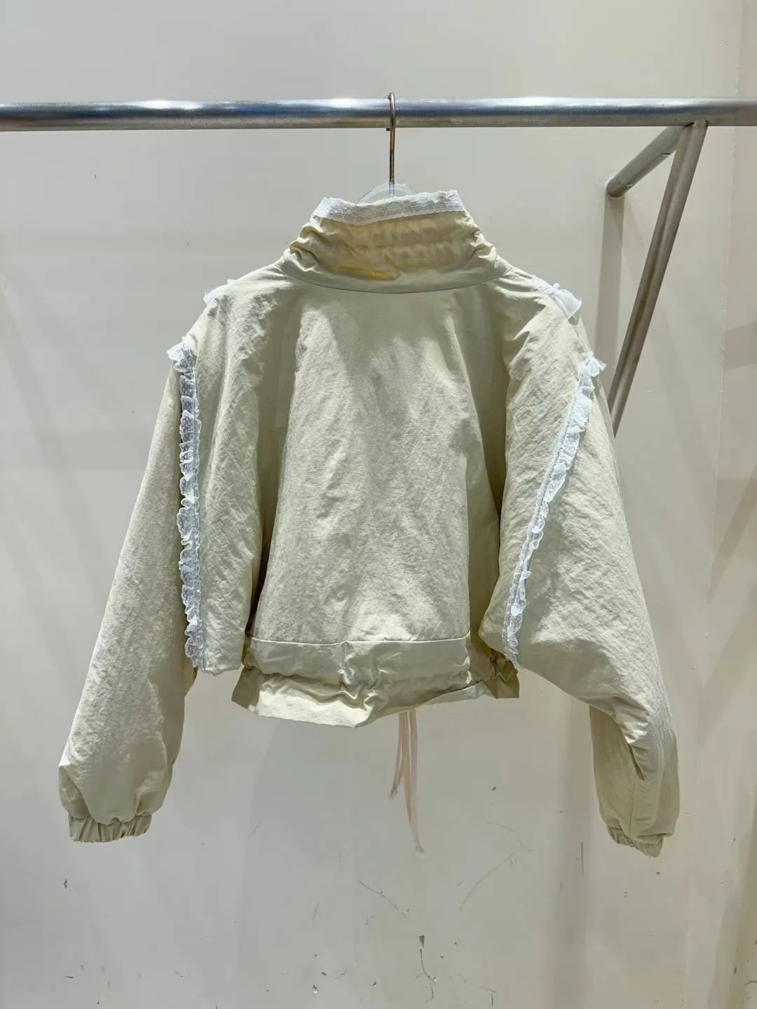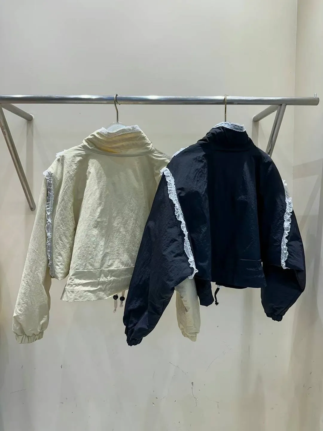 聚酯+尼龍+蕾絲 立領抽繩 拉鍊穿脫 縮腰設計 手袖鬆緊 有口袋