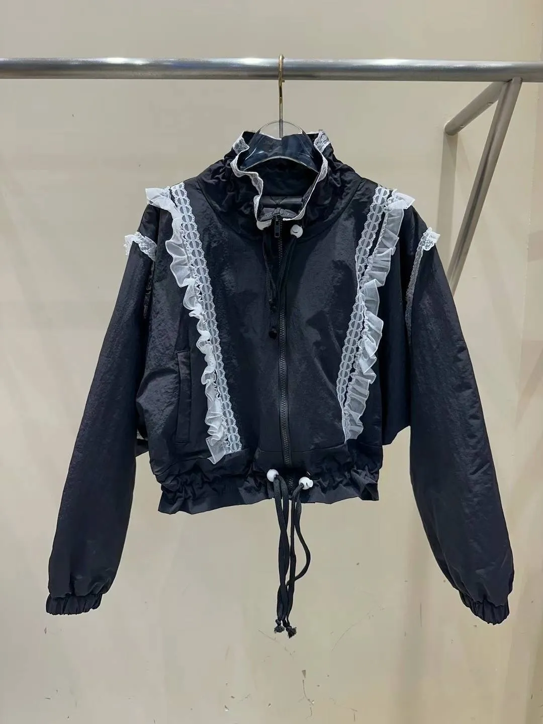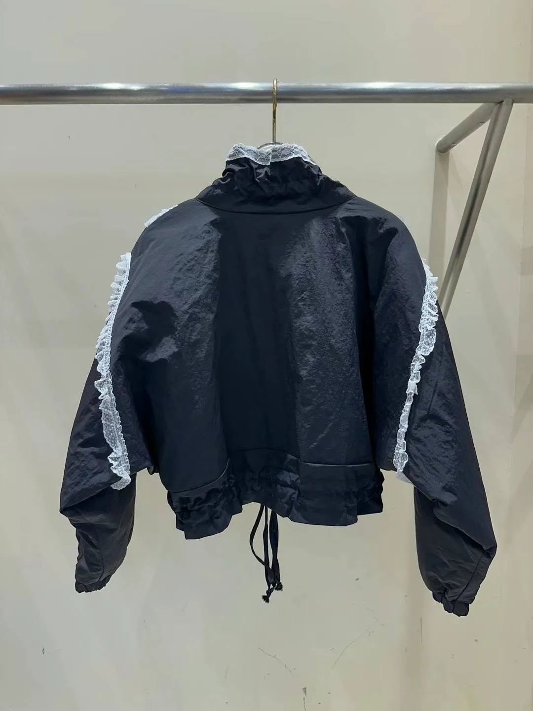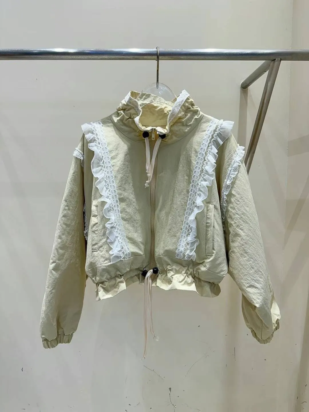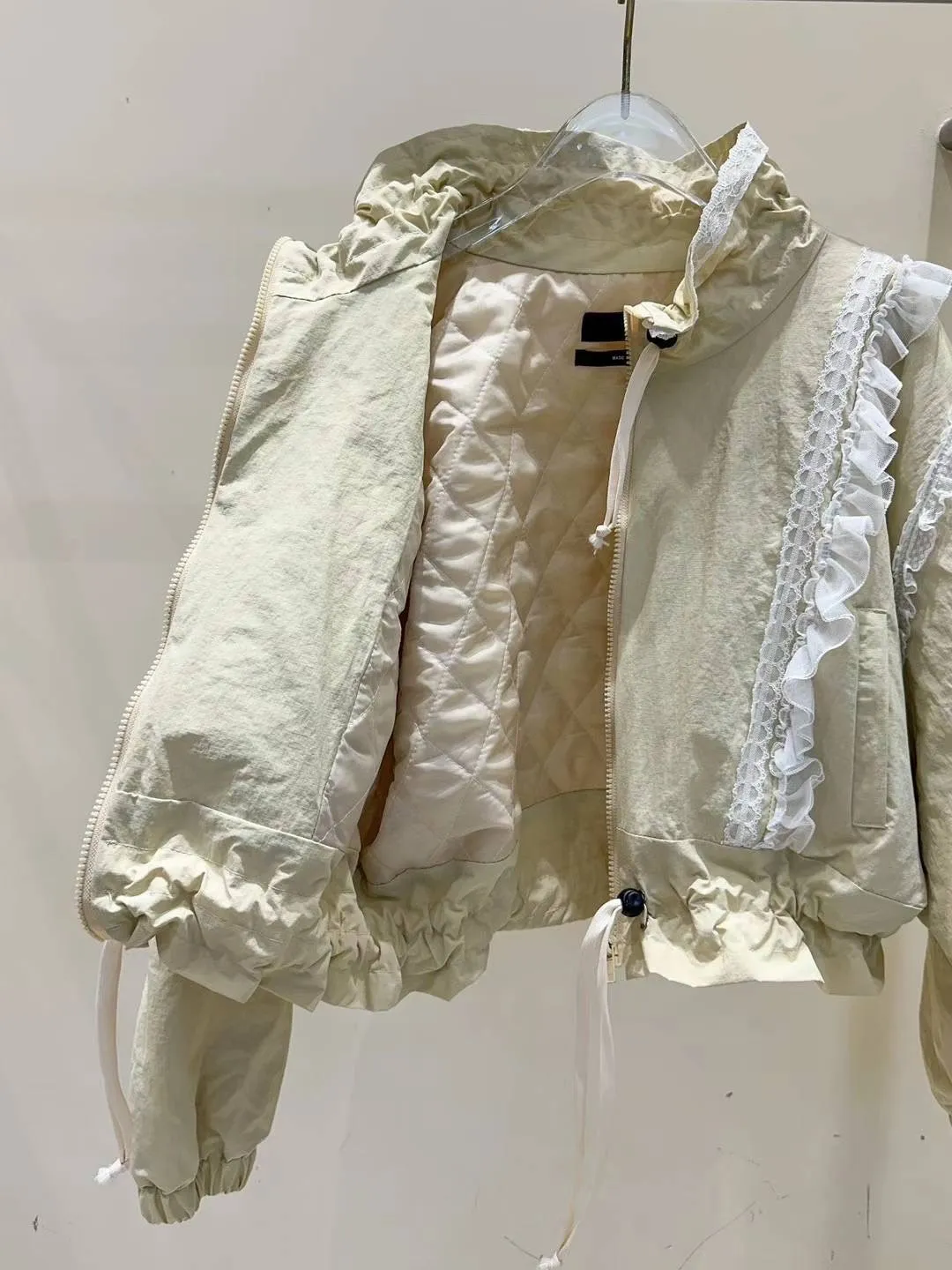 聚酯+尼龍+蕾絲 立領抽繩 拉鍊穿脫 縮腰設計 手袖鬆緊 有口袋