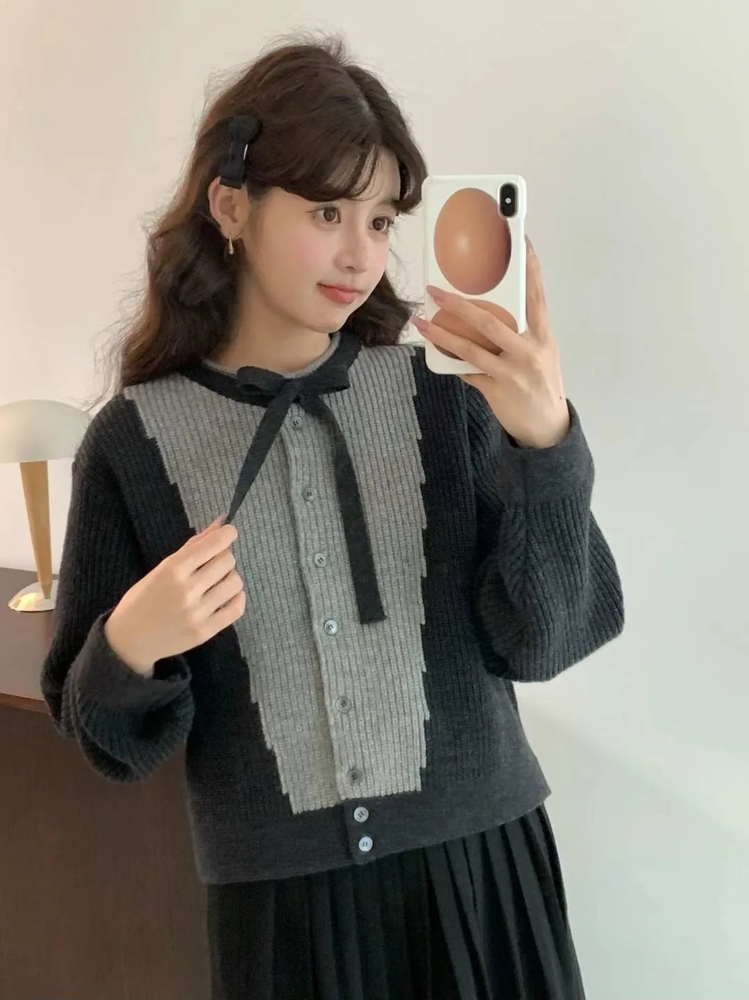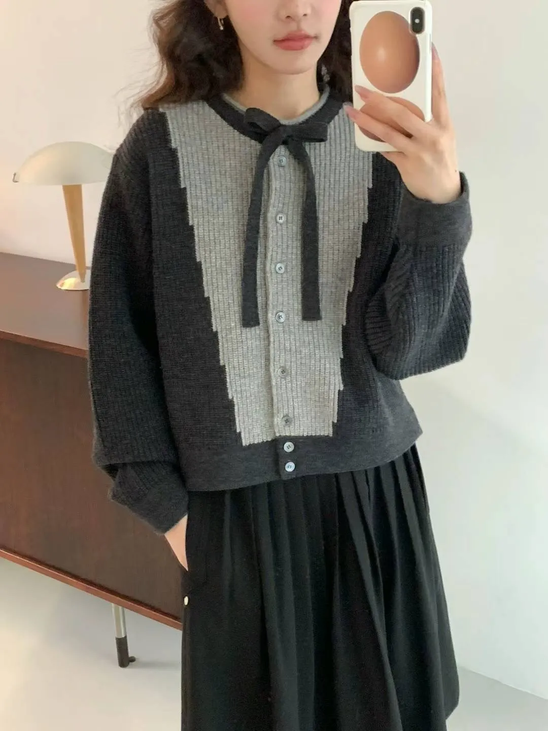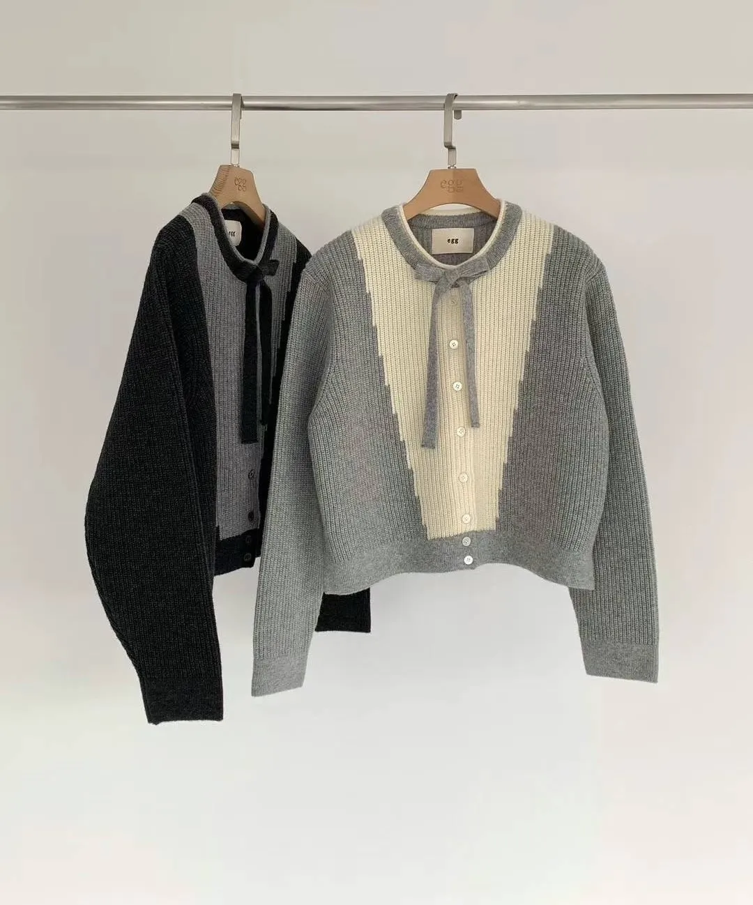 超級羊毛 親膚舒適 胸前蝴蝶結 排釦穿脫 雙色V顯瘦設計 貝殼釦