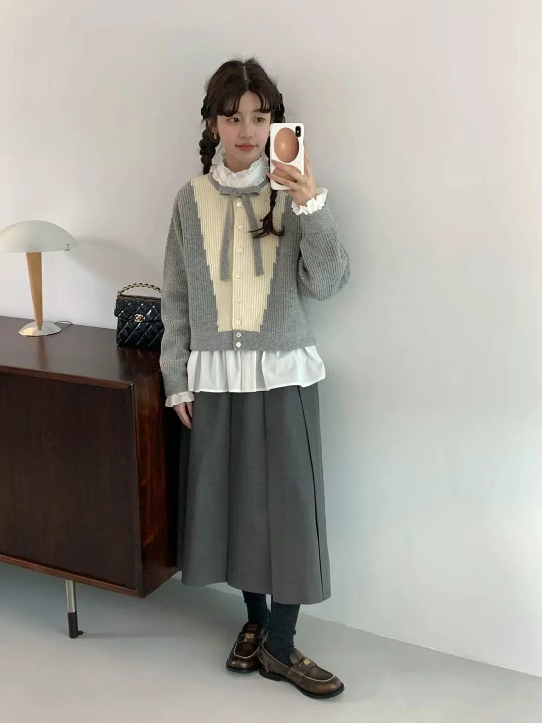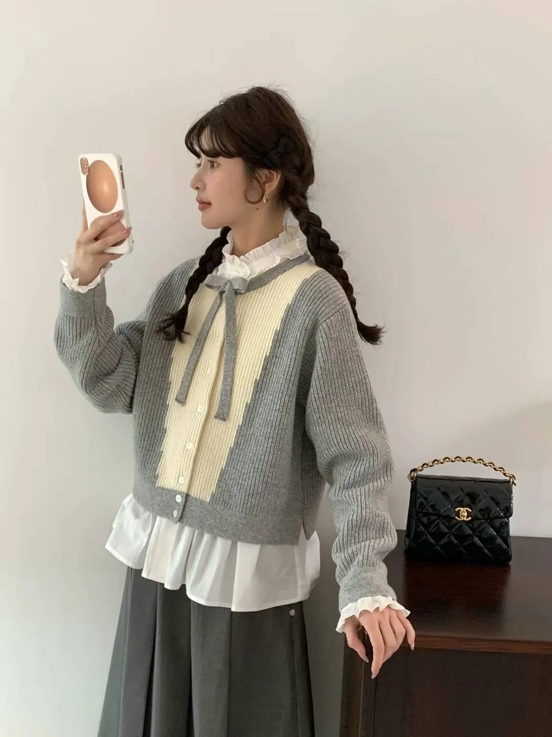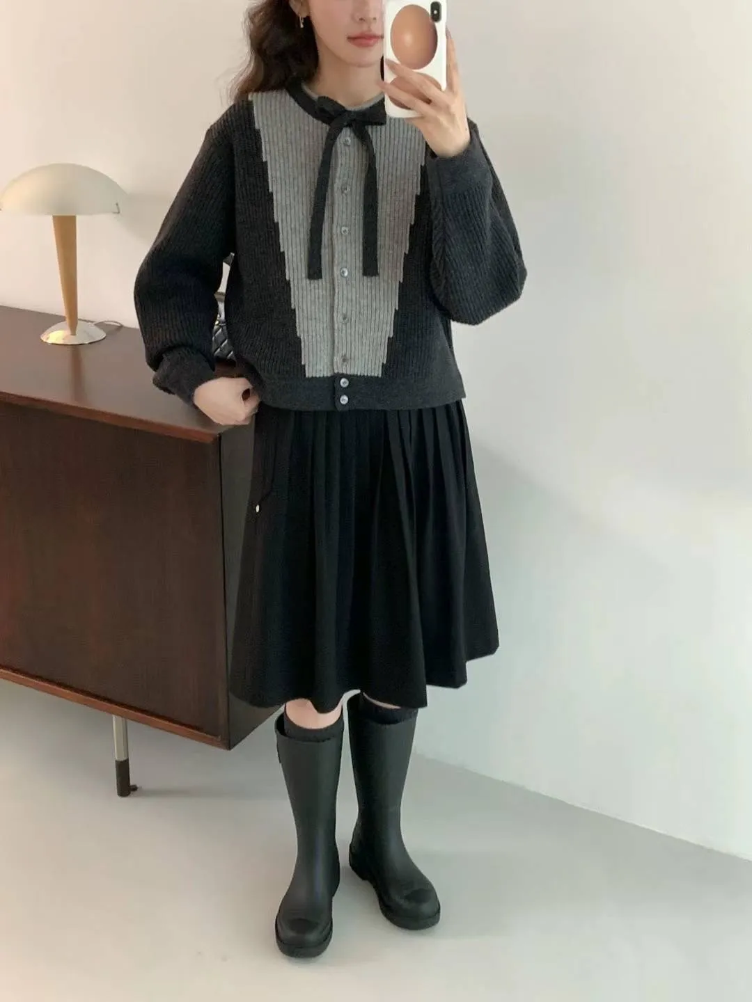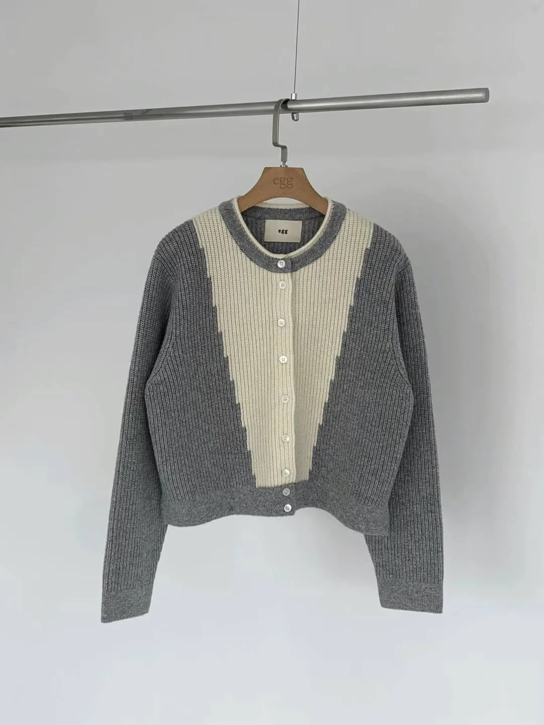 超級羊毛 親膚舒適 胸前蝴蝶結 排釦穿脫 雙色V顯瘦設計 貝殼釦