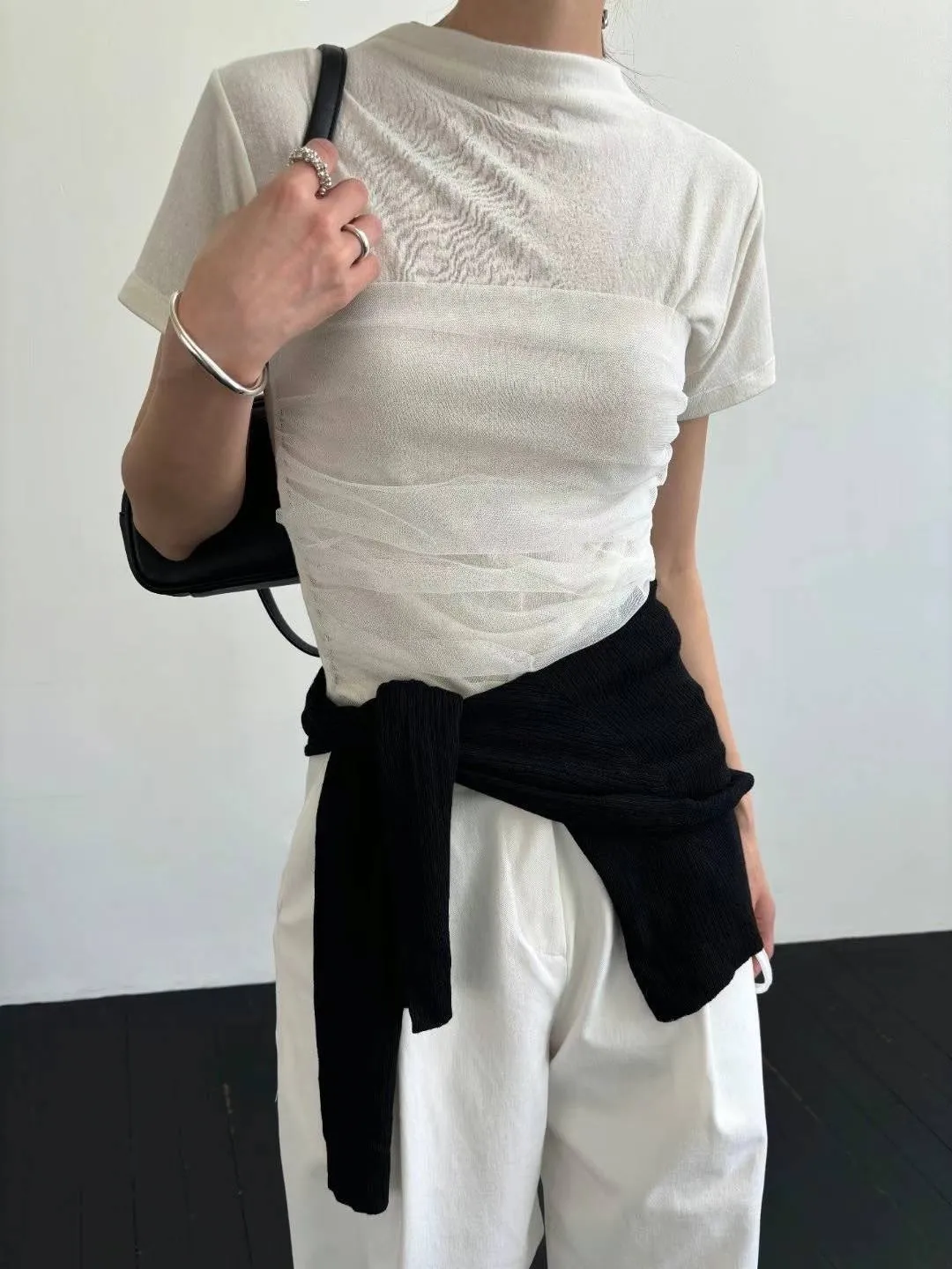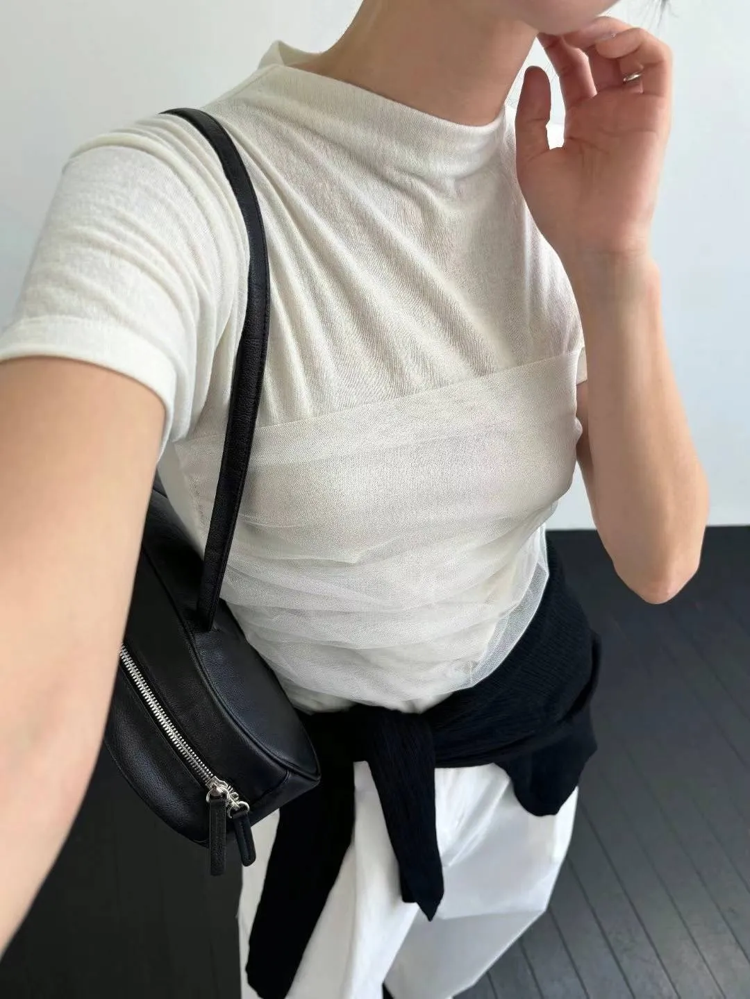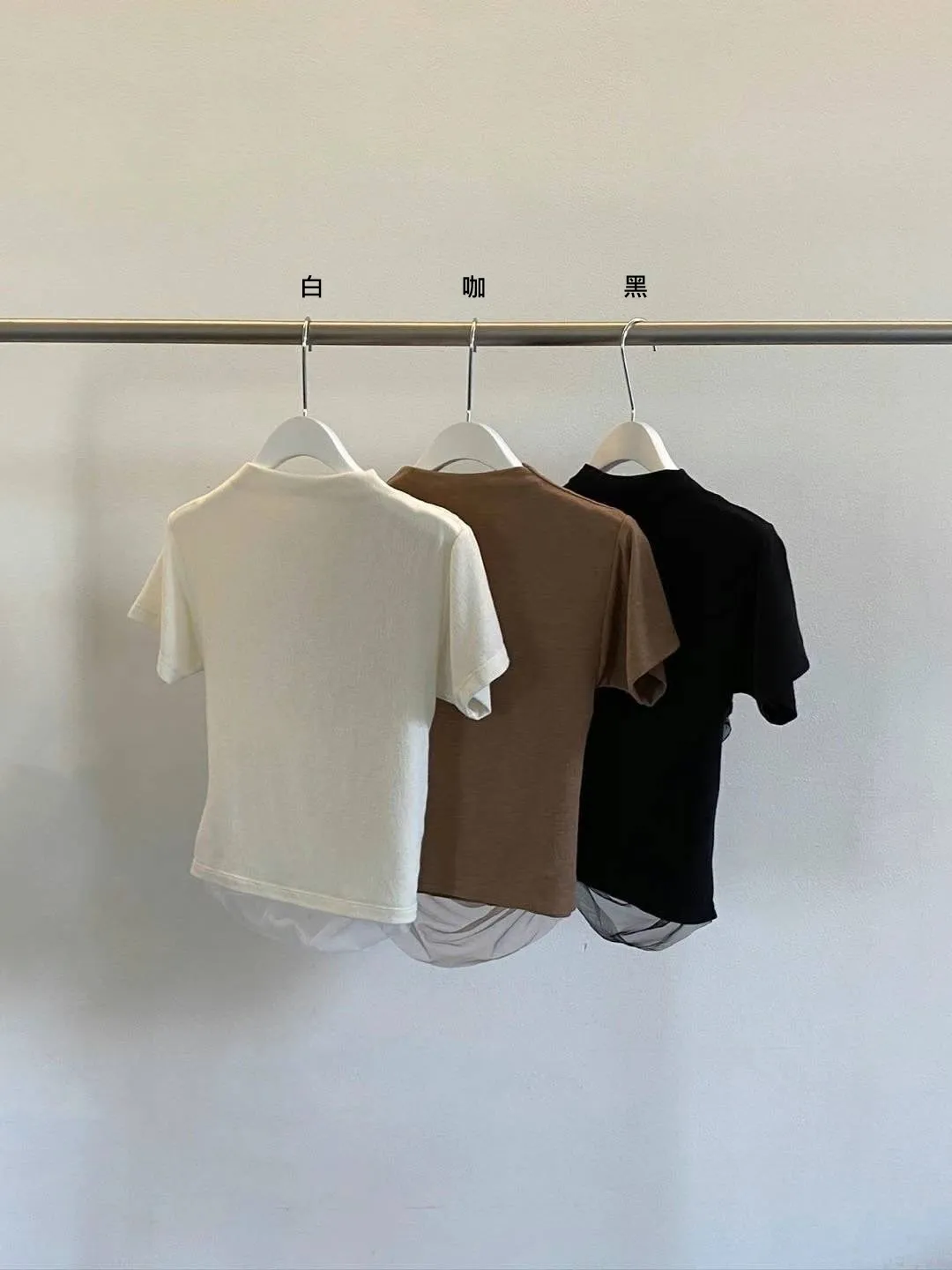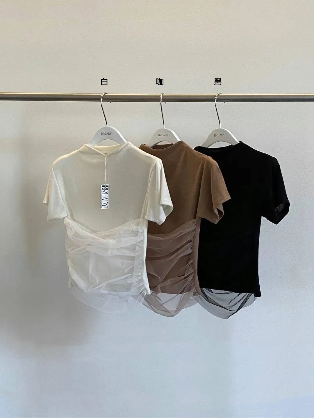 PC465網紗雲朵層次短袖上衣 白 咖 黑 官網價$470 線上價$440
