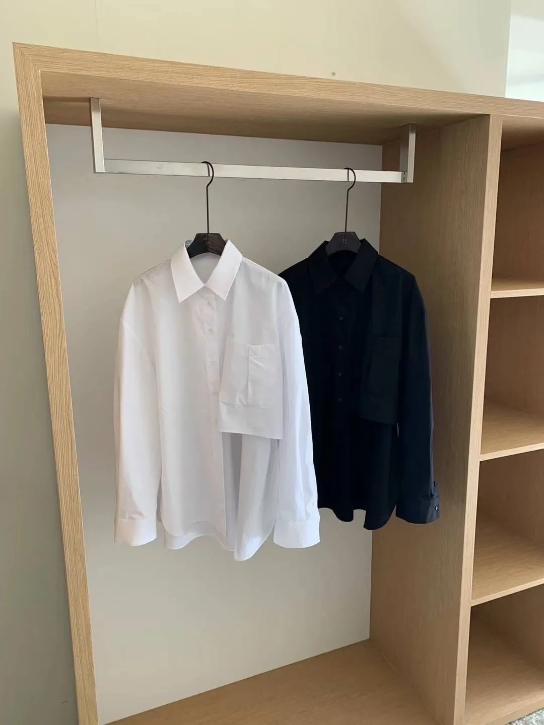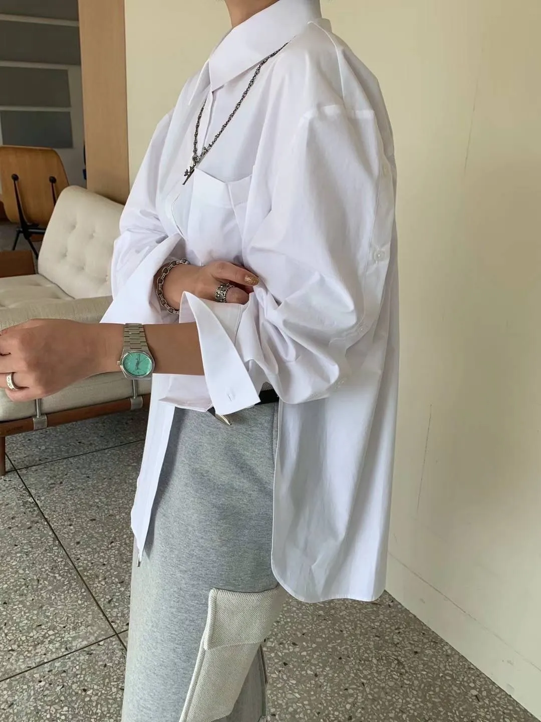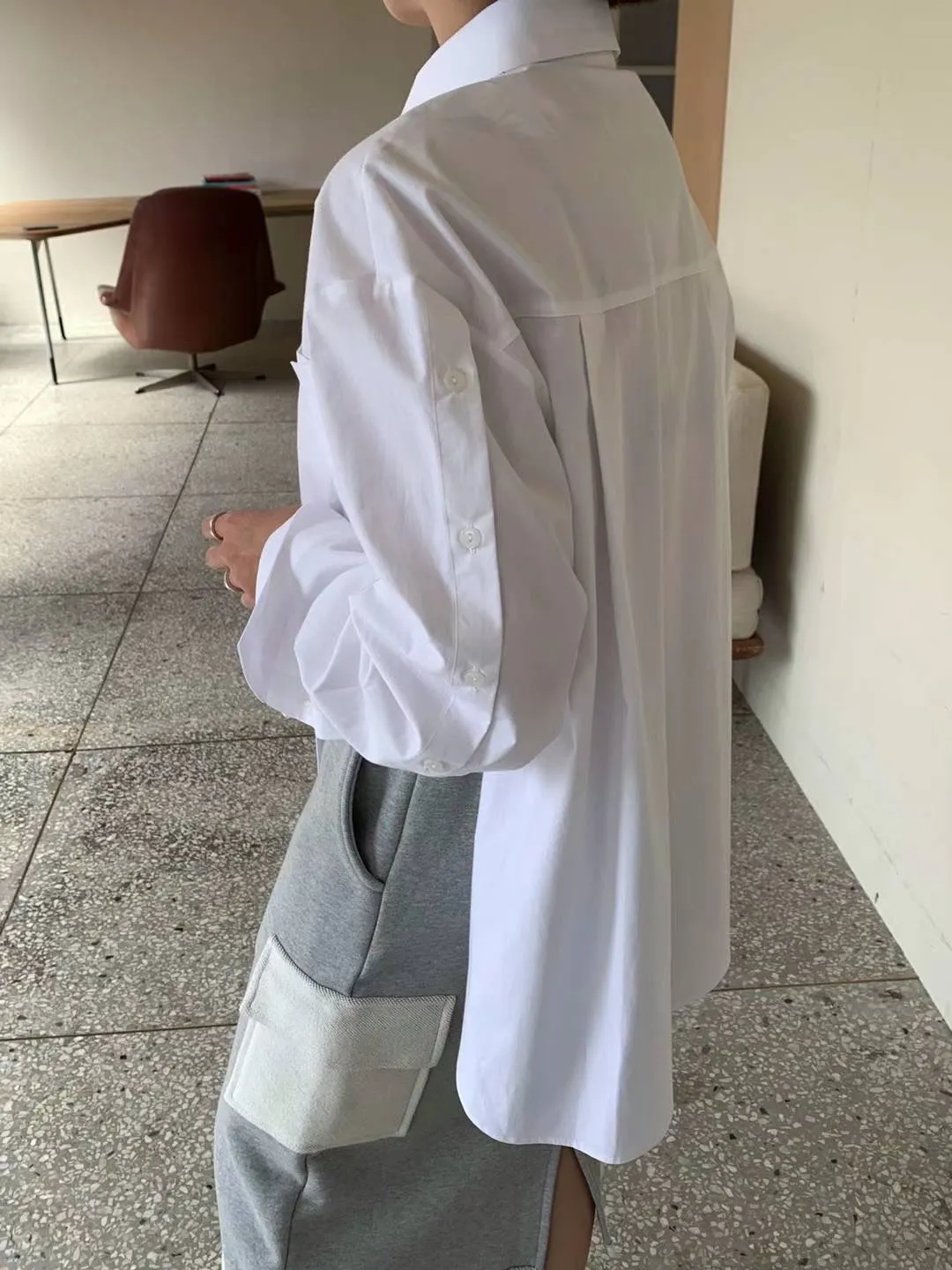 棉100% 四季款 落肩版型 袖子排扣 背面抓皺 側開岔前短後長 白色不透