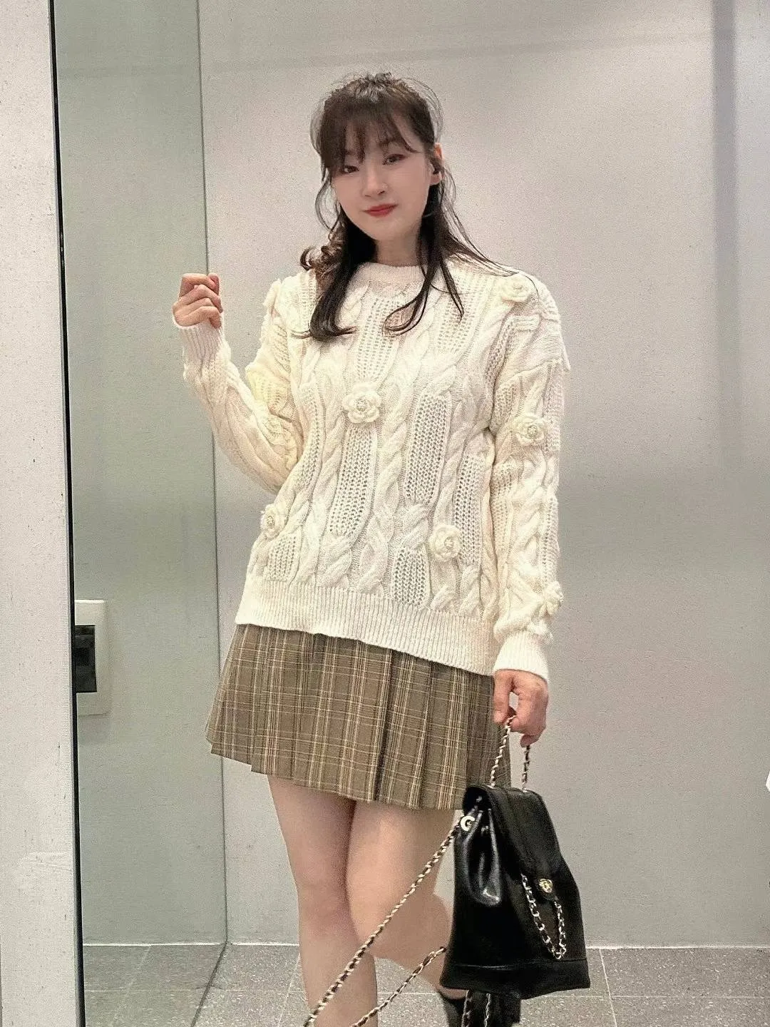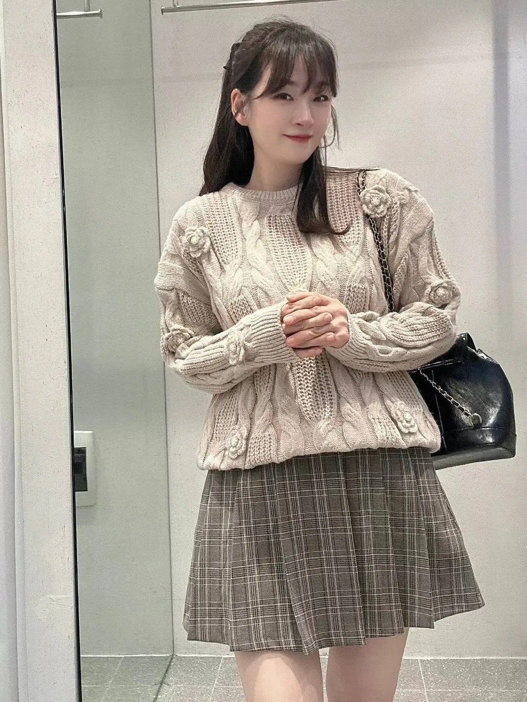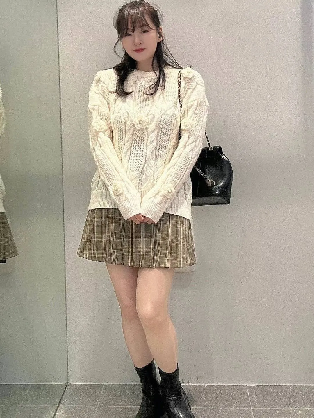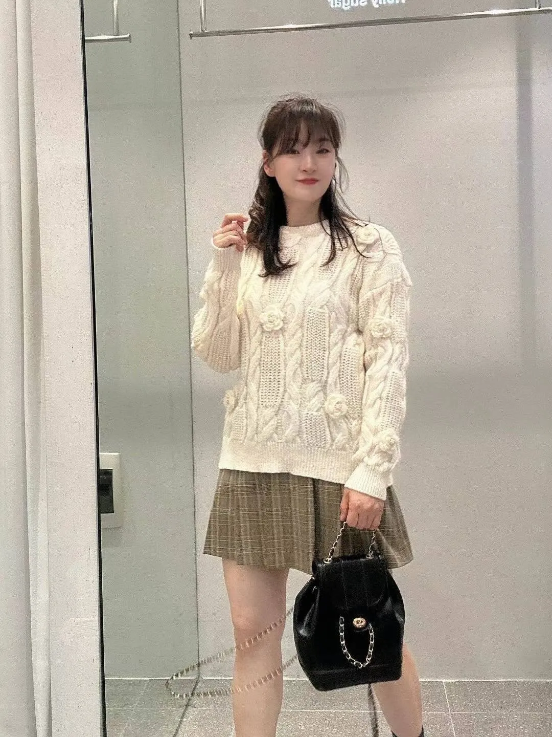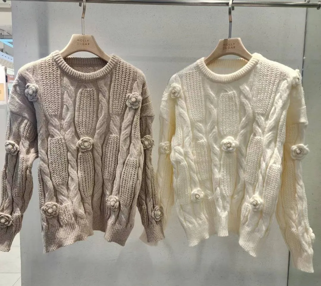 棉+人造絲 立體花朵 金邊珍珠蕊心 親膚無羊毛 穿到M號