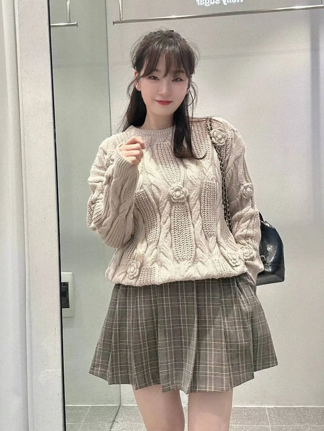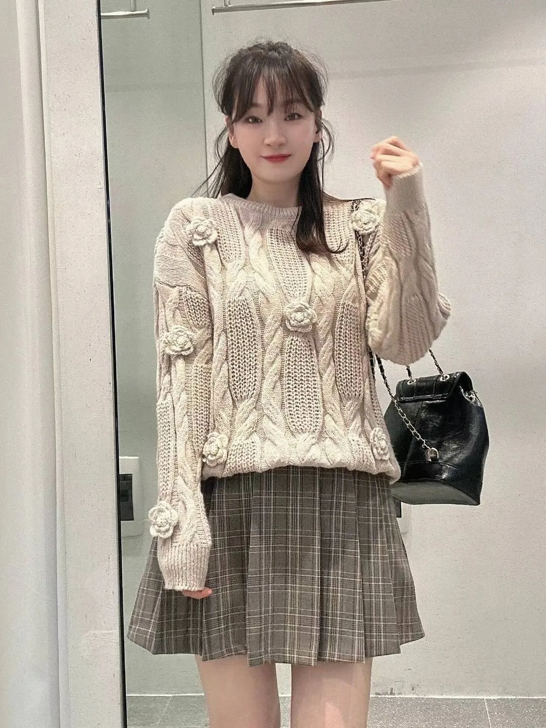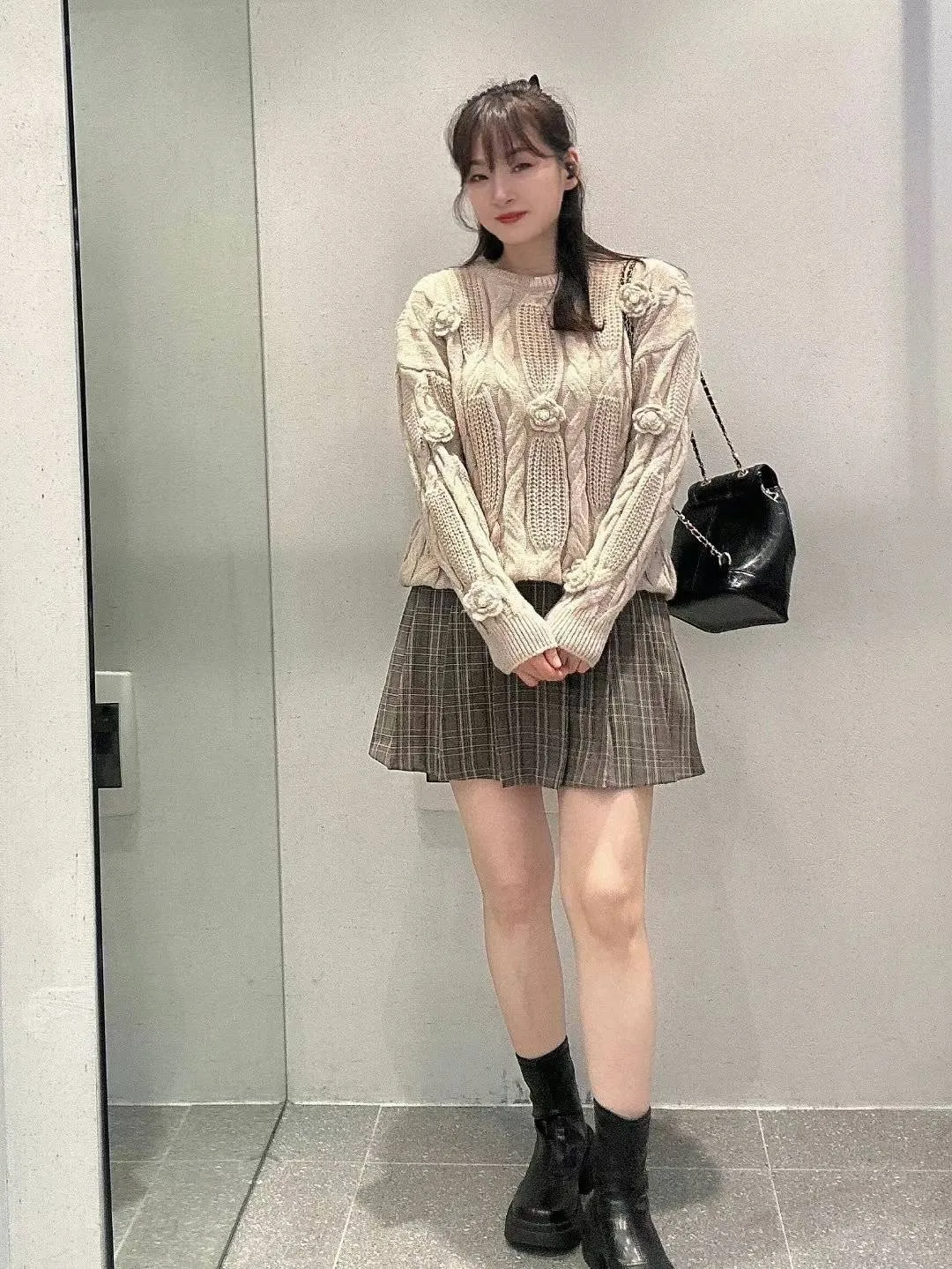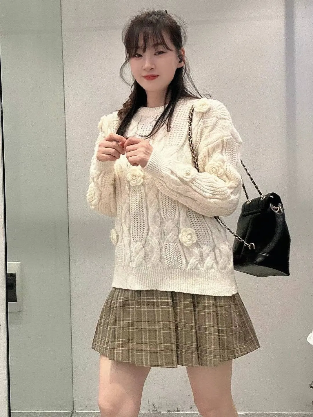 棉+人造絲 立體花朵 金邊珍珠蕊心 親膚無羊毛 穿到M號