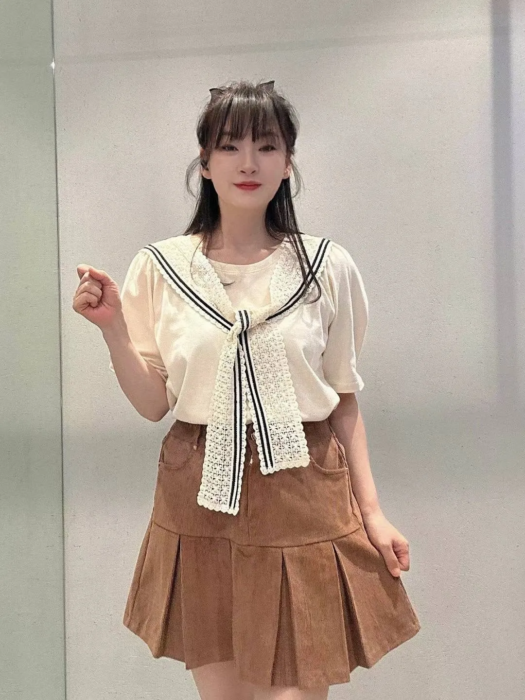 棉+聚酯 體感舒服 精緻蕾絲水手翻領 披肩不可拆