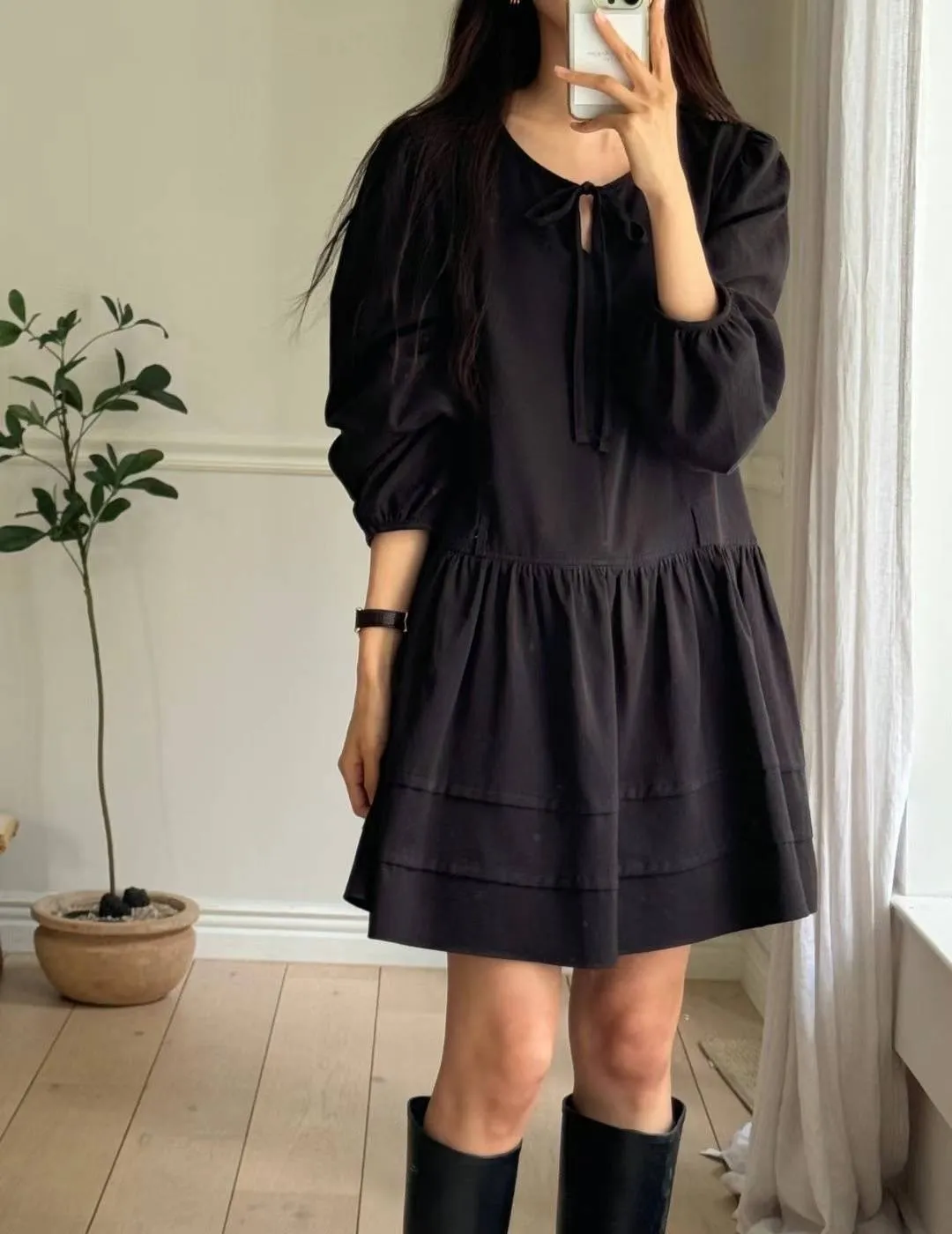 PC641蝴蝶結綁帶蛋糕洋裝 米 奶茶 黑 官網價$1450 線上價$1420