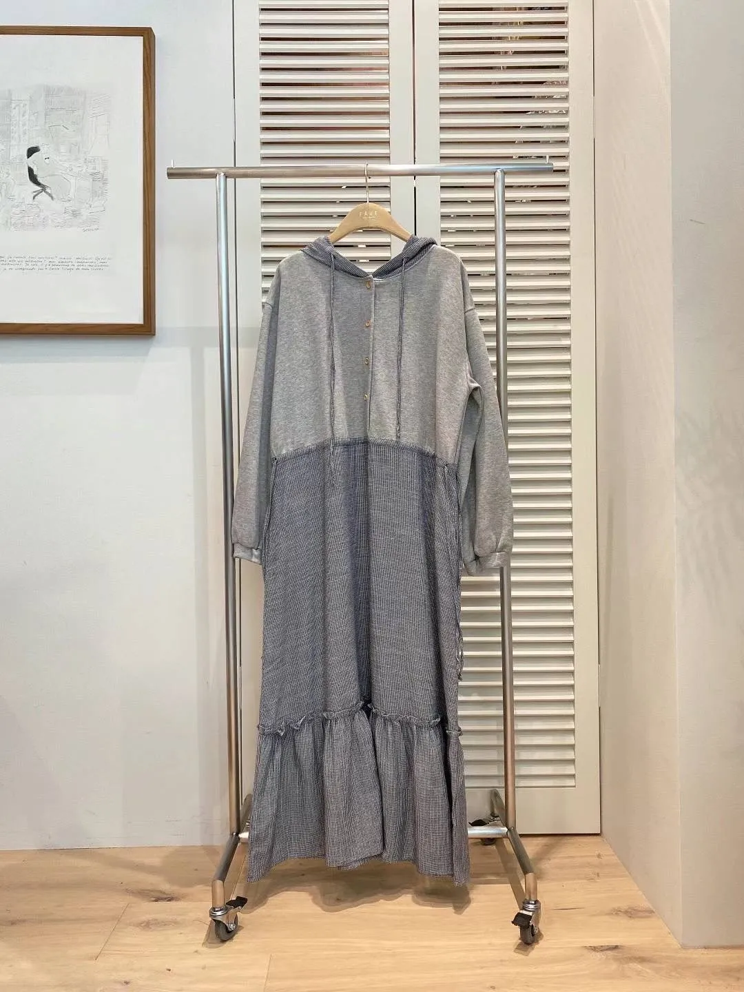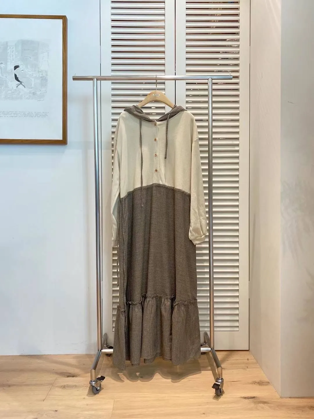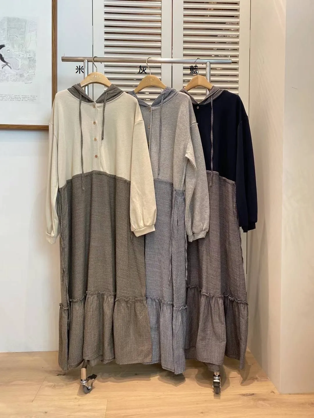 PC672設計款拼接連帽洋裝 米 灰 藍 官網價$1620 線上價$1590