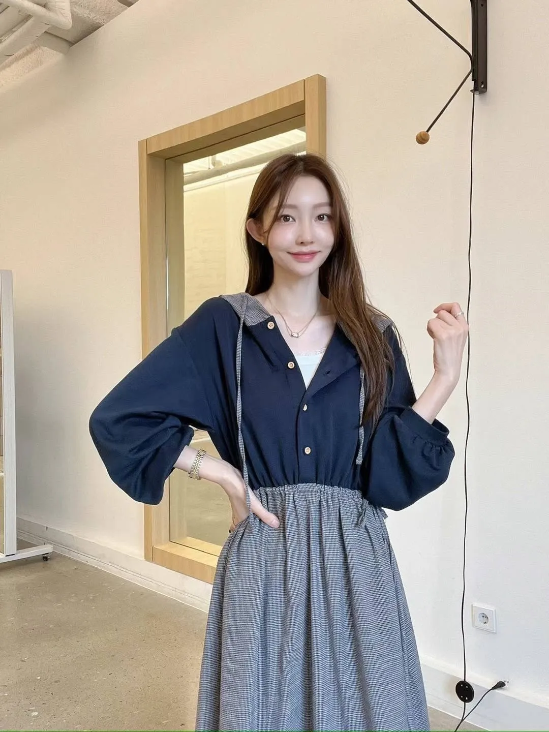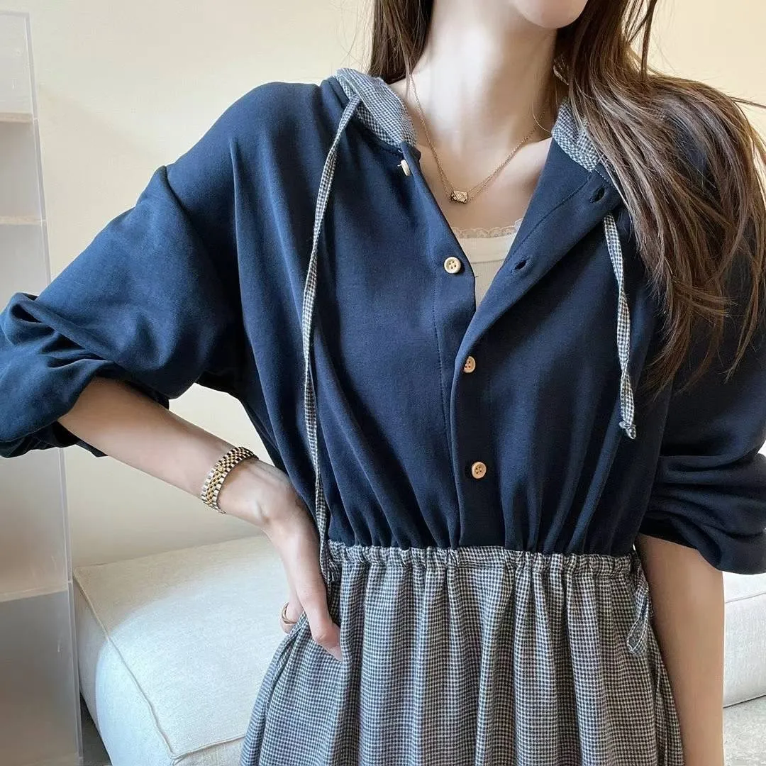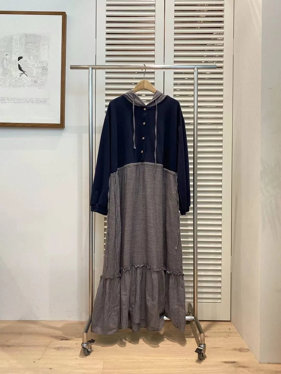 PC672設計款拼接連帽洋裝 米 灰 藍 官網價$1620 線上價$1590