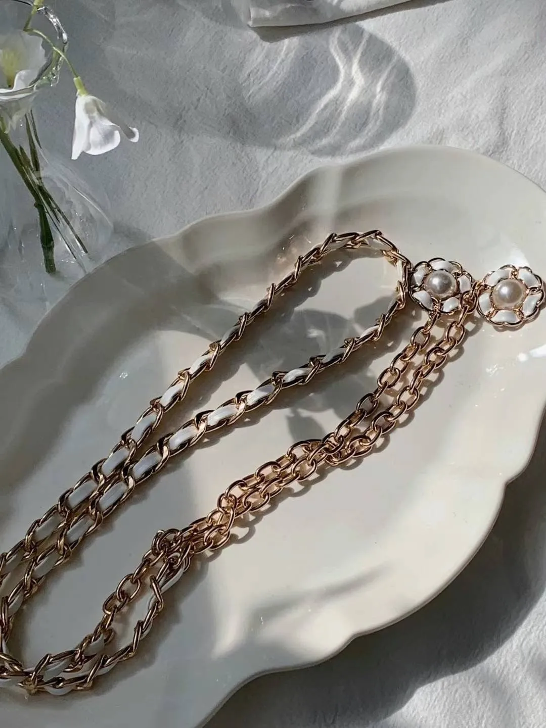 金屬皮革腰帶 珍珠花朵 勾釦繫腰