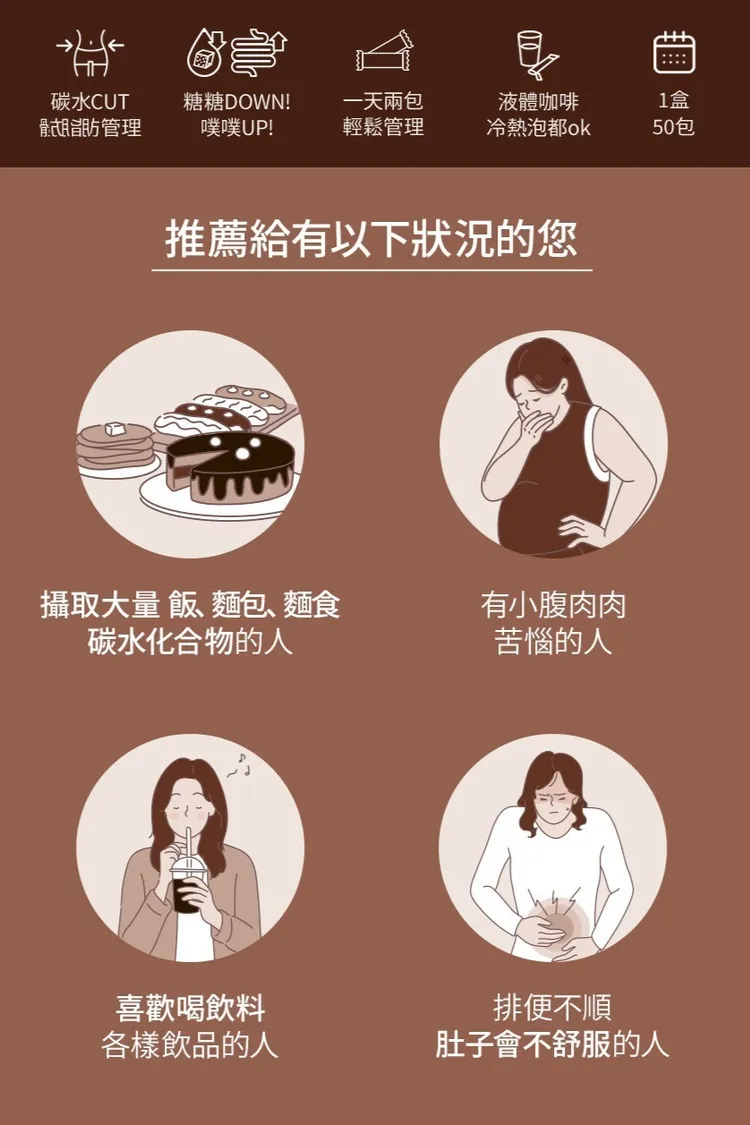 使用效果 : 控制碳水化合物+管理脂肪,控制食慾以達到控制輕盈體態