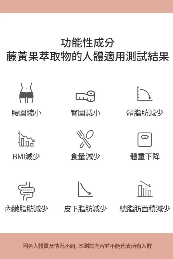 體驗效果 : 有效纖體、控制體脂肪、改善BMI和內臟脂肪,改善膽固醇